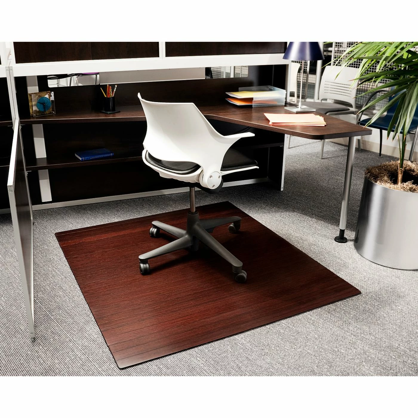 Smart and sophisticated, the Dark Cherry 48 x 52 Bamboo Roll-Up Office Chair Mat – 1/4 Inch Thick is an easy way to add comfort and sophistication to your workspace. Made of durable 100 percent Anji Mountain bamboo, this office chair mat features a dark cherry finish that enhances the appealing grains of the bamboo. Premium felt backing provides extra cushioning for your chair, as well as protecting the floor surface underneath the mat. When relocating to a new office or rearranging your home office, all you have to do is roll up the mat like a rug and unroll it in its new location. Although this bamboo mat is an excellent way to preserve your floor while adding comfort and style to your office furniture, it’s not recommended for chairs with metal casters.
