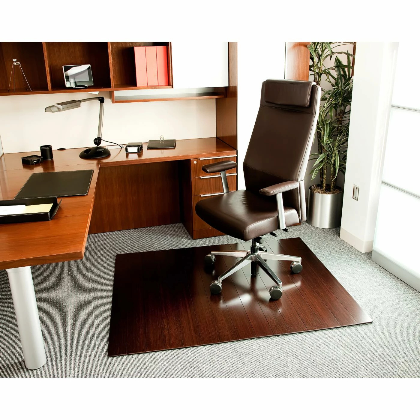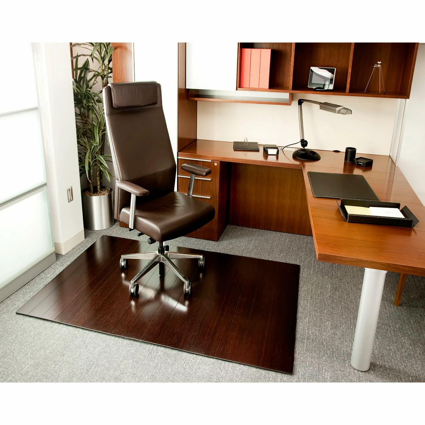 Add a touch of sophistication with the Anji Mountain Deluxe Bamboo Roll-Up Chair Mat – Dark Cherry. This machine-made rug is an ecologically friendly alternative to the plain vinyl chair mat. Rubber backing provides cushioning and protects the floor. Rolls up for easy transportation. Spot clean. 5 mm. thick.