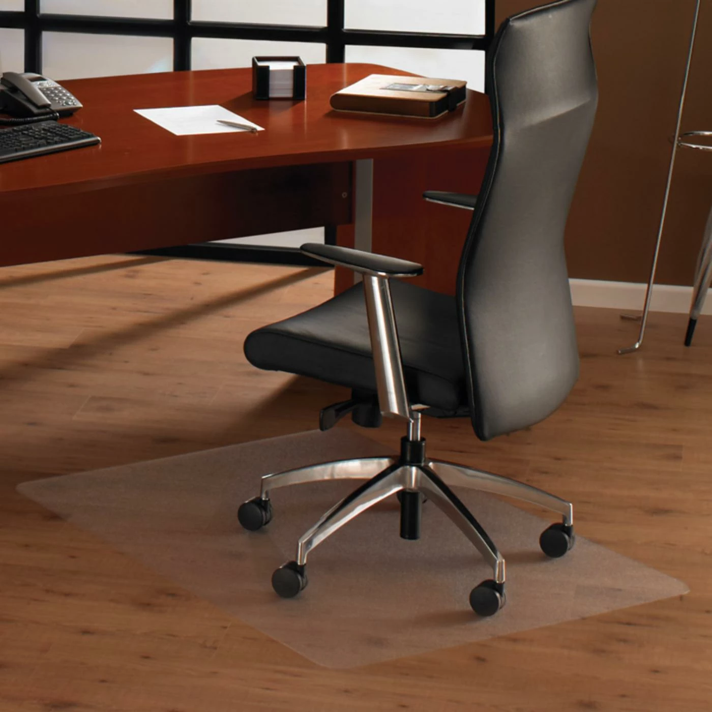 Ideal for maintaining all areas of the home and workplace, the Floortex Cleartex Polycarbonate Ultimat Chair Mat boasts a transparent finish that allows the natural beauty of wood flooring or a carpet design to show through, while shielding the covered surface from castor damage or wear and tear. Manufactured from clear original Floortex polycarbonate, this 100% recyclable mat will not crack, curl, discolor, or smell and is one of the toughest and most durable floor protection mats available today. Available in rectangular, square, contoured, and triangular shapes, with or without a front lipped area for under desk protection, it comes in a selection of floor surface options with smooth back for hard floors and gripper back to hold mat in place without damaging carpet. So whether you have hard wood floors, medium pile carpets (12mm or less), or plush pile carpets (over 12mm), you will surely find the right mat to go with it. Limited lifetime manufacturer warranty.