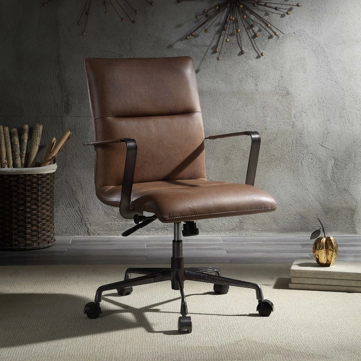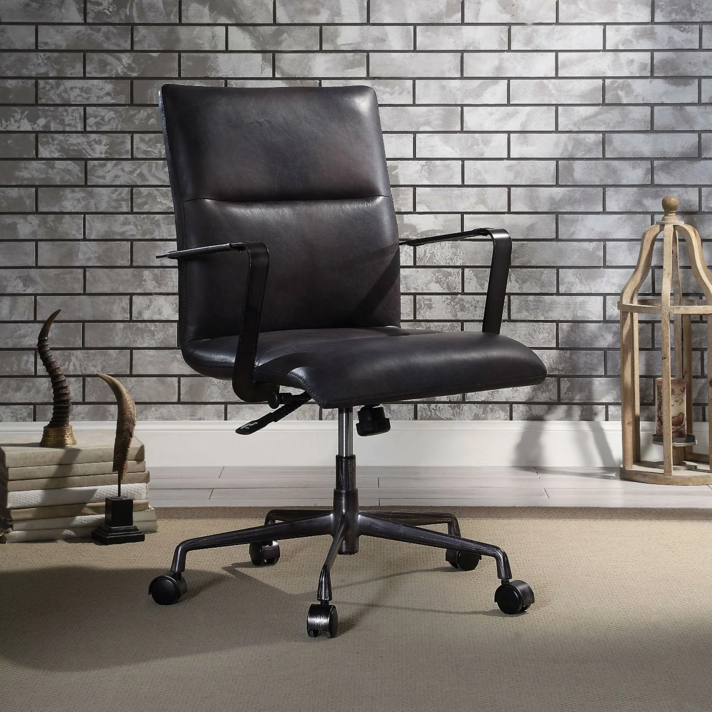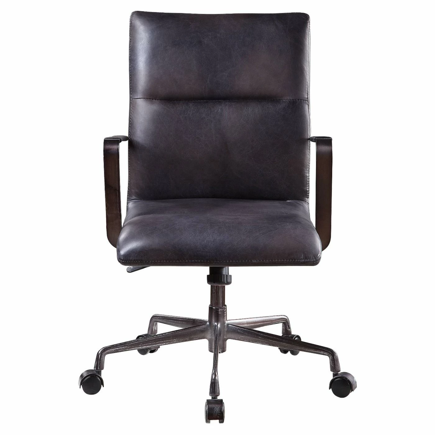 Enjoy the simple and classic lines of the Acme Furniture Indra Adjustable Executive Office Chair in your home or office. A sleek horizontal tufted back offers the comfort that pairs well with the thick cushioned seat. Five hooded casters support this refined design and glide smoothly over low pile carpet or flooring. The Top Grain Leather in choice of color allows breathability for long periods of sitting, while the convenient side lever allows you to adjust the seat height for optimal comfort.