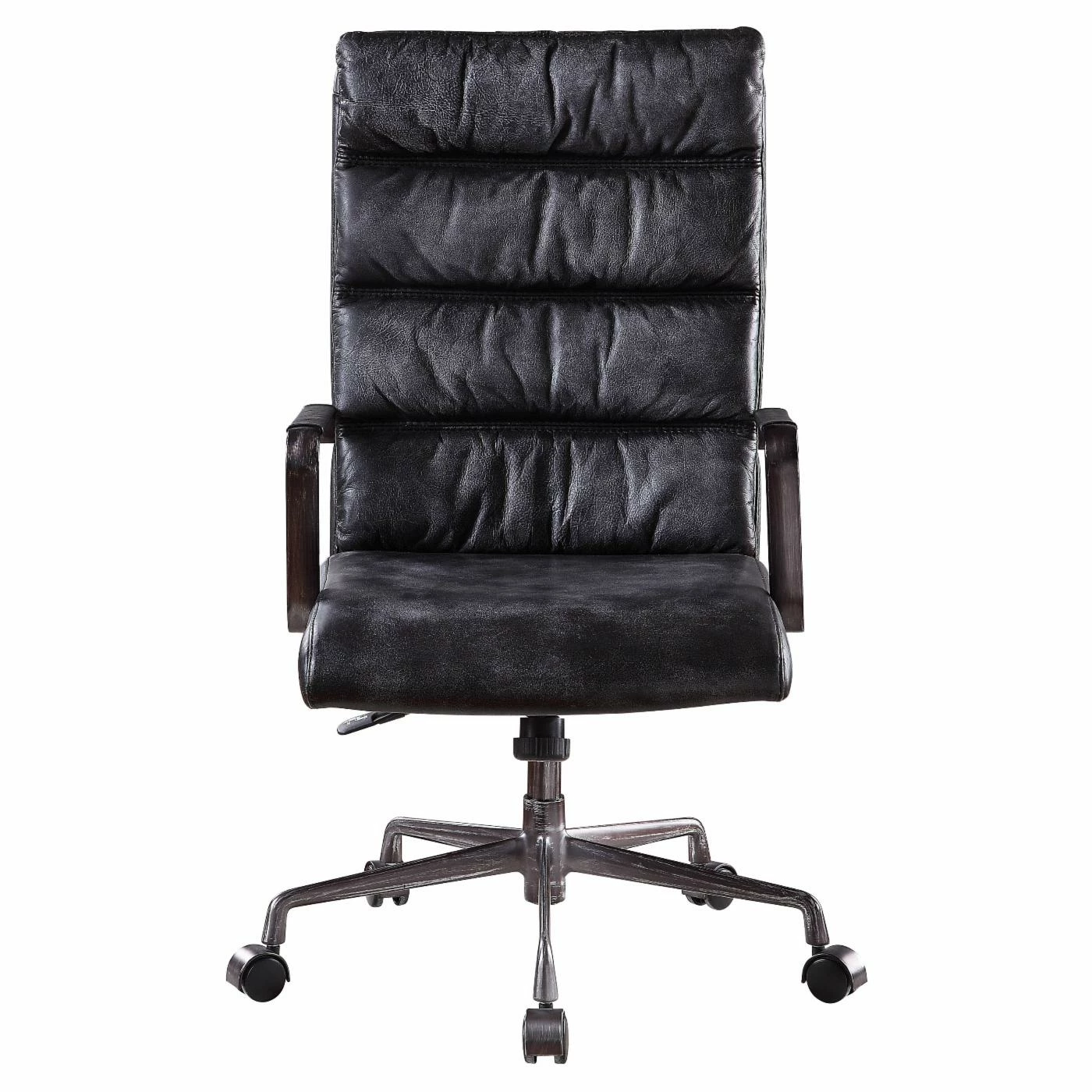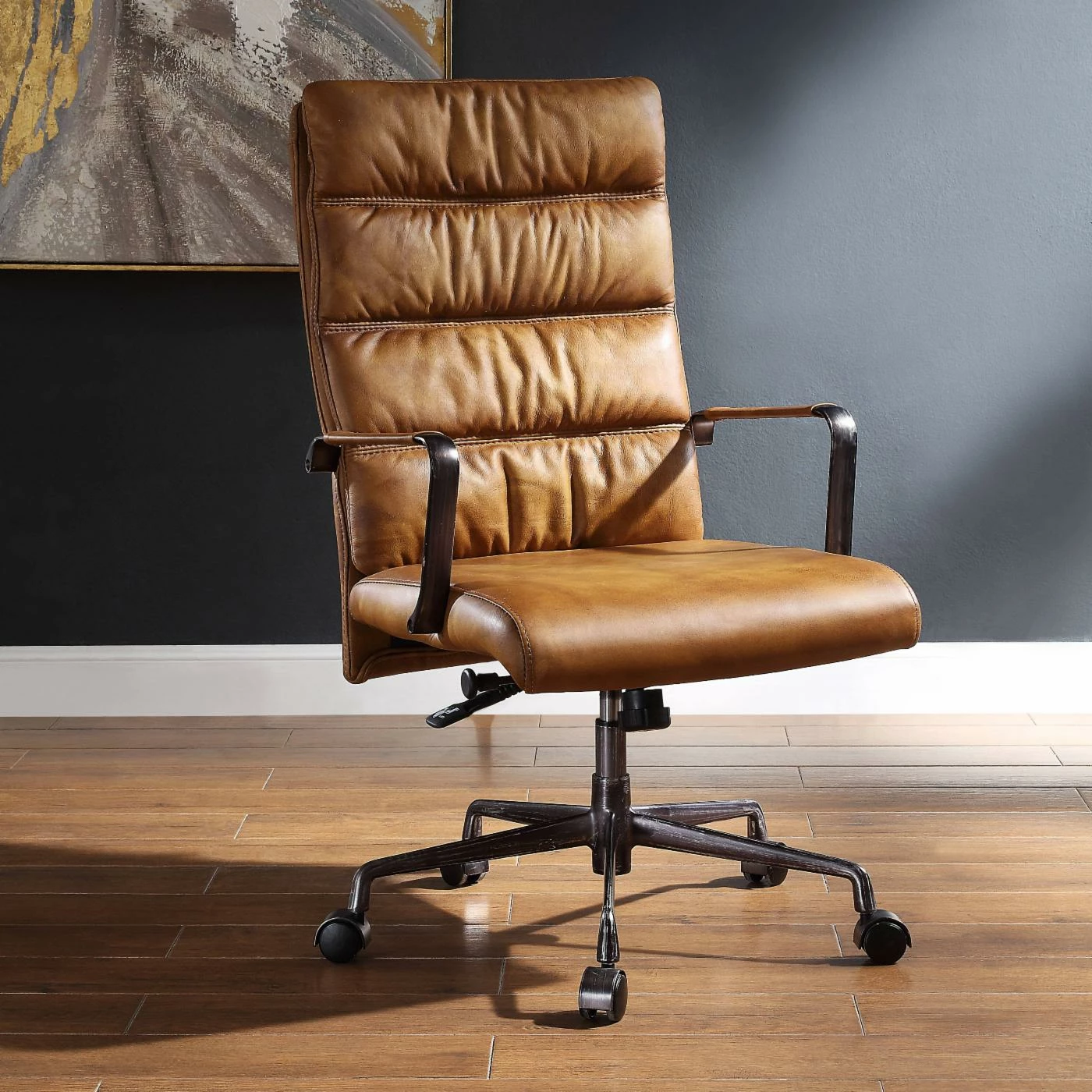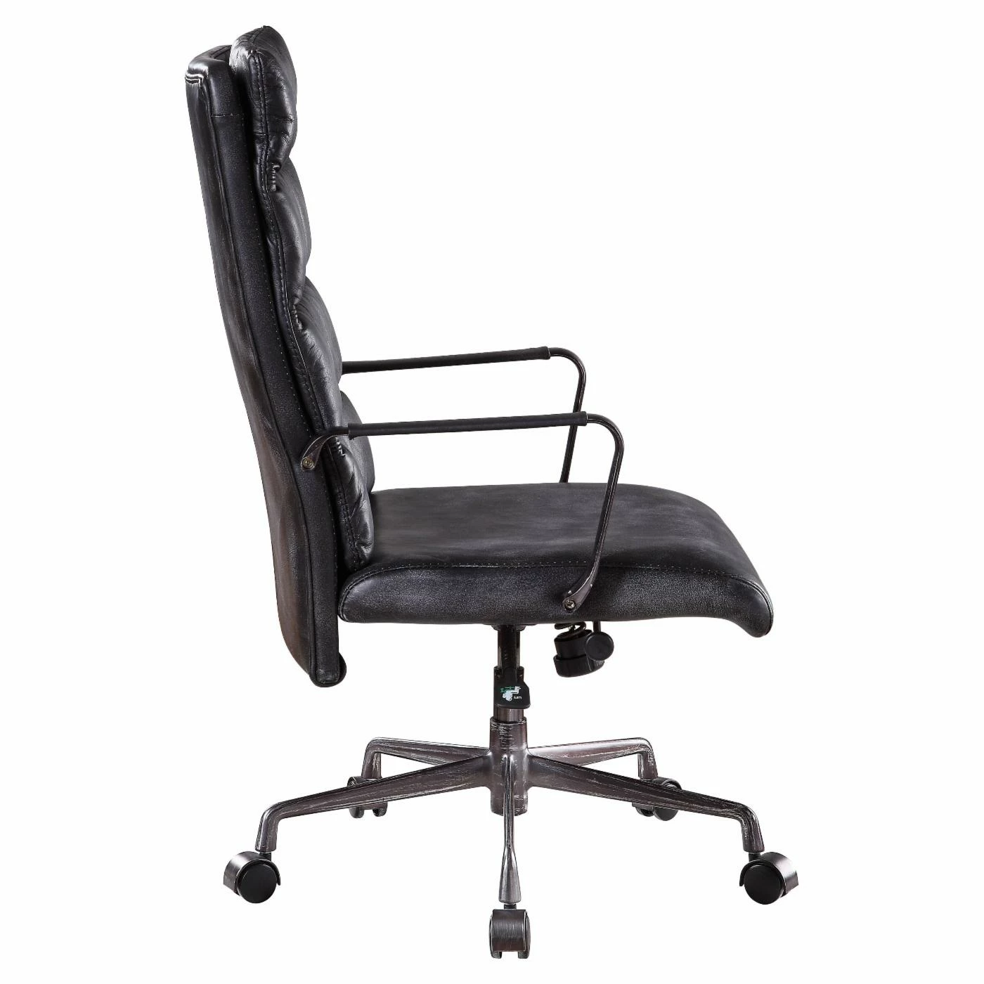 Enjoy the simple and classic lines of the Acme Furniture Jairo Adjustable Executive Office Chair in your home or office. A sleek horizontal tufted back offers the comfort that pairs well with the thick cushioned seat. Five hooded casters support this refined design and glide smoothly over low pile carpet or flooring. The top grain leather in choice of color allows breathability for long periods of sitting, while the convenient side lever allows you to adjust the seat height for optimal comfort.