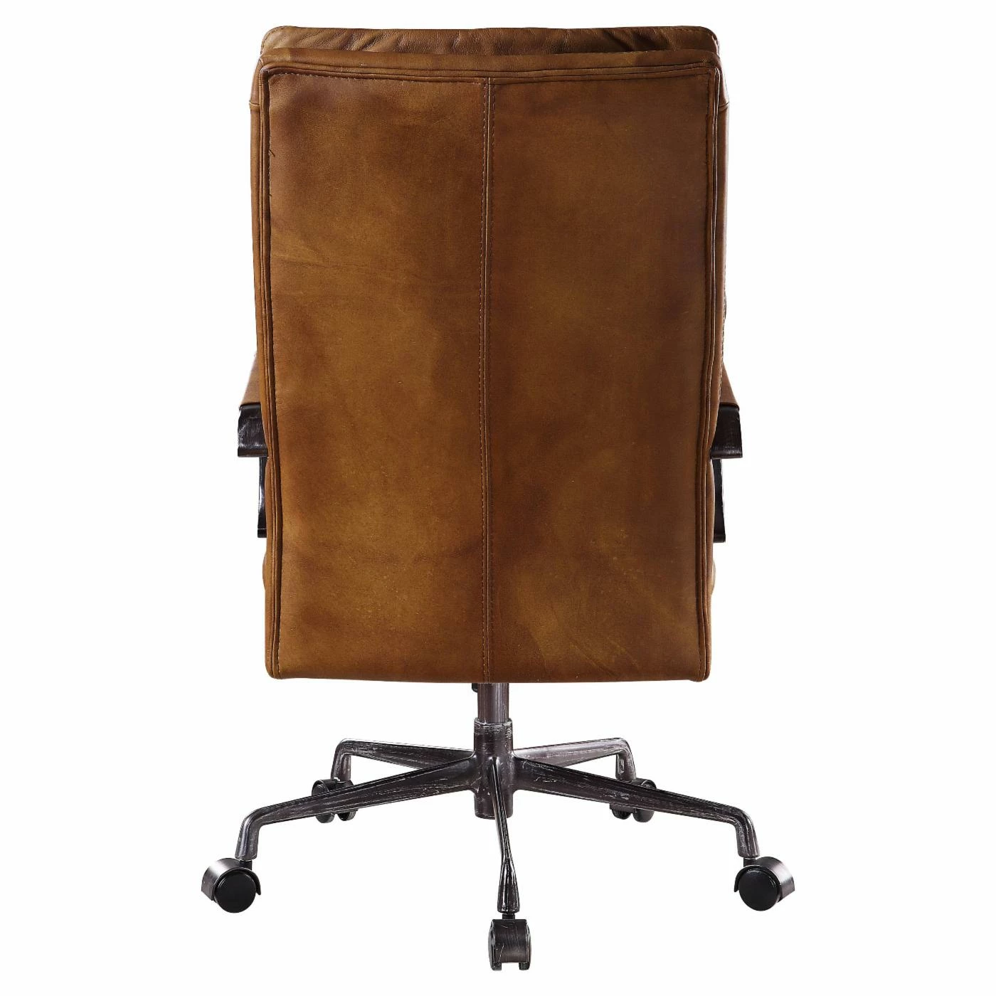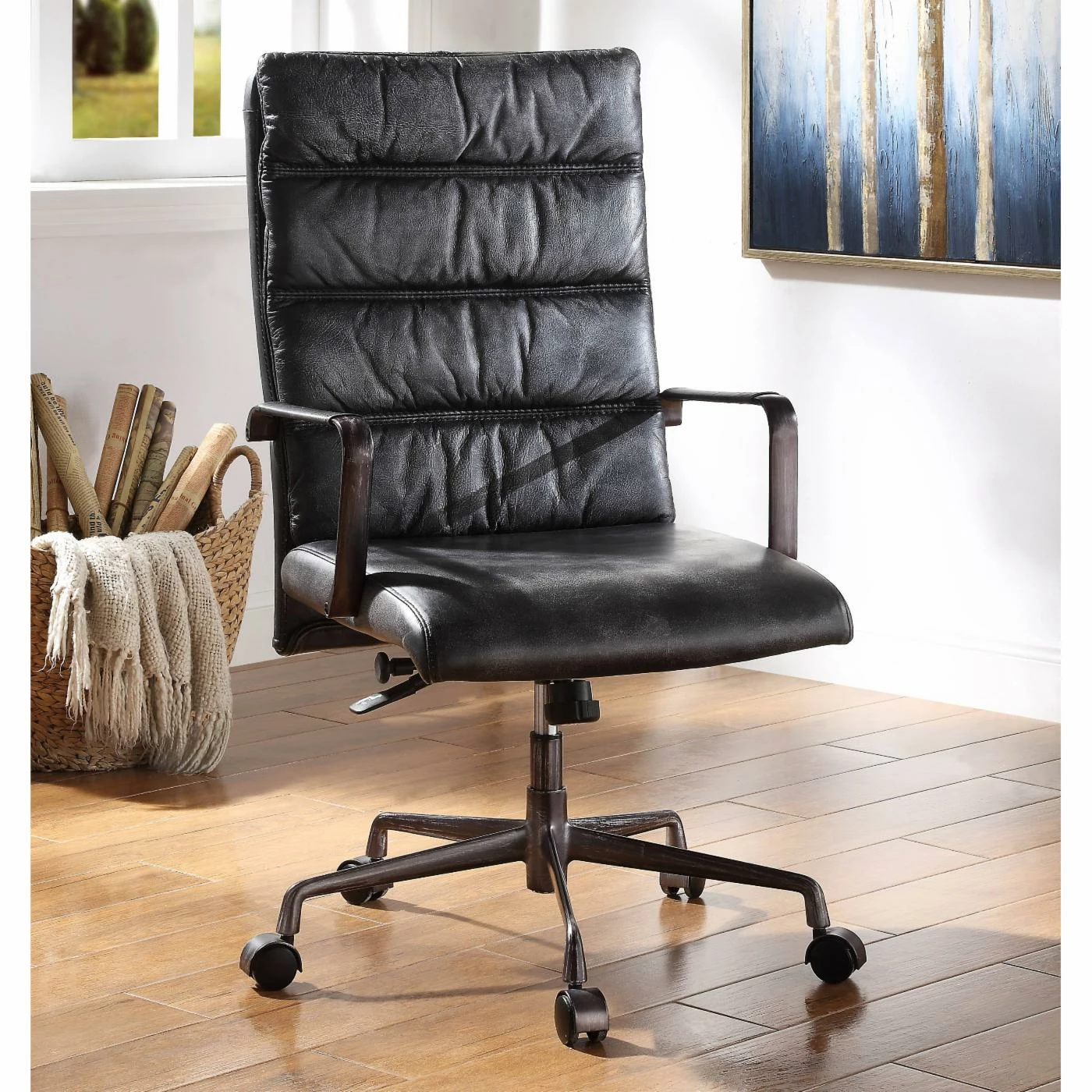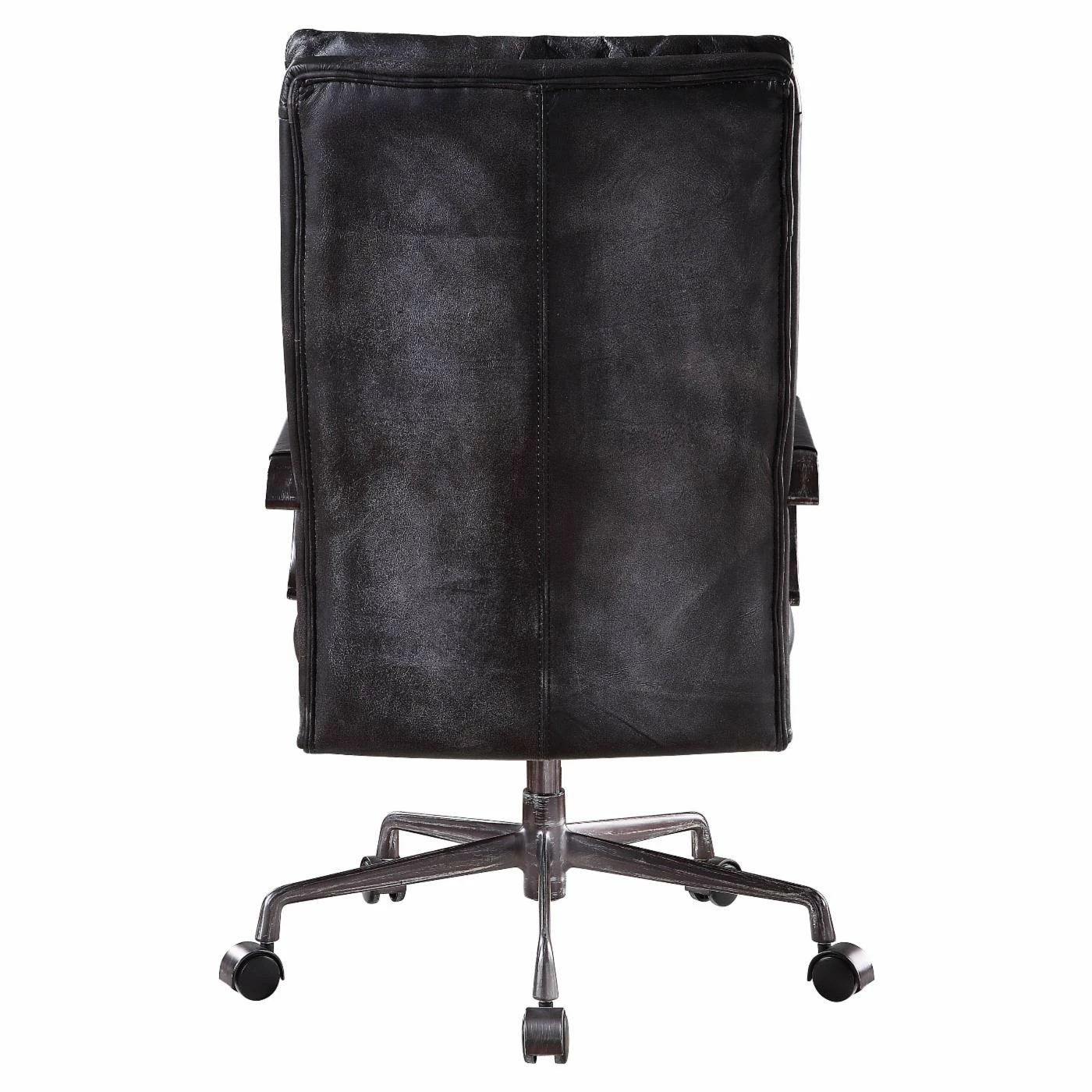 Enjoy the simple and classic lines of the Acme Furniture Jairo Adjustable Executive Office Chair in your home or office. A sleek horizontal tufted back offers the comfort that pairs well with the thick cushioned seat. Five hooded casters support this refined design and glide smoothly over low pile carpet or flooring. The top grain leather in choice of color allows breathability for long periods of sitting, while the convenient side lever allows you to adjust the seat height for optimal comfort.