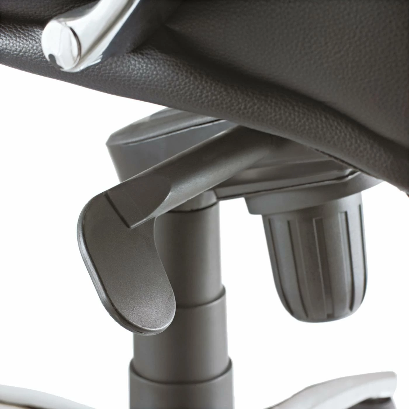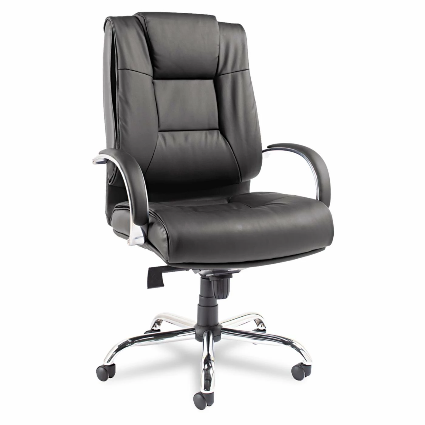 Designed specifically for tall men and women, the Alera Ravino Big & Tall Series High-Back Swivel/Tilt Leather Chair – Black has a roomy design that’s big on comfort. Its tall back is tufted and padded to provide optimal support for every part of the spine, and the cushion is pillow-topped for an extra cushy feel. Even the open loop arms are padded. Plated with chrome, the five-star base has a high gloss shine that complements the sleek look of the black leather upholstery.