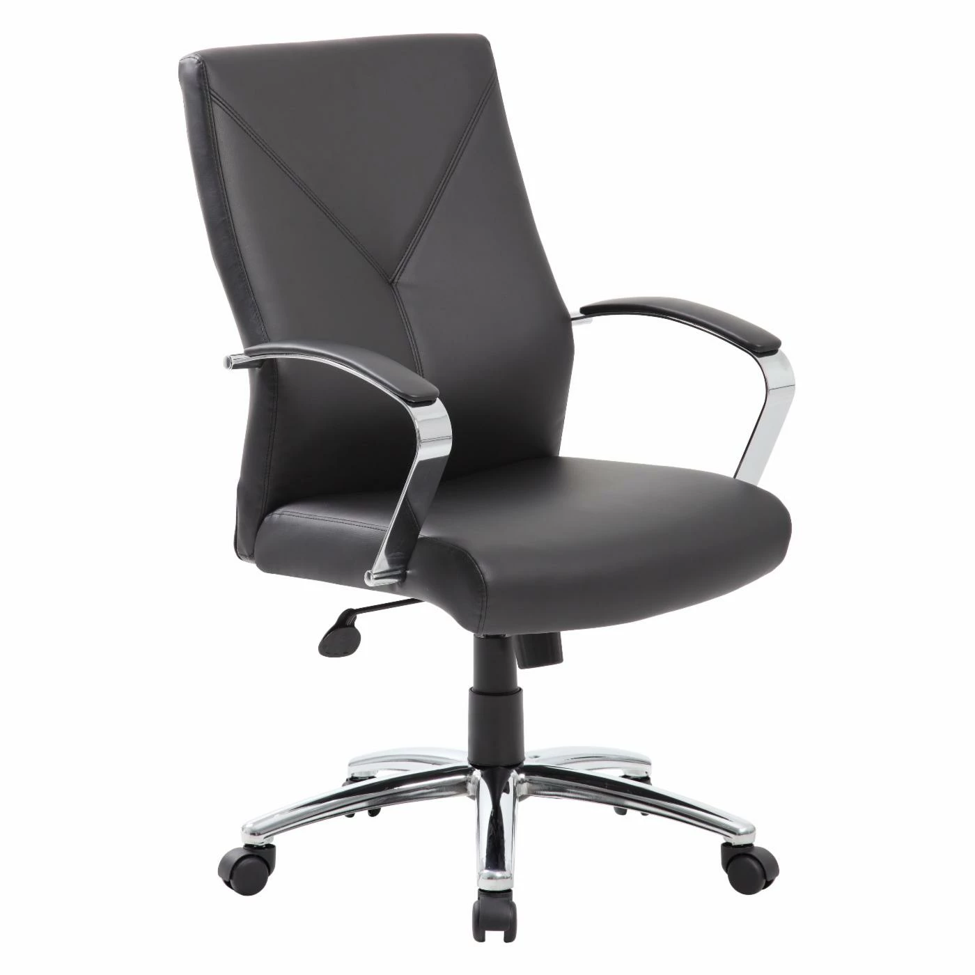 The sleek and contemporary design of the Boss LeatherPlus Executive Chair with Silver Accent is the perfect fit for any modern office. But style isnβt the only thing this chair offers. Upholstered in leather that is infused with polyurethane for added durability and softness, this office chair features chrome plated arms topped with soft padding for additional comfort. The adjustable tilt tension supports your back when you recline, and the tilt lock provides greater stability. The cushioned seat is adjustable for height, and the waterfall seat design lets you sit comfortably while eliminating leg fatigue. The wide base provides added stability, and the hooded double wheel casters allow you to easily move the executive chair when needed. Assembly is required.