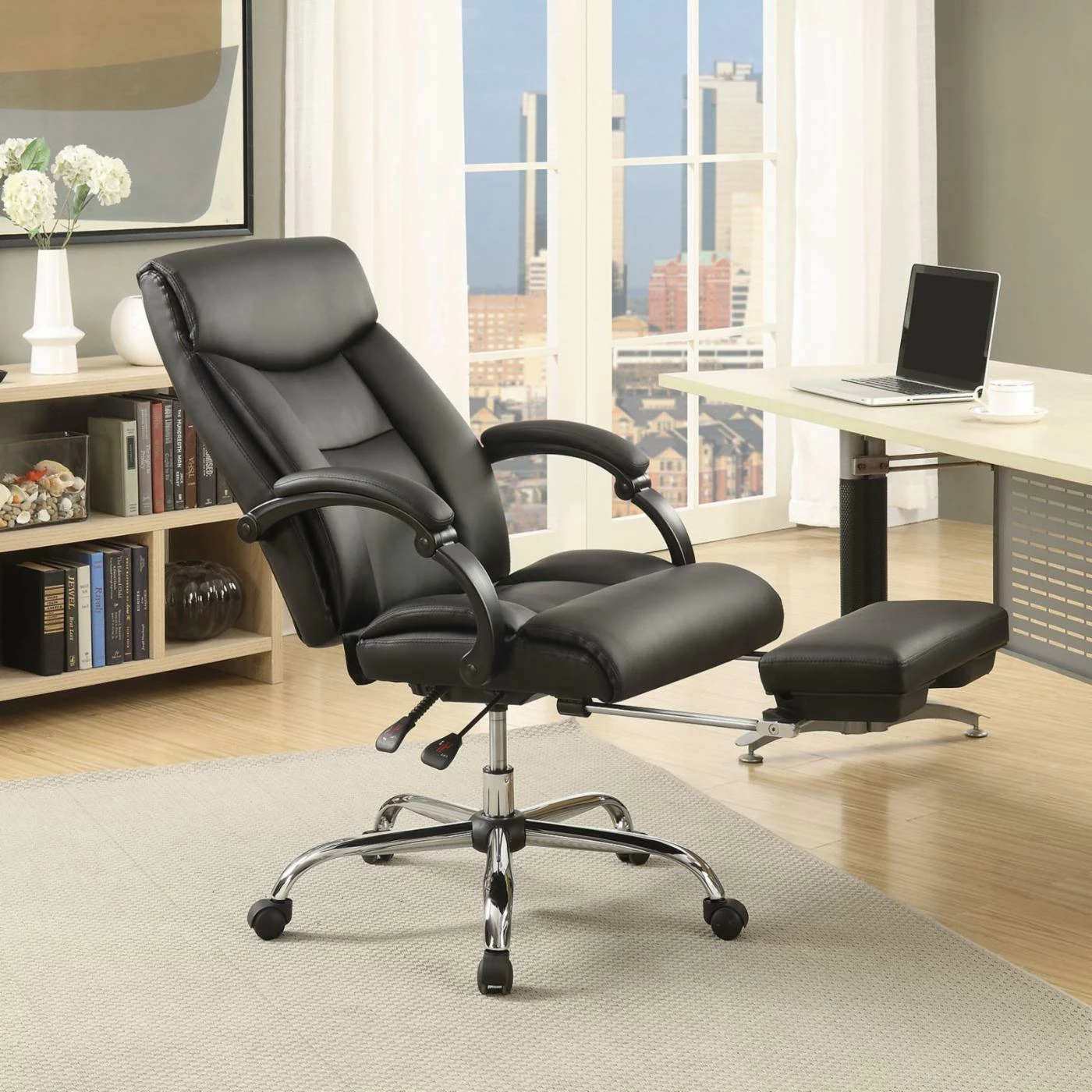 Make every day at the office more relaxing with the Coaster Furniture Executive Chair With Chrome Base. This fully functional chair was designed with comfort in mind. The fully reclining office chair even boasts a footrest, allowing you to take a fifteen-minute power nap before your next meeting.