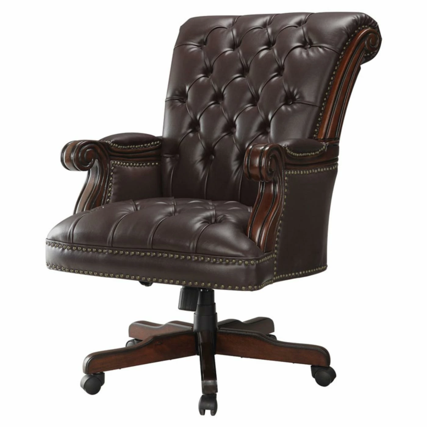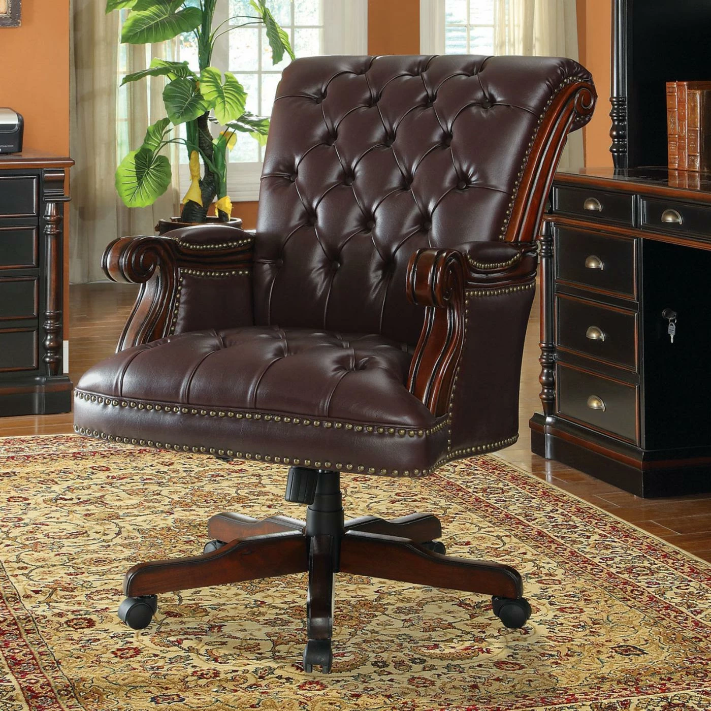 Every executive office deserves a Coaster Furniture Faux Leather Executive Chair – Dark Brown. This elegant and masculine office chair boasts button tufting and nailhead trim details. The brown leatherette fabric is complemented by a rich brown finish.