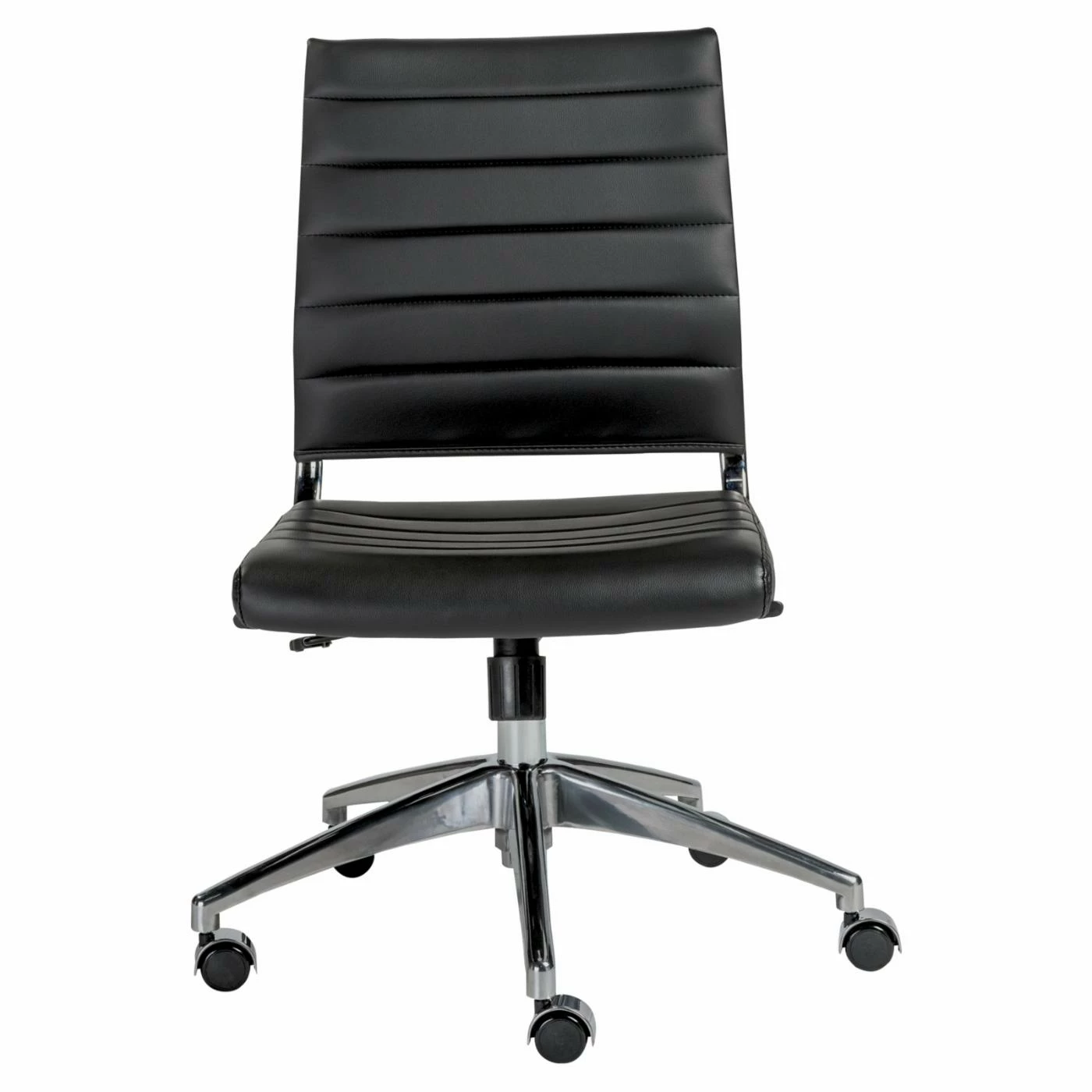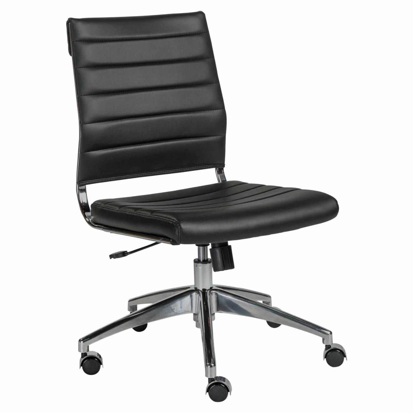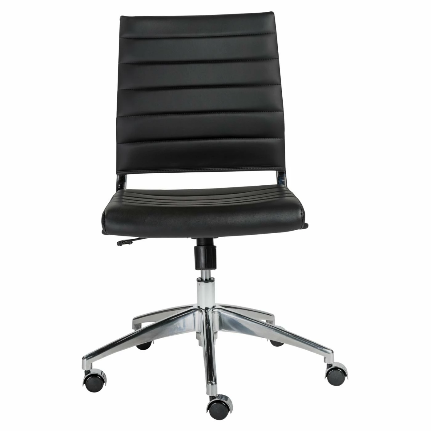 Perfect for those busy days at work, the Euro Style Axel Low Back Office Chair is a sleek and comfortable choice for getting things done. It offers a soft and comfortable ribbed black leatherette back, wrapped over a plush foam seat for maximum comfort. Its armless design gives you easy movement to get tasks done. The swivel feature on this seat allows you to move about, so you can multitask easily at your workstation. A polished aluminum base is the final modern touch on this sleek chair.