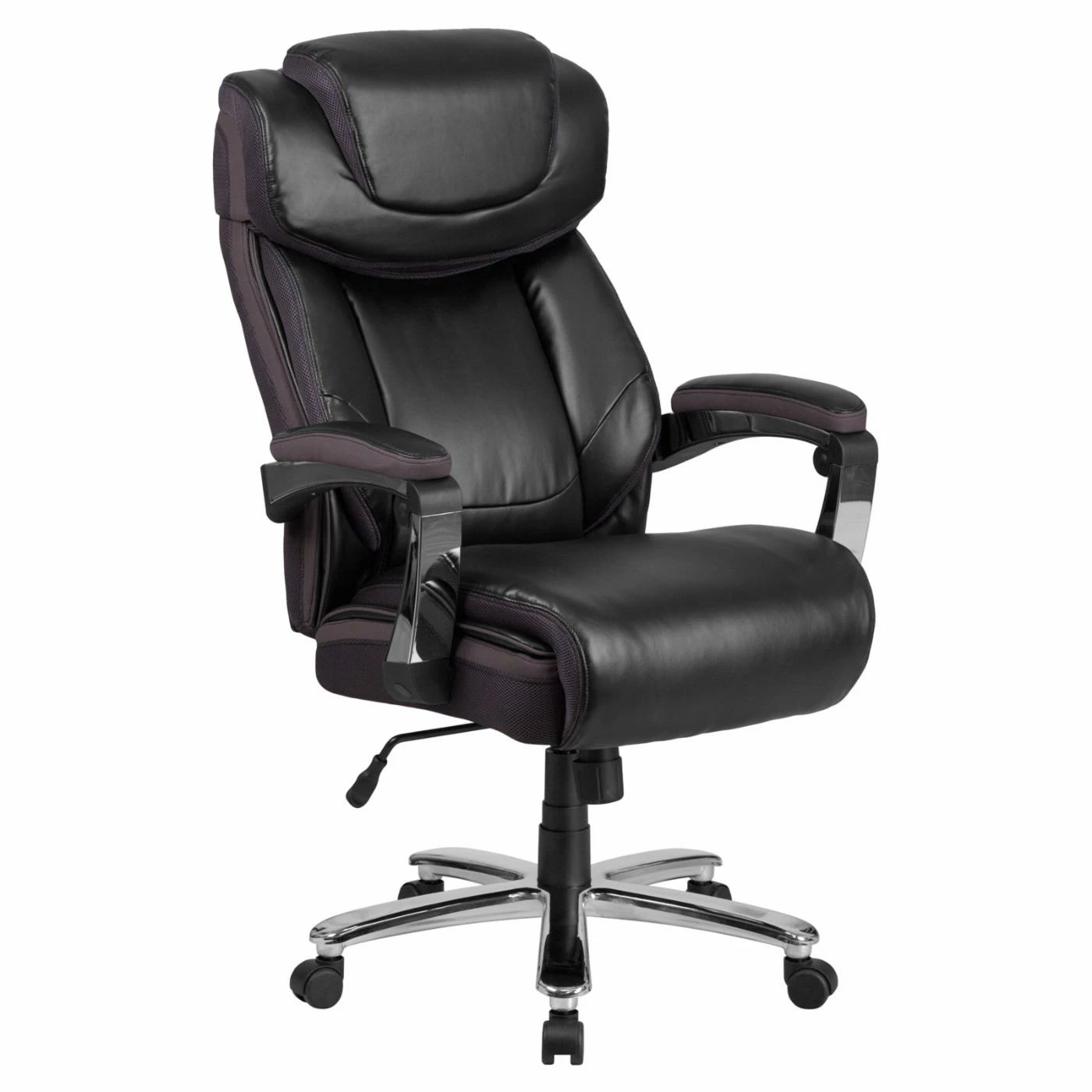 Maximize the comfort of your office with the Flash Furniture HERCULES Series 500 lb. Capacity Big & Tall Black Leather Executive Swivel Office Chair with Height Adjustable Headrest. This luxuriously comfortable chair features a contoured back leading up to a plush headrest. The seat features a 6-inch foam cushion to support you throughout the day. A chrome base and padded arms complete the design.