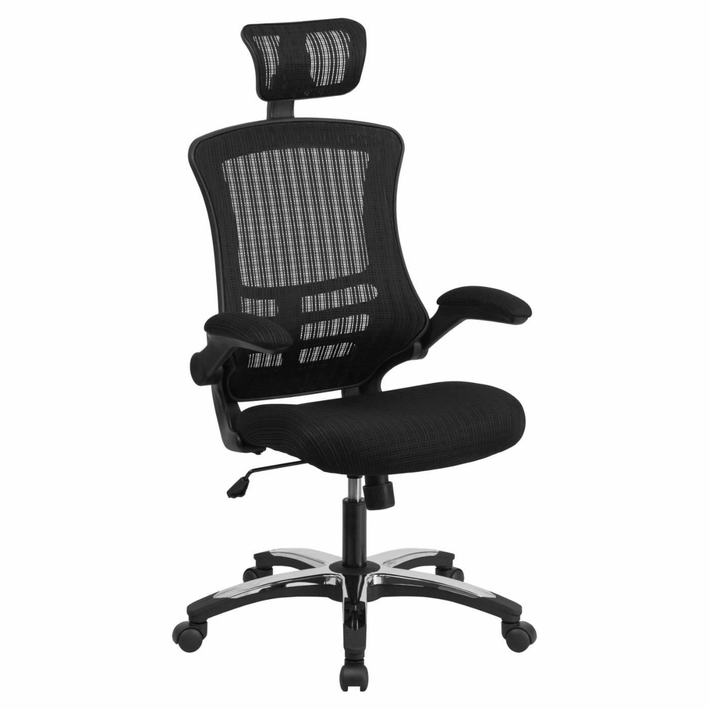 Make working at your desk a comfortable experience by pairing it with the Flash Furniture High Back Black Mesh Executive Swivel Office Chair with Flip-Up Arms and Chrome-Nylon Designer Base. This mesh office chair features a contoured back with a built-in headrest and lumbar support. Chrome accents on the nylon base add a sleek look to this supportive swivel chair.