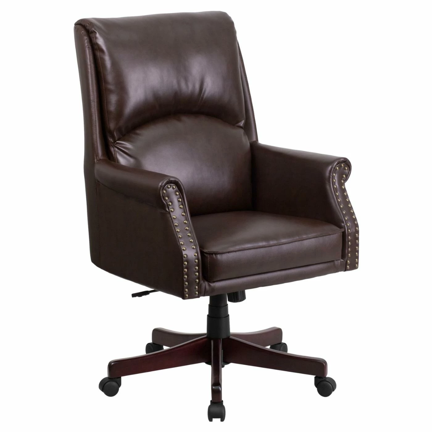 Dress up your executive office with the Flash Furniture High Back Pillow Back Brown Leather Executive Swivel Office Chair. This chair combines everything you love about your desk chair and favorite armchair in one stylish unit. The rolled arms are traced with nailhead trim accents while a lumbar knob allows you to fully adjust your level of support.