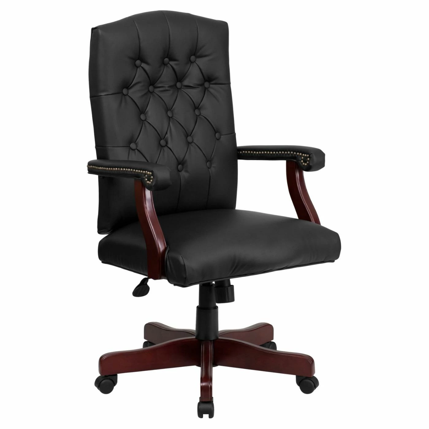 Furnish your executive office with the Flash Furniture Martha Washington Black Leather Executive Swivel Office Chair. This luxe chair features a tufted, contoured back leading down to a padded seat. Rich mahogany accents trim this traditional swivel chair.