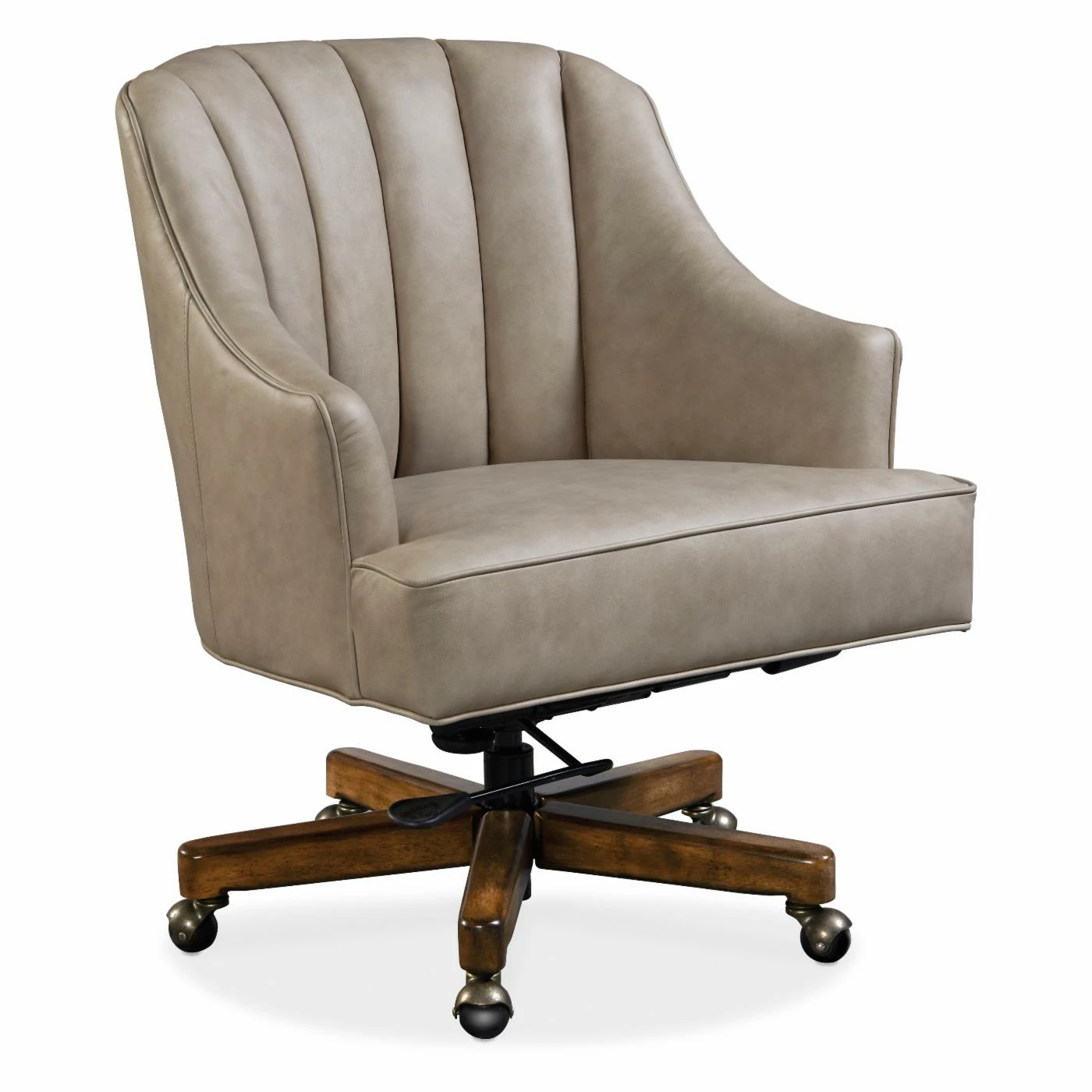 The Hooker Furniture Haider Executive Chair channels a vintage style of office furniture while ensuring that you get all the best of modern comfort and adjustability. This comfortable chair features a curved backrest and thick seat cushion, both covered in high-quality leather upholstery. Under the rich exterior is a sturdy wooden frame with dense foam padding. Vintage-style swiveling casters offer easy motion on most surfaces. The pneumatic height-adjustment system makes it easy to get the perfect height at any desk.