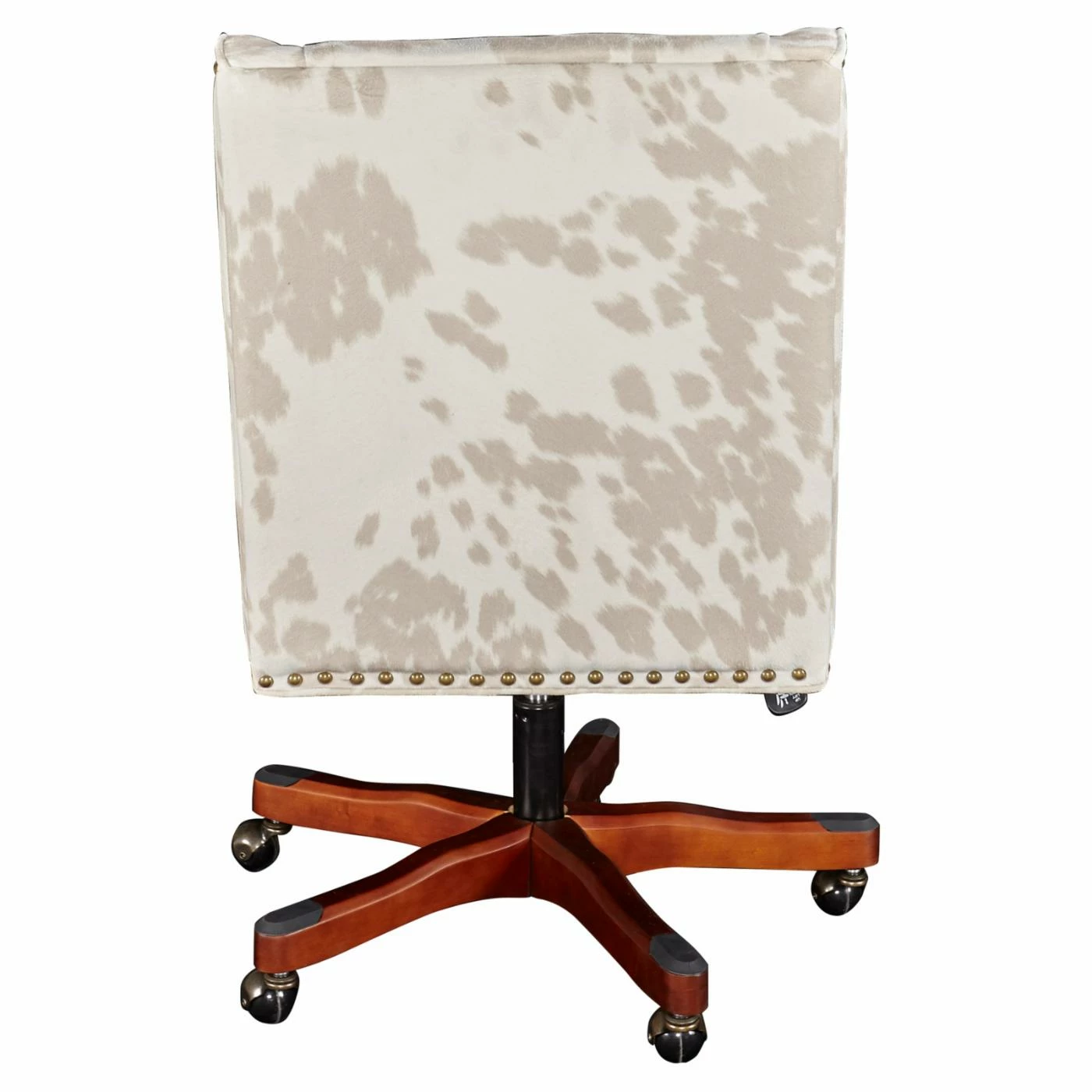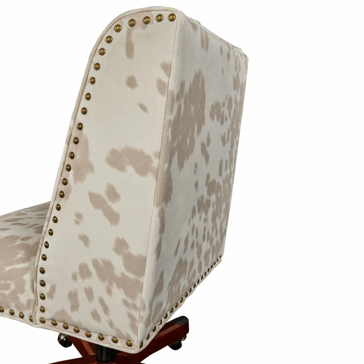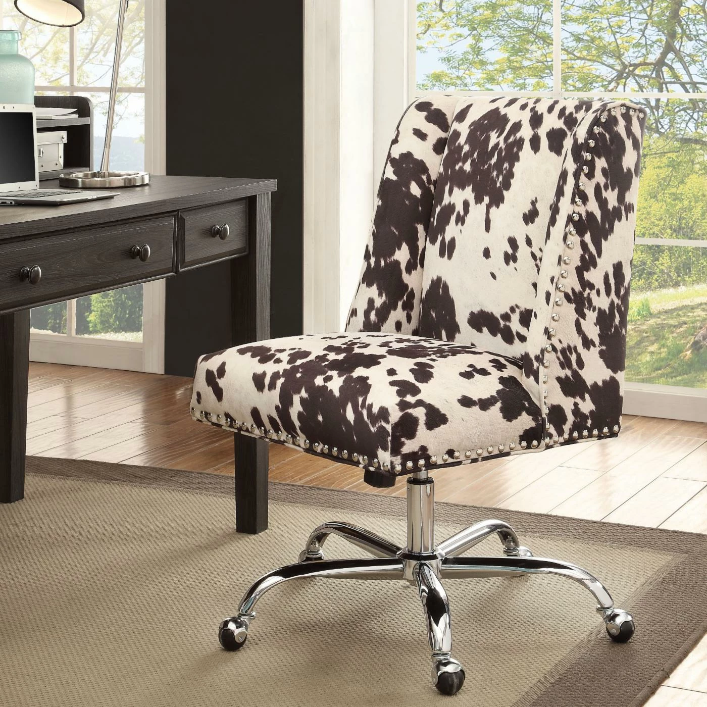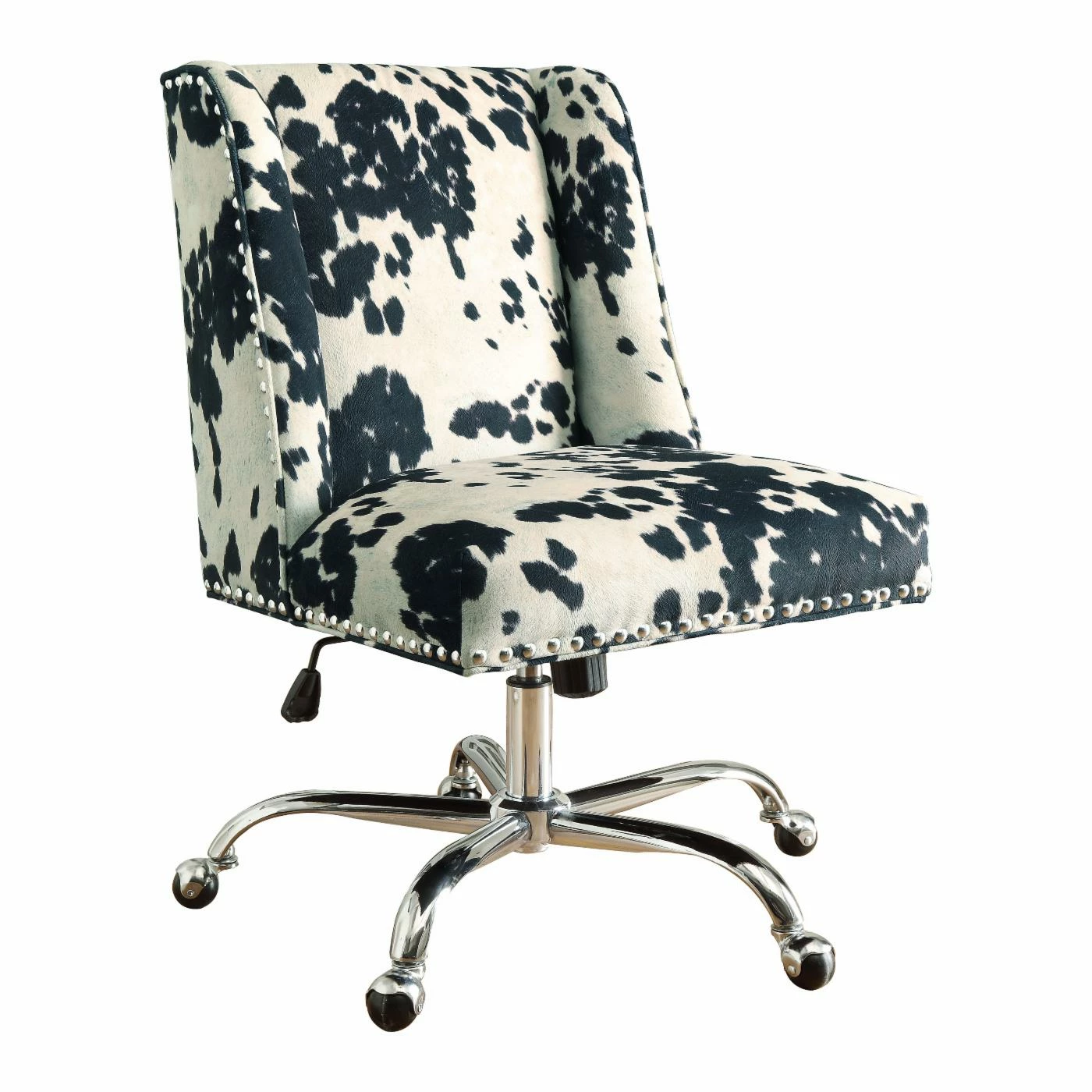 Get mooooving with the Linon Draper Executive Office Chair in your work space or home office. This stylish, off-kilter office chair features cow print microber upholstery in 100% polyester in your choice of color. Choose a chrome or walnut base. It features adjustable height as well as casters for easy movement. This chair is adorned with silver nailhead trim and features a plush chair back and seat for added comfort.ย