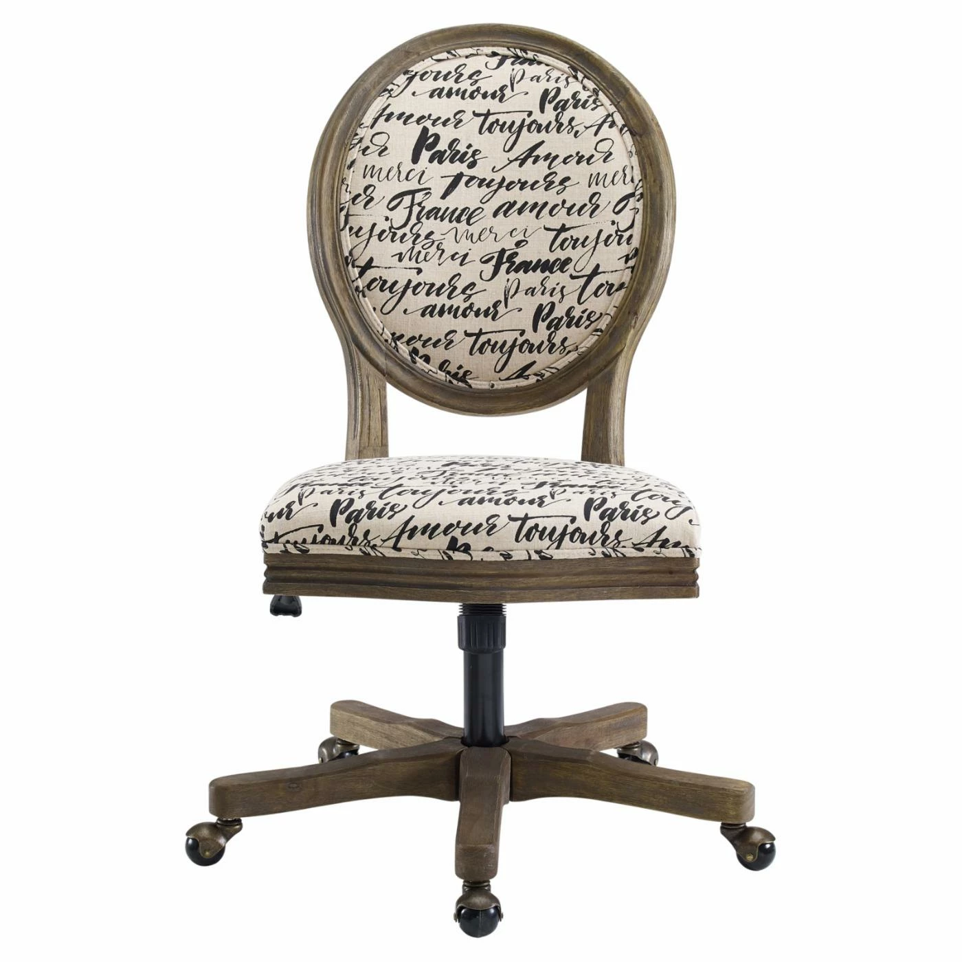 The Linon Erin Paris Oval Back Adjustable Height Office Task Chair will add French-inspired charm to your home office. This office task chair is durably designed from rubberwood and metal. It boasts chic Parisian script fabric upholstery with supportive foam cushioning. Its gas lift adjustable height functionality allows sitters to customize their seat to their preference. This chair is perched on five casters and also comes with tilt control and swivel.