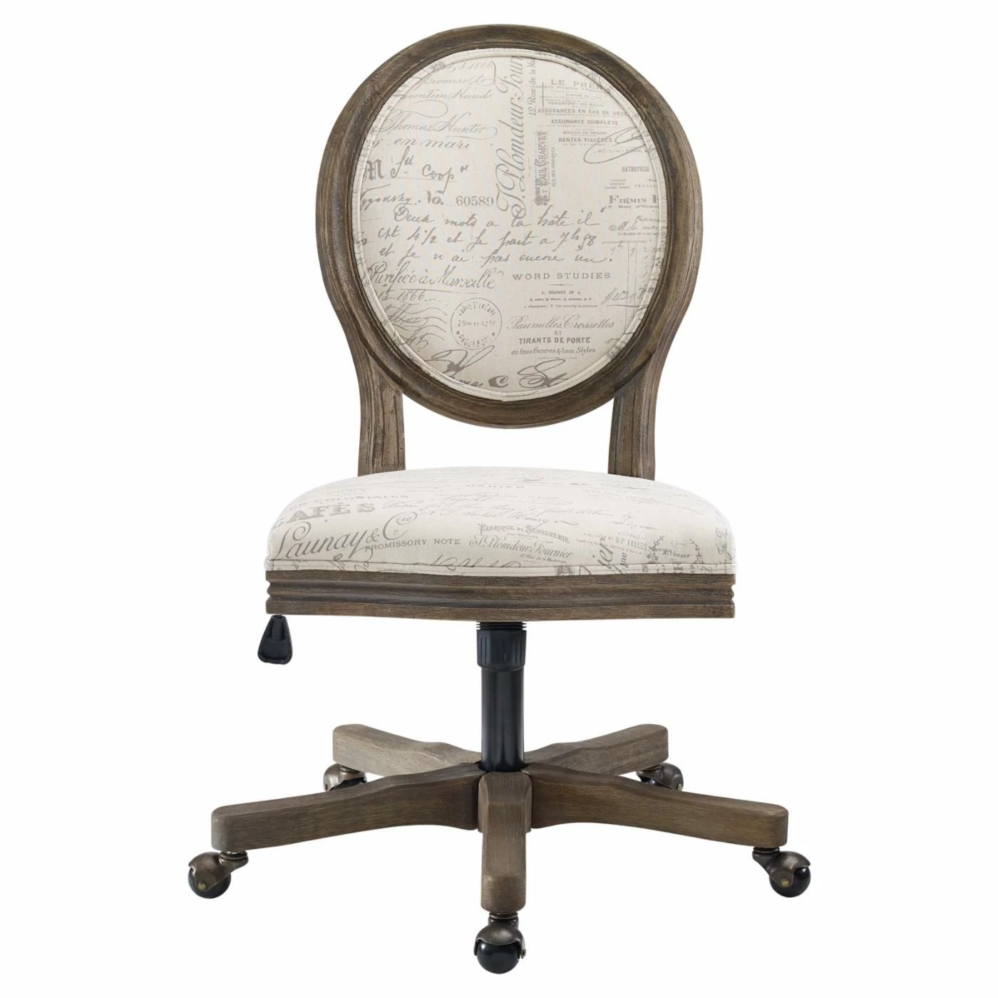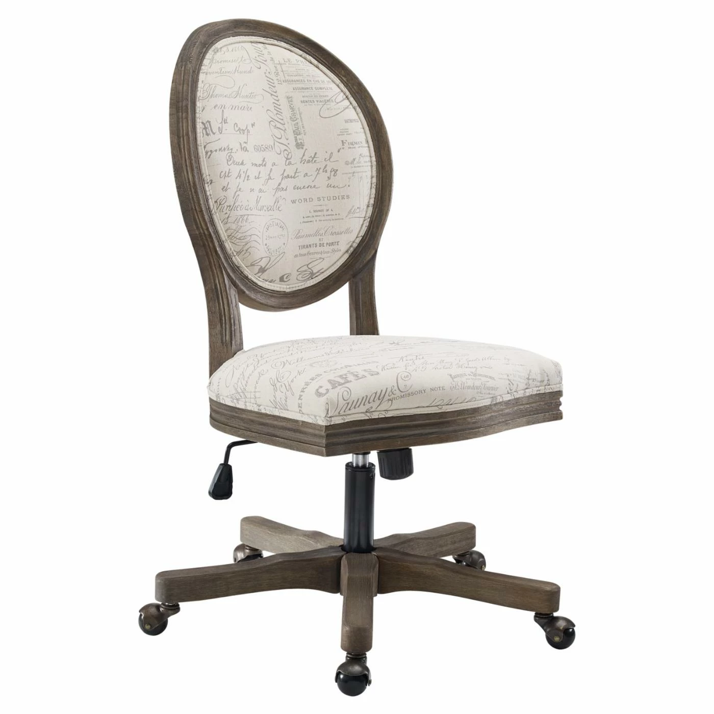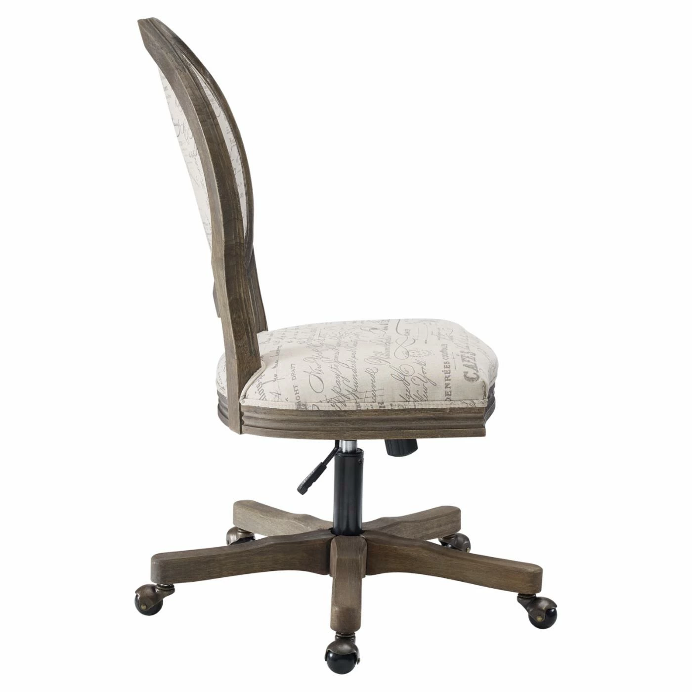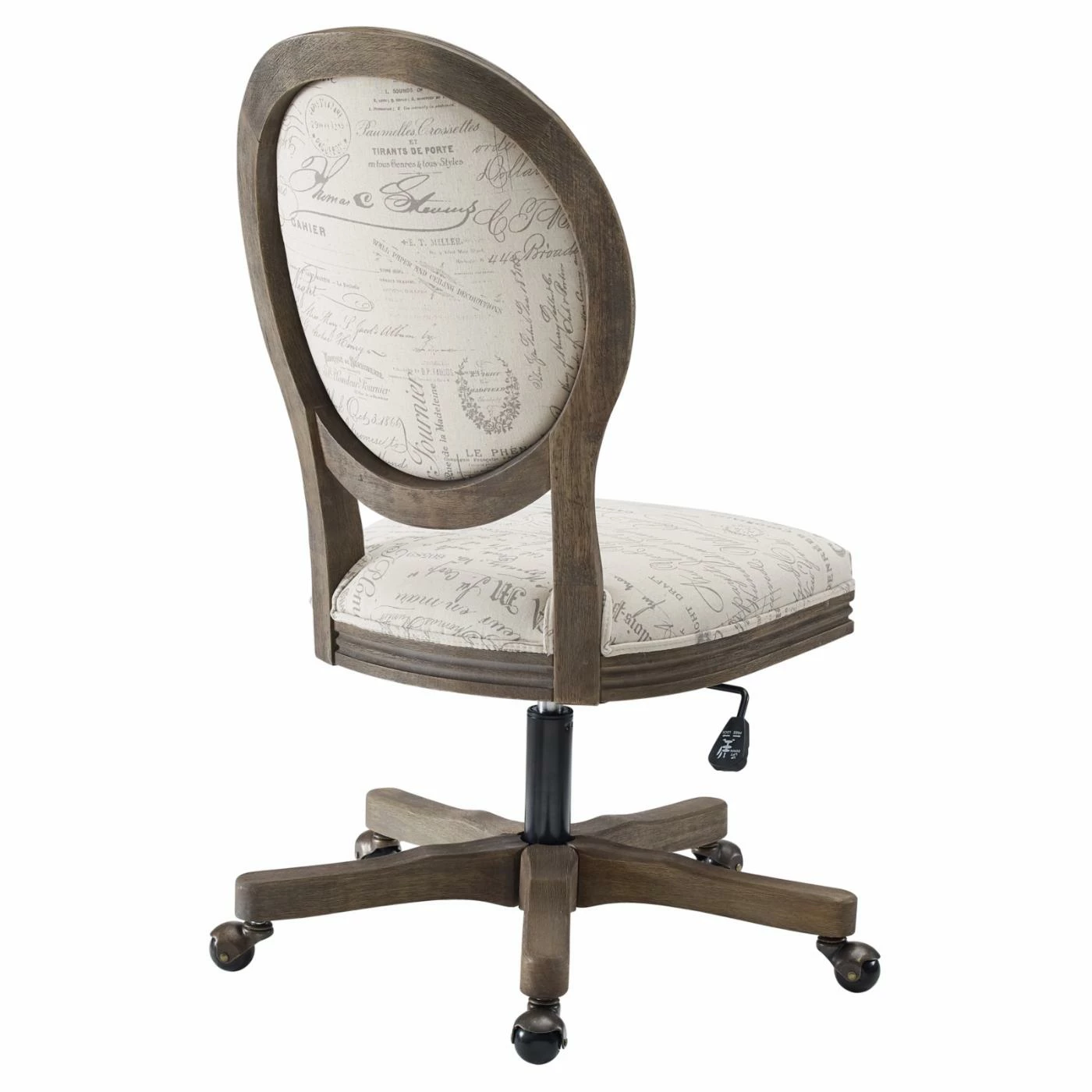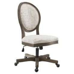 The Linon Erin Script Oval Back Adjustable Height Office Task Chair will elevate your dΓ©cor with its trendy script upholstery. This office task chair features sturdy metal and rubberwood construction. If features a foam-cushioned seat topped with fabric upholstery. Its brown and beige hues ensure pairing ease with a myriad of decorative looks. This chair is designed for residential use and requires some assembly before use.