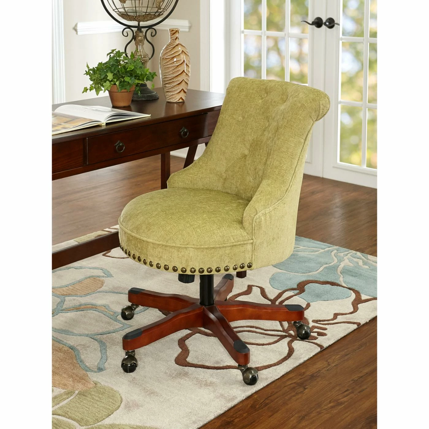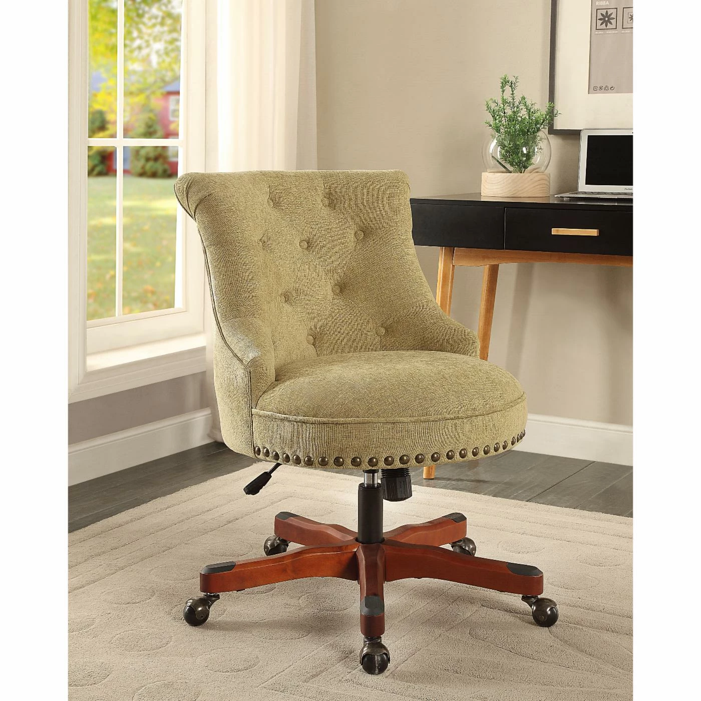Sit and work in style with the Linon Sinclair Executive Office Chair. This regal piece features a plush, tufted design with 100% polyester fabric upholstery in your choice of color. The base is made of wood and finished in your choice of color. This piece features an adjustable height and metal casters for easy movement. The button tufted design is offset by nailhead trim finished in antique bronze.