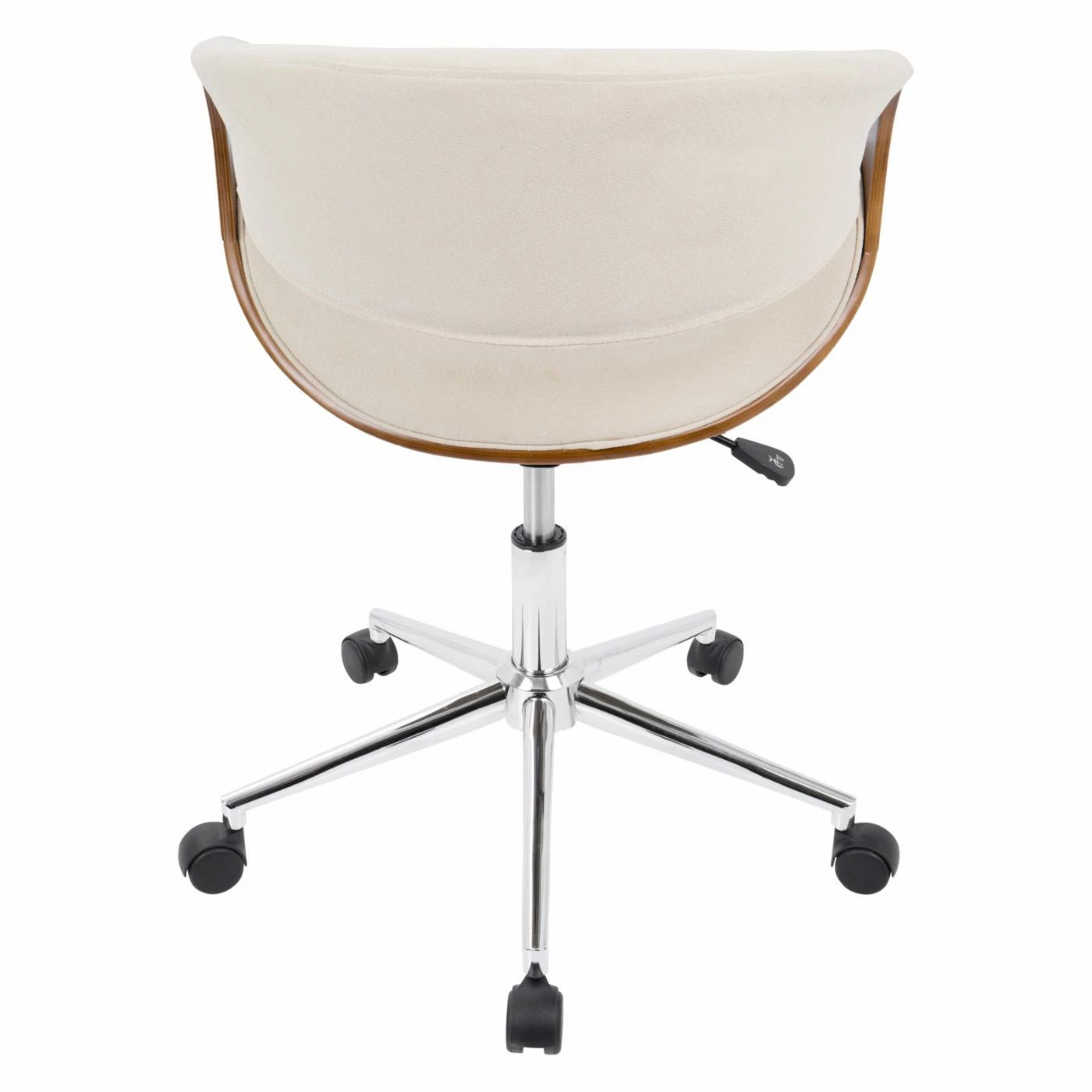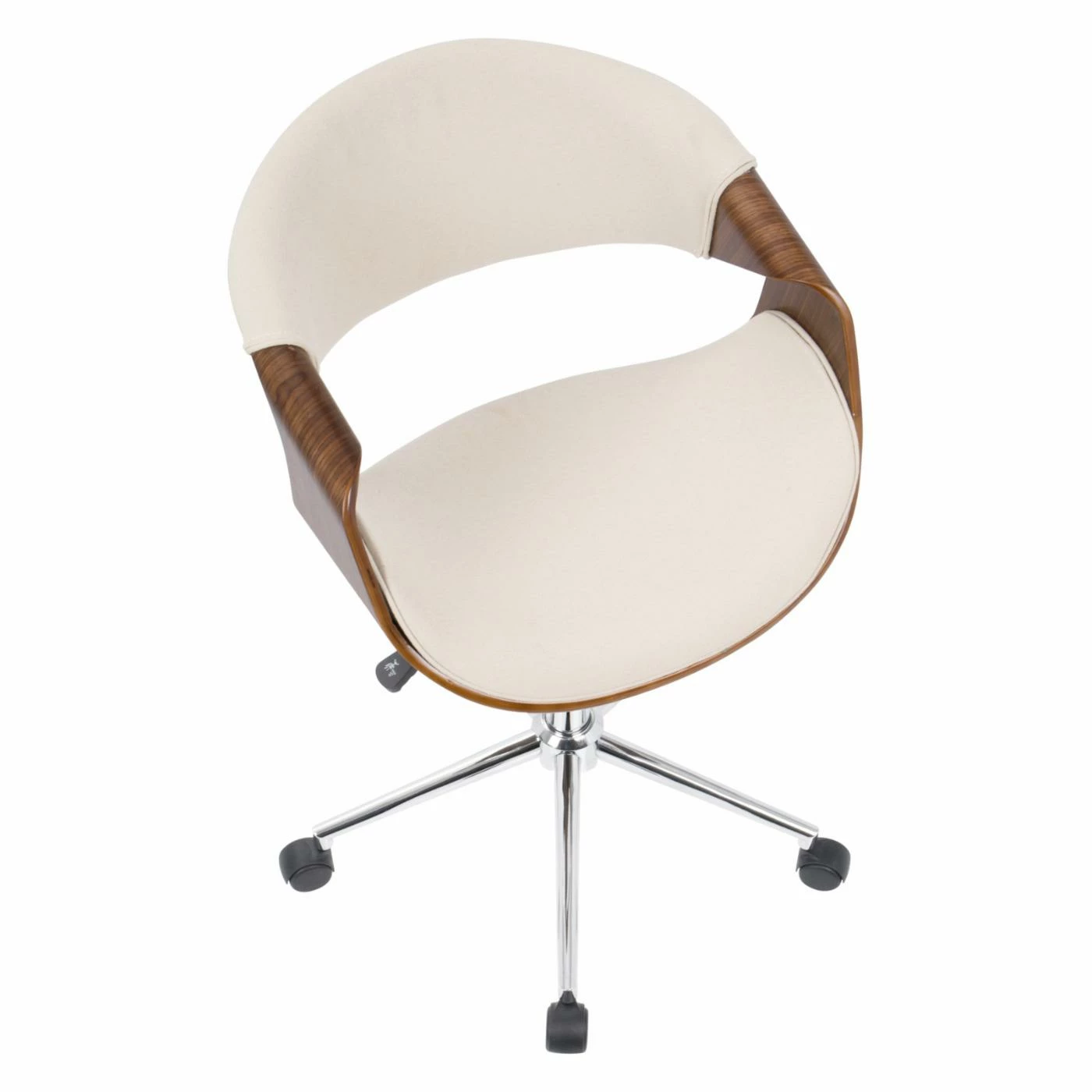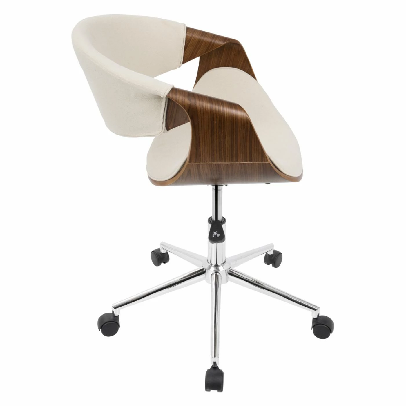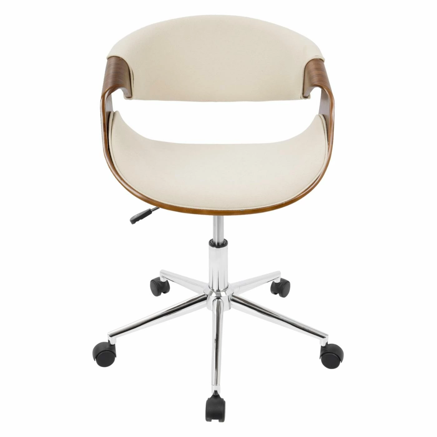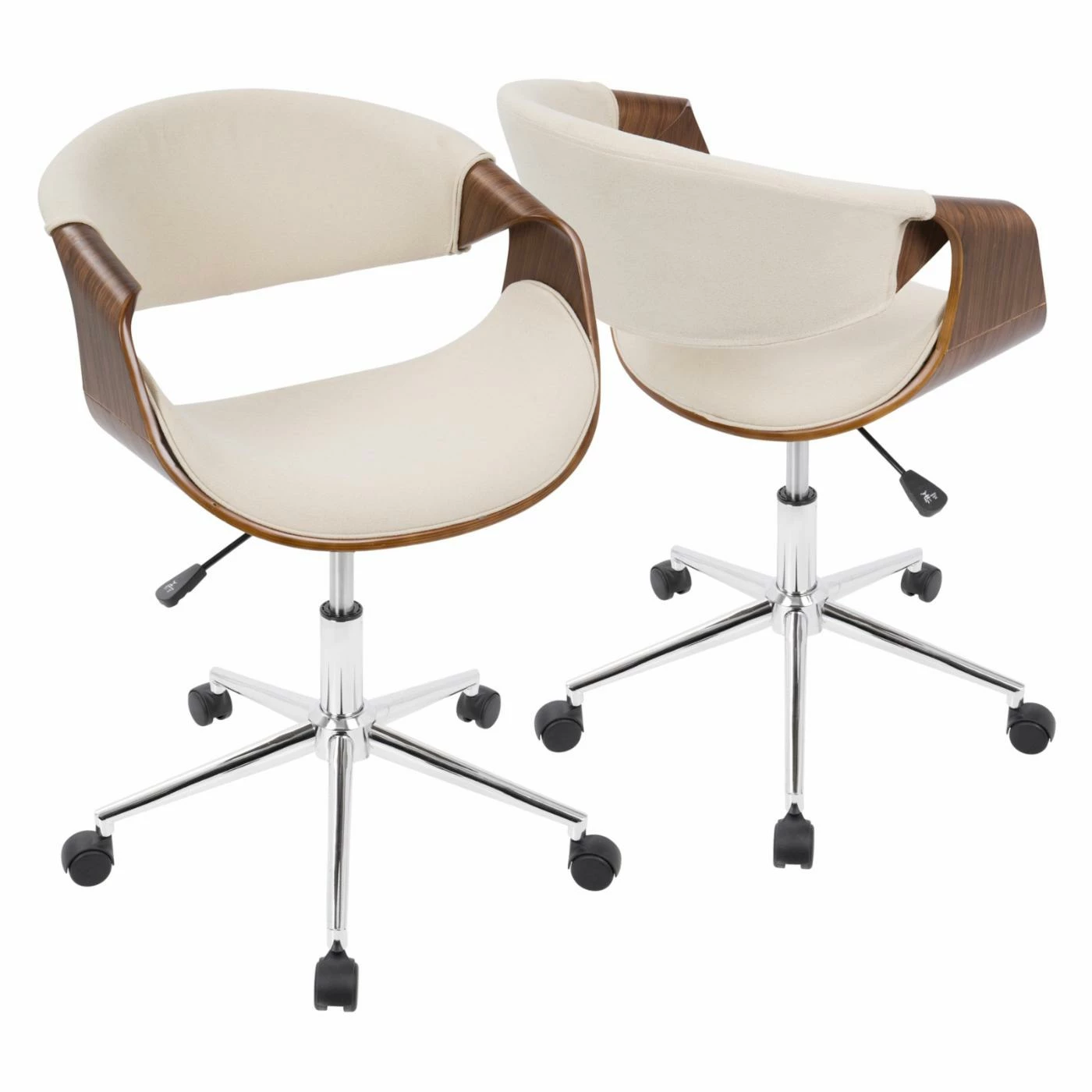You’ve seen a lot of office chairs, but now that you’ve seen the LumiSource Curvo Mid-Century Modern Office Chair, you can quit shopping. The mid-century pedigree of this chair is easy to see, with a curved plywood form under a rich, walnut-colored finish. The plywood is twisted to create a deep seat with rounded, supportive backrest. Dense padding of high-quality foam covers the seat and backrest, and that foam is covered with a linen-like polyester fabric. The chromed steel base rolls easily on a five-star caster arrangement. An easy-to-use height adjustment system makes sure that you’re always at the perfect height for effective, comfortable work. There’s more than one offering for vintage-appropriate fabric colors, so be sure to check them out and see which one is going to work best for you.
