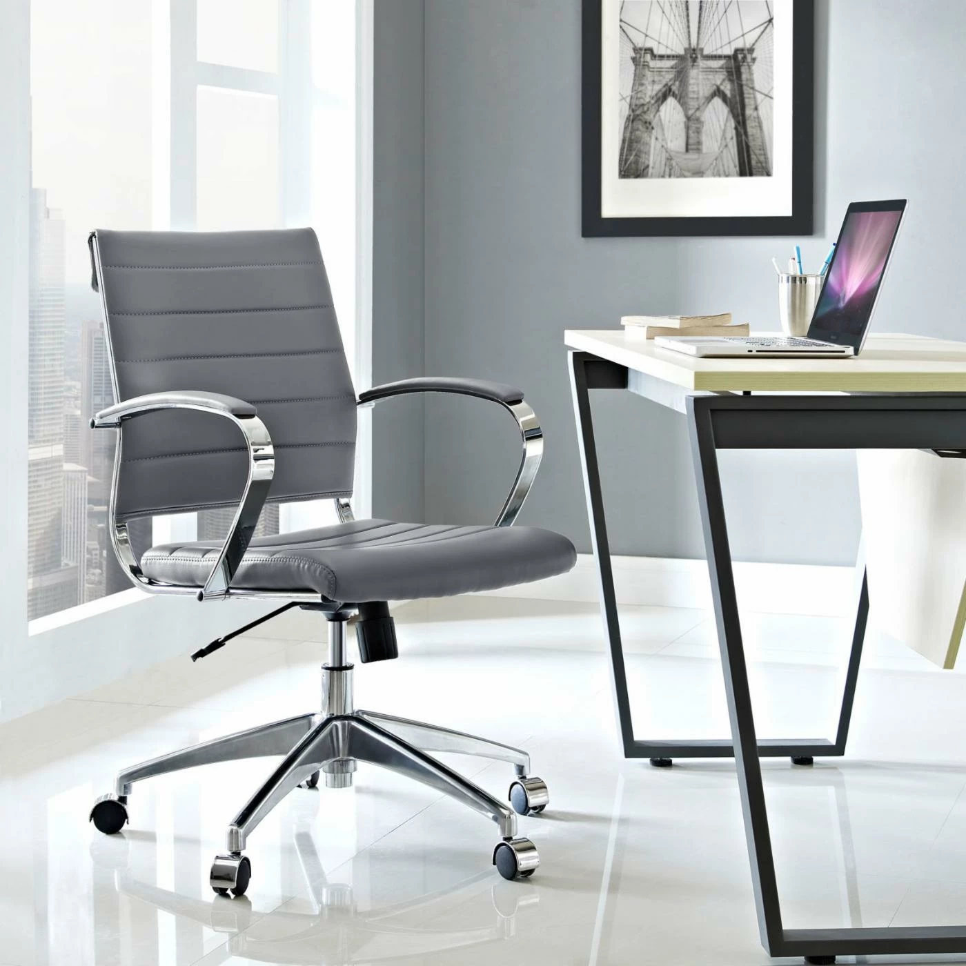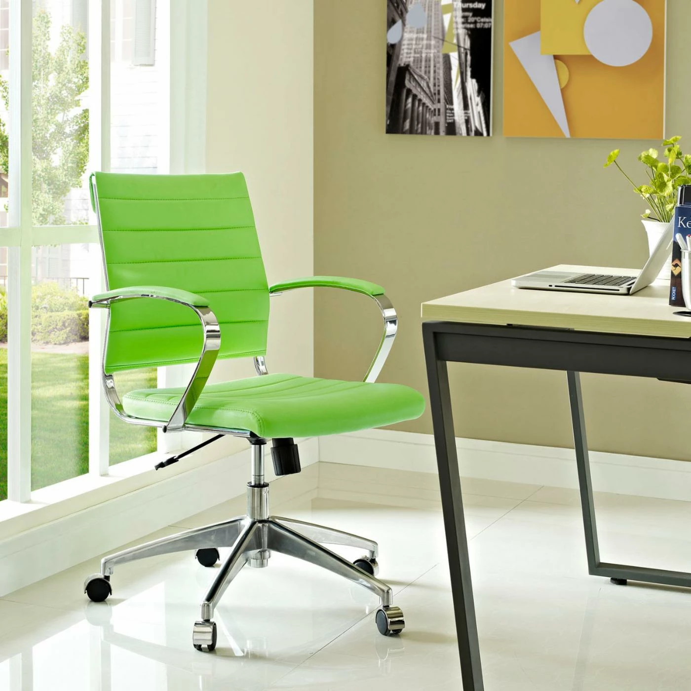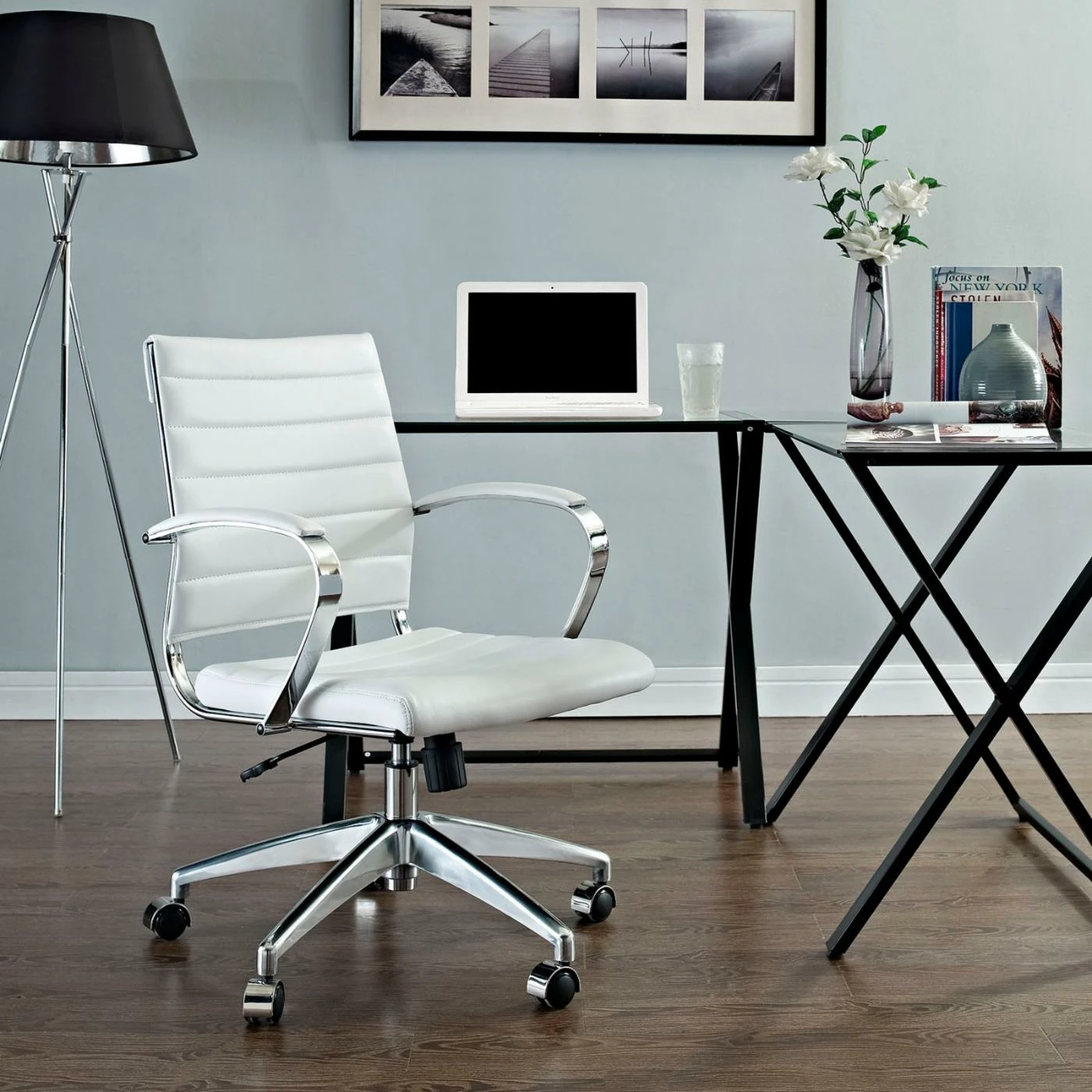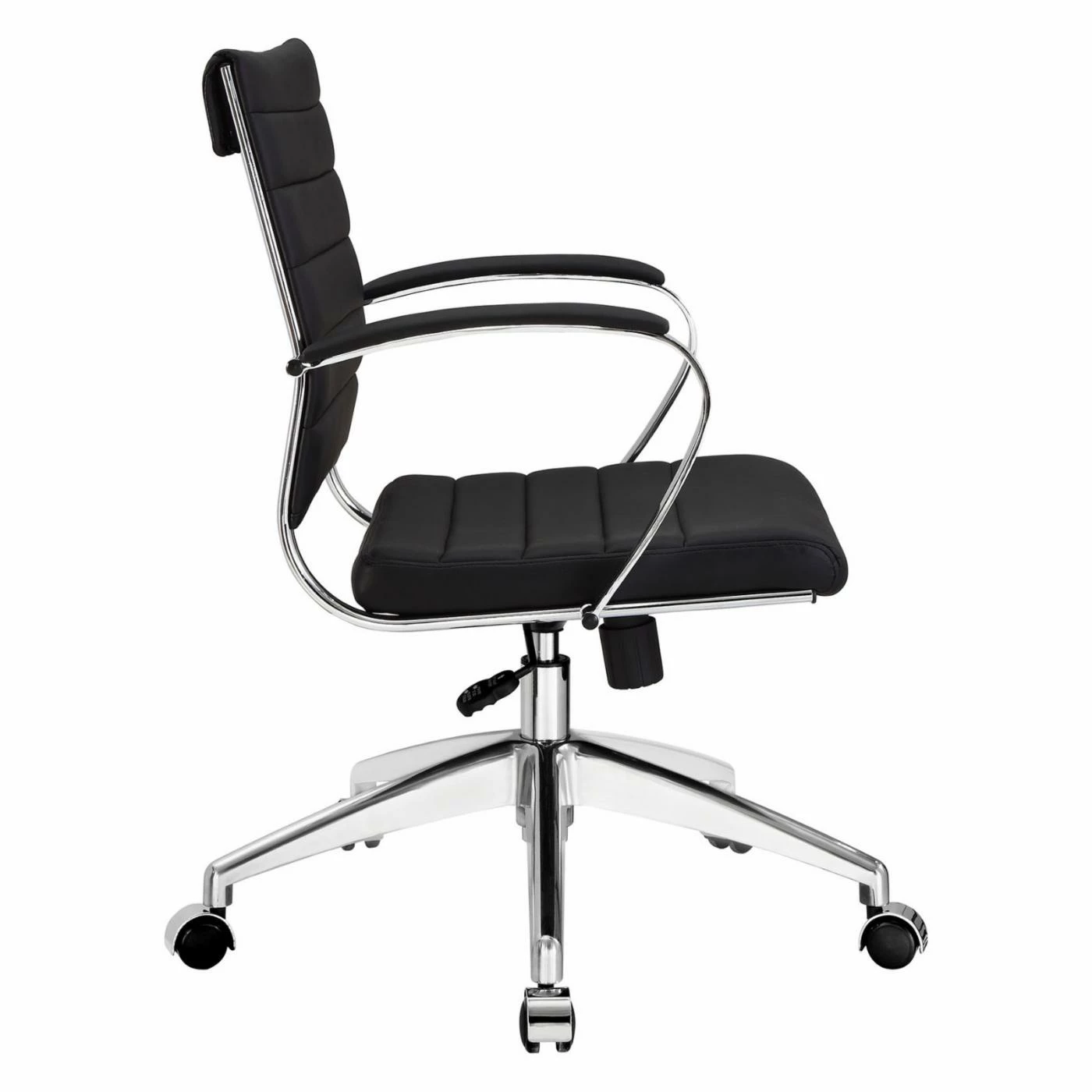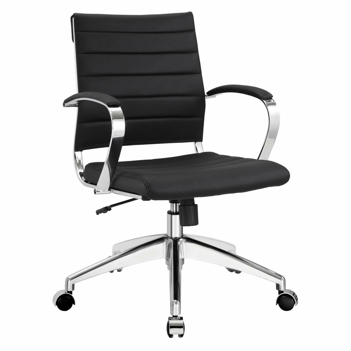 With impeccable mod styling, the Modway Jive Mid-Back Office Chair inspires and demands greatness of its occupant. You can hardly resist rising to the challenge, supported by a supple padded vinyl seat and ribbed backrest. Touches of chrome and a range of non-traditional color choices make this a statement chair. It’s also designed for functionality and proper posture with adjustable seat height, padded armrests, a tension-adjustment knob, and backrest tilt control lever. Five dual-wheel casters keep you agile.