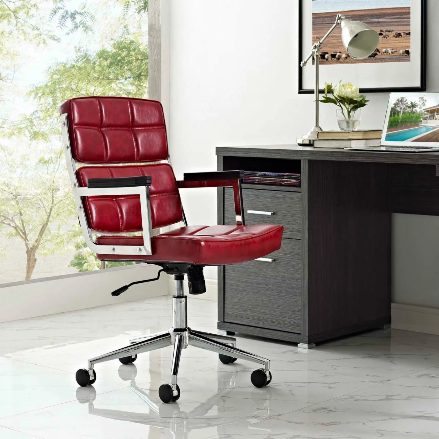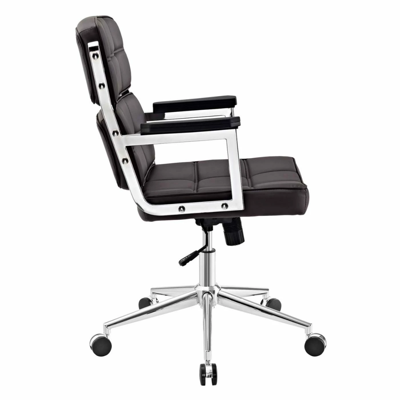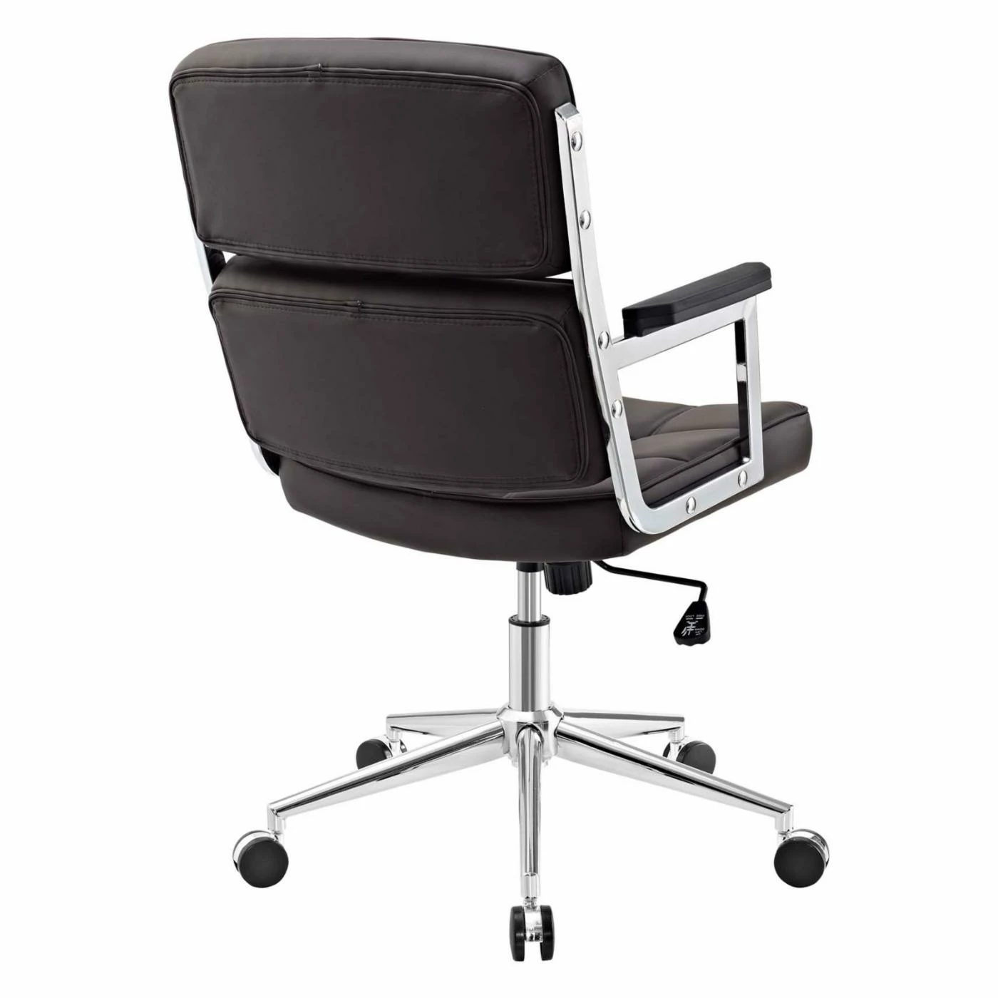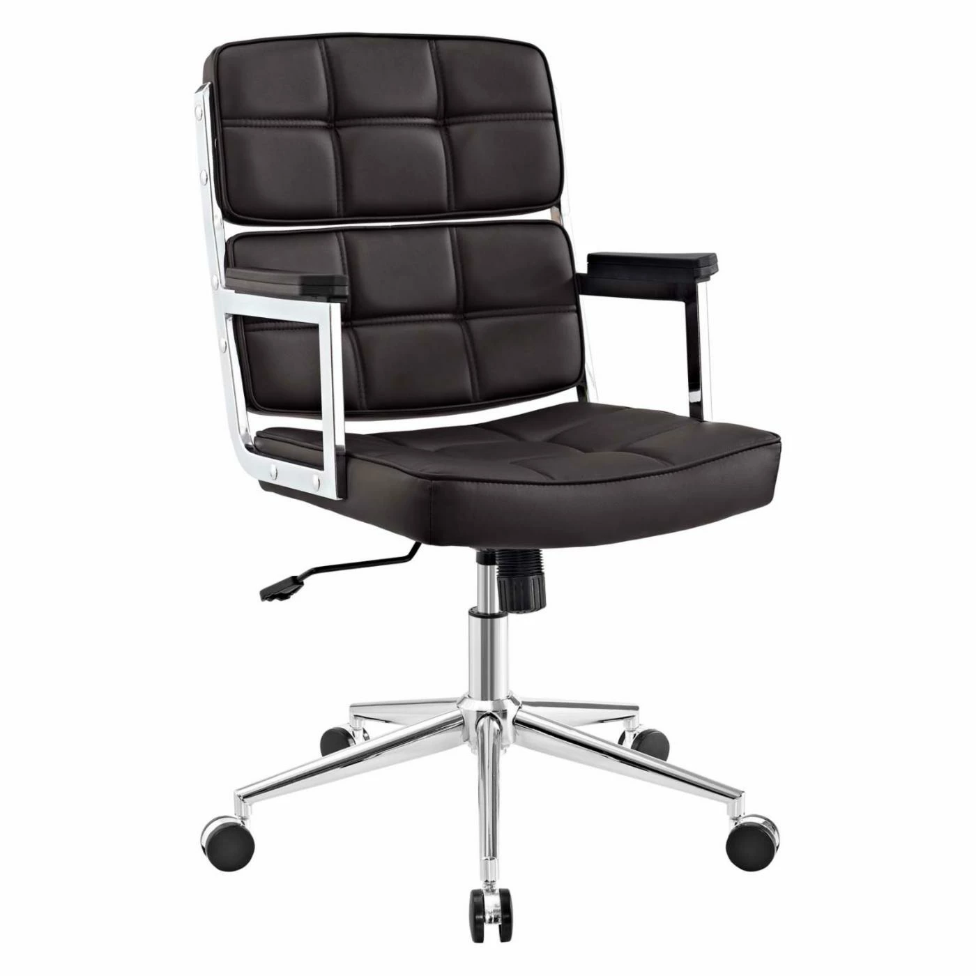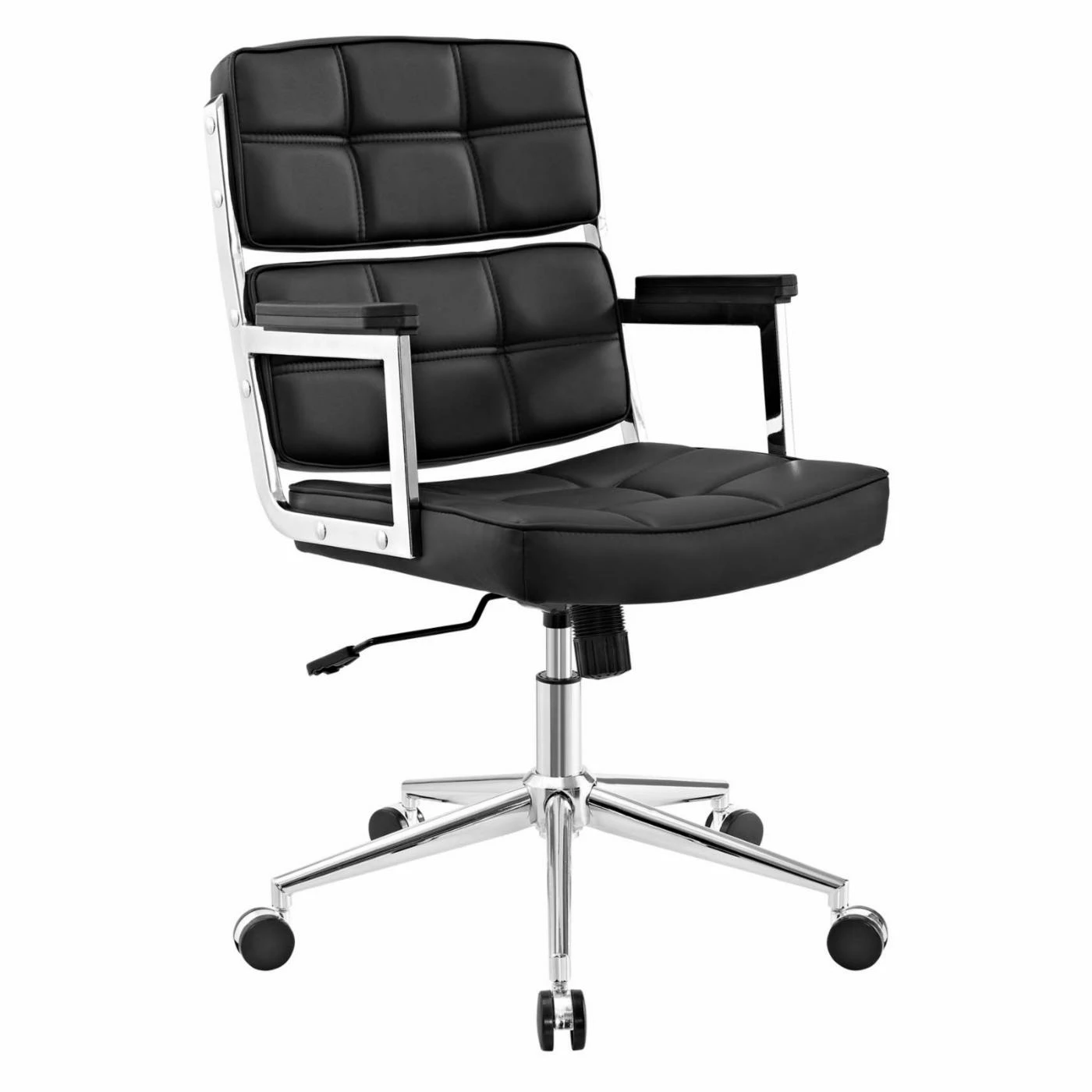 Add comfort and distinction to your workspace with the stylish design of the Modway Portray Highback Upholstered Office Chair. Made with a style that showcases modern design, this chair features a smartly dressed padded seat and back. A chrome finish on its base complements the striking vinyl upholstery in your choice of available color options. Work in customized comfort with fully adjustable features such as passive lumbar support, tilt tension knob, swivel feature, and adjustable height lever. Five sets of double wheel casters provide a smooth movement with outstanding support and mobility.