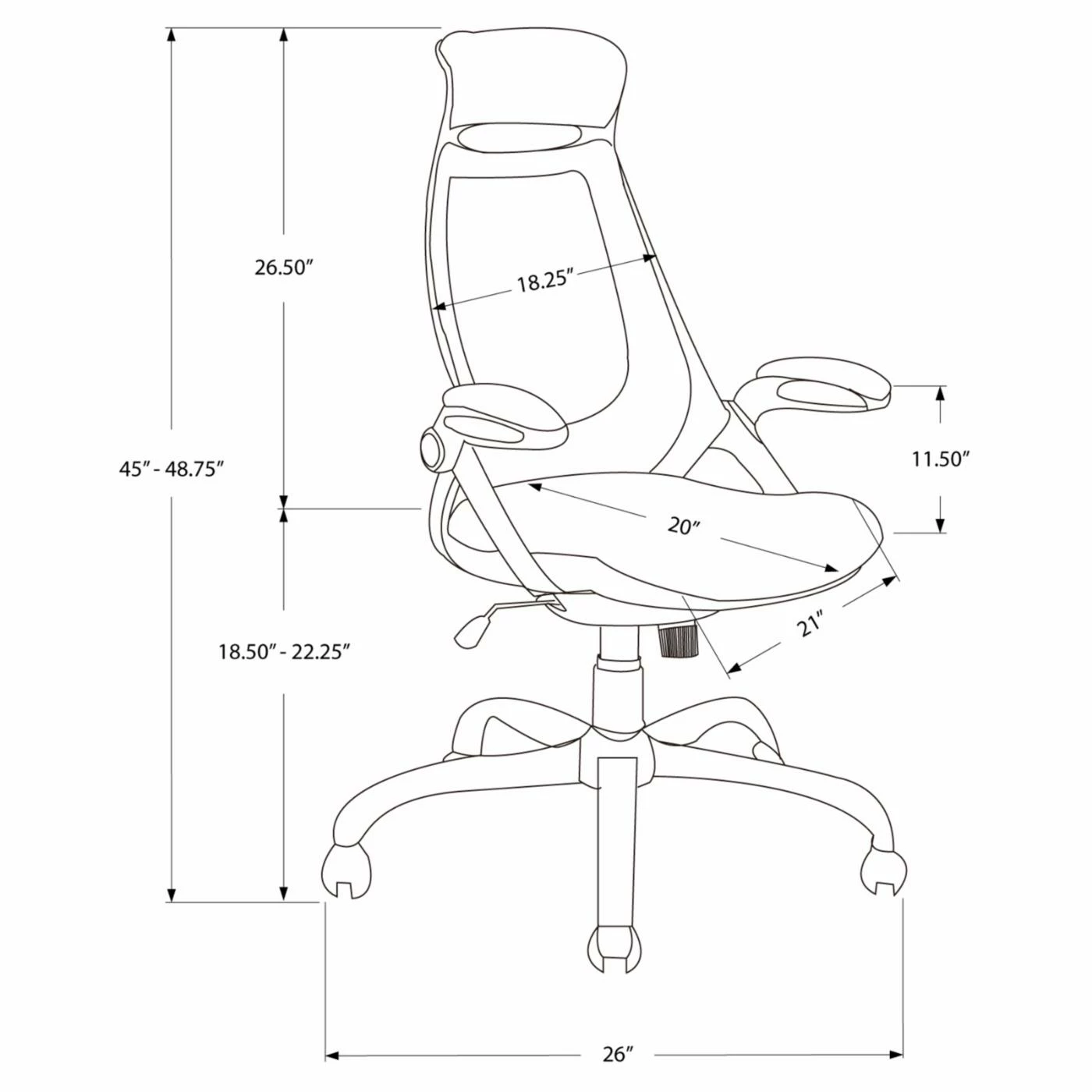 - Seat height adjusts from 18.5 in. to 22.25 in.