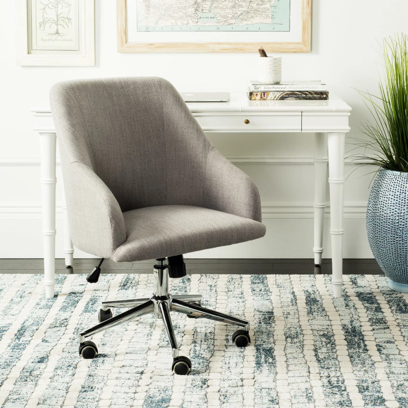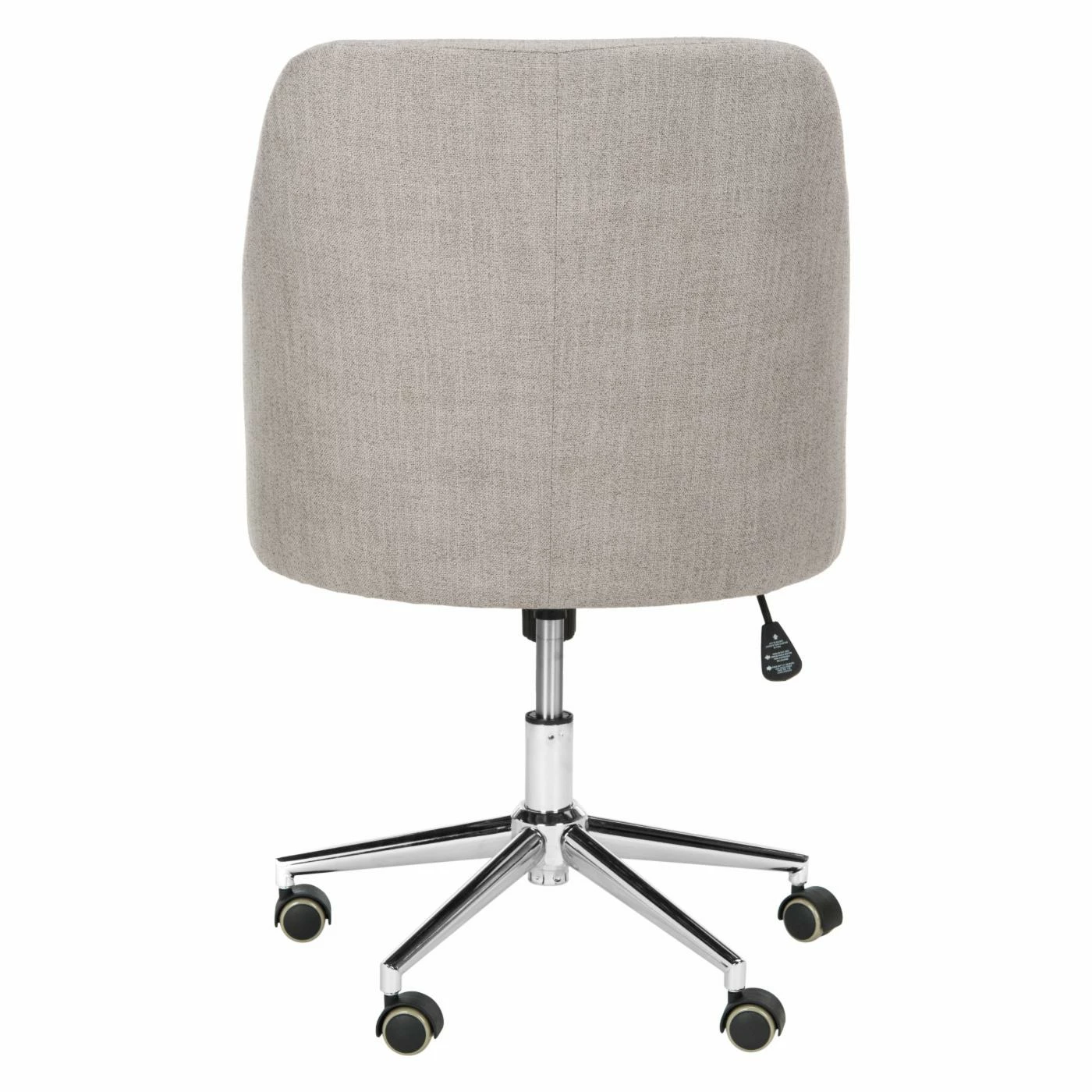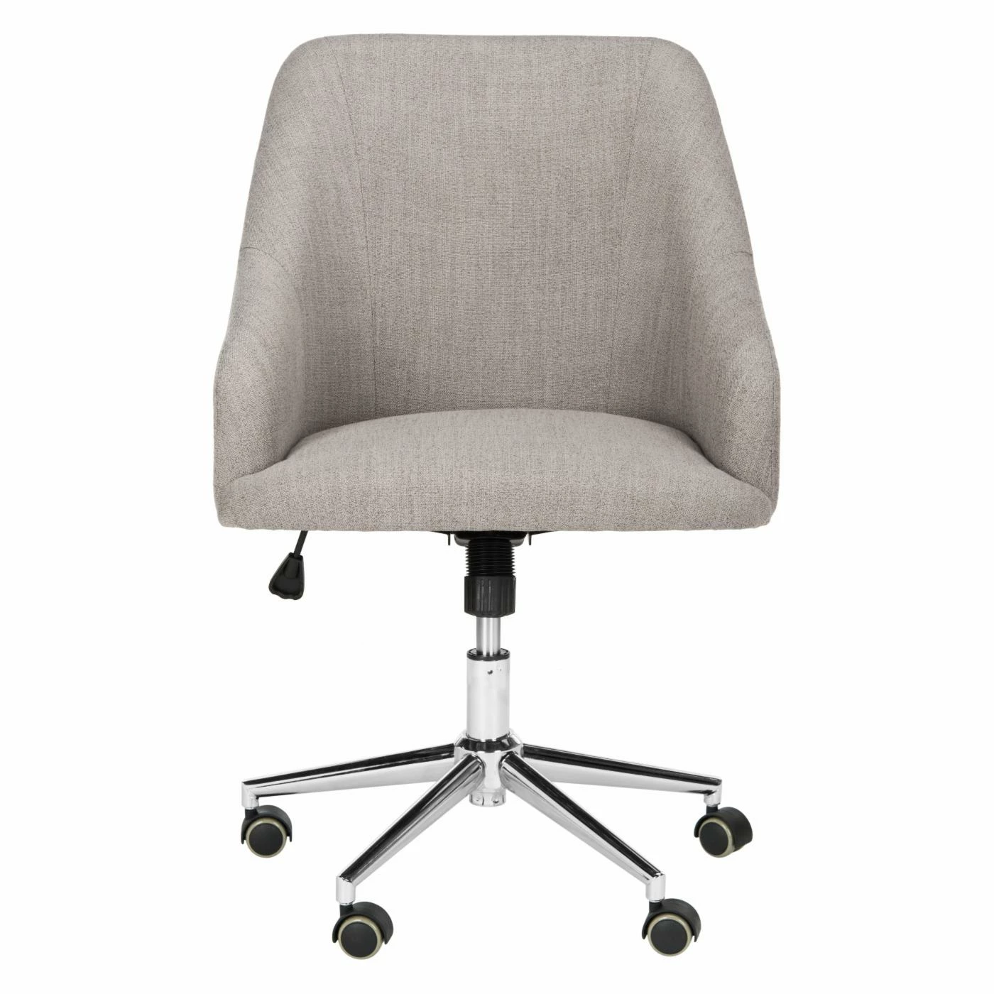 Update your home workspace with the Safavieh Adrienne Fabric Chrome Leg Swivel Office Chair, featuring a rounded back, sloped arms, and modern upholstery. This streamlined office chair boasts a sturdy iron frame finished in gleaming, modern chrome and plush, soft cushioning for optimal support and comfort. The smart swivel feature and durable caster wheel design allows you to move freely while you multi-task.