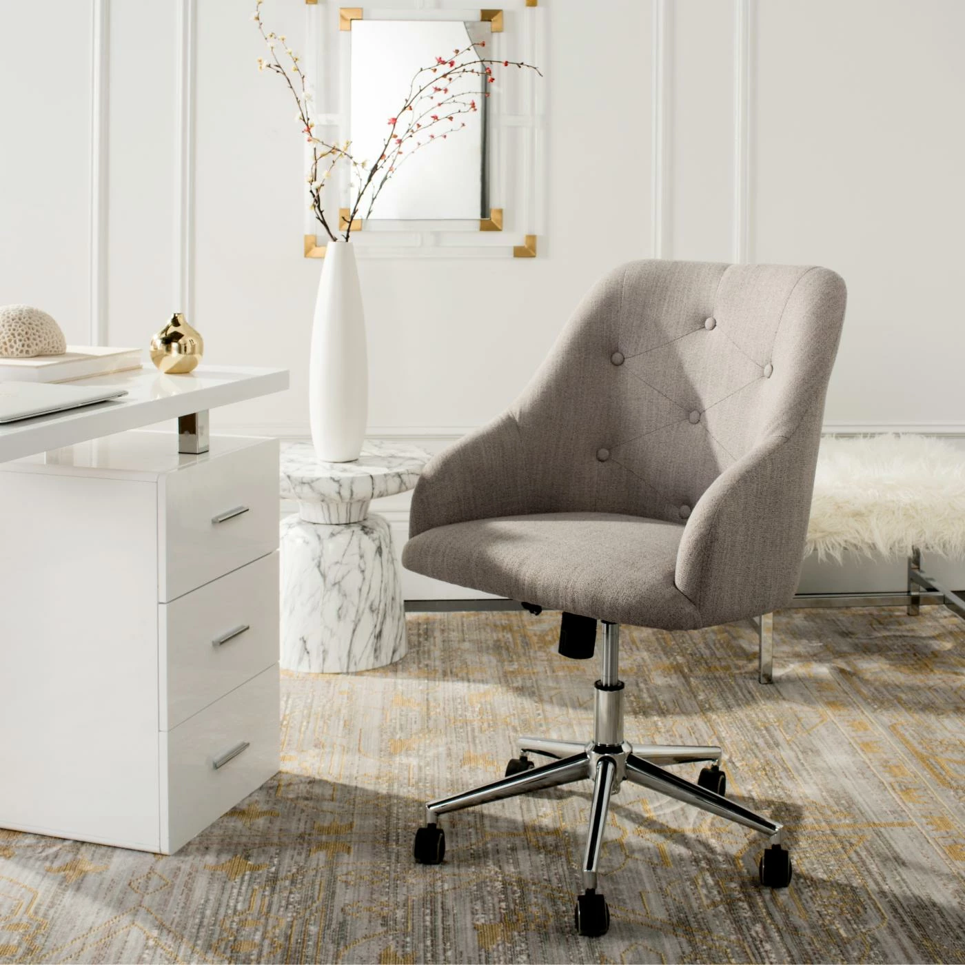 The Safavieh Evelynn Tufted Fabric Chrome Leg Swivel Office Chair brings an inviting, modern touch to your home workspace with elegant sloped arms and a gently rounded back for optimal support. This contemporary office chair boasts a sturdy iron frame that’s finished in flawless, gleaming chrome. The easy-to-adjust height provides a more customized feel, and the swivel feature allows you to move freely from one project to another.