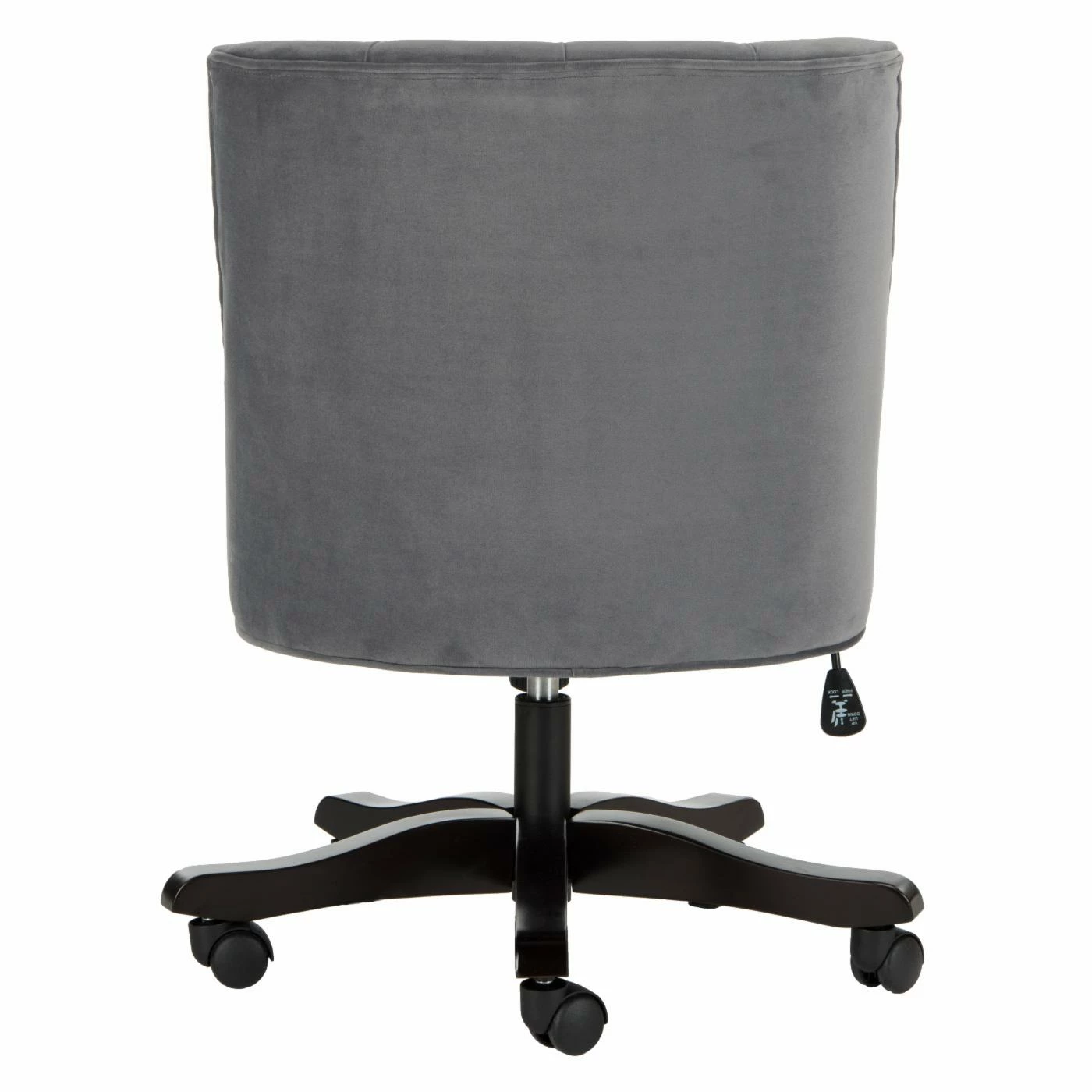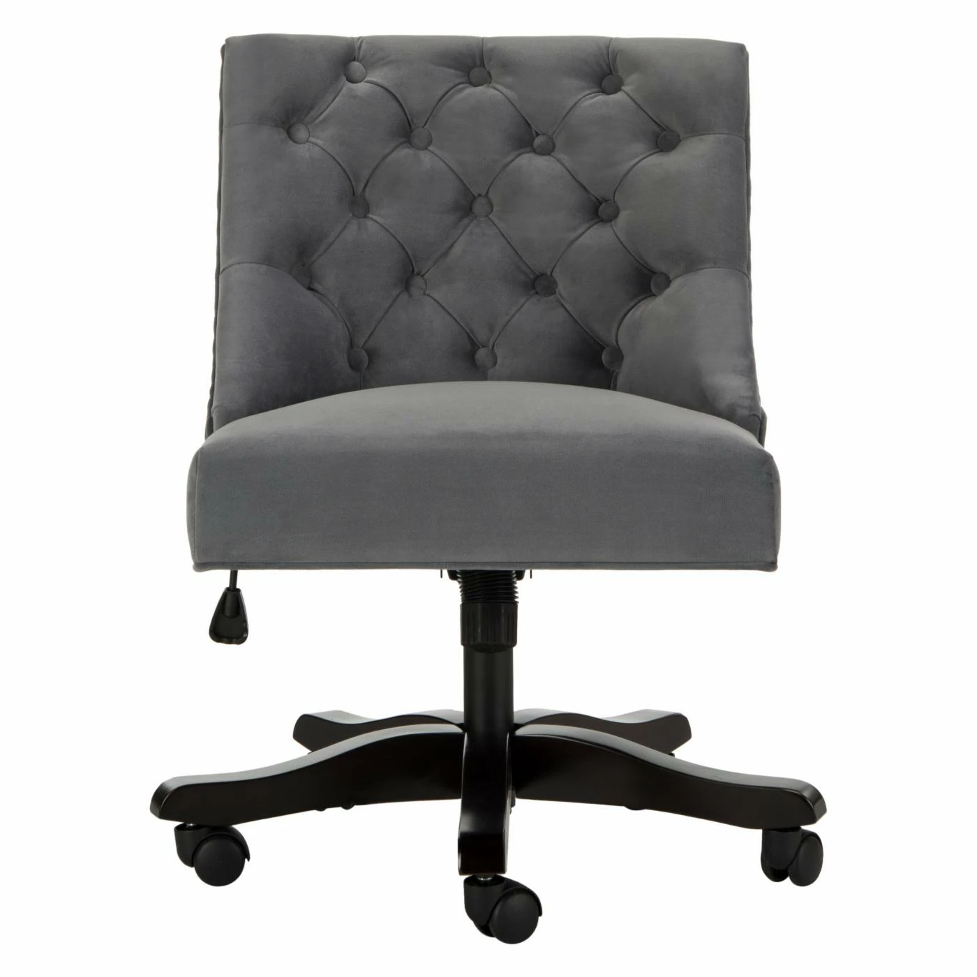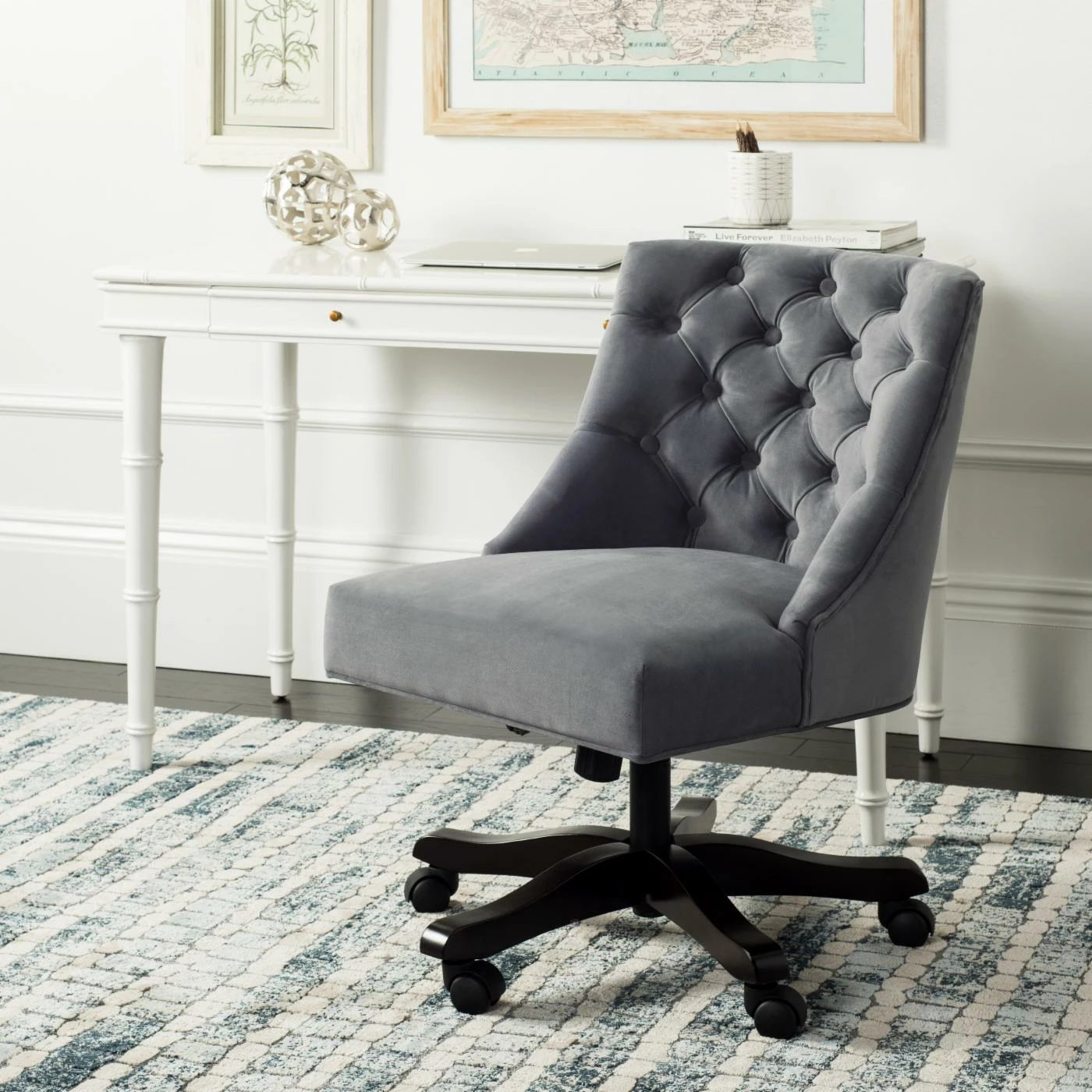 The Safavieh Soho Tufted Velvet Swivel Desk Chair is crafted with a sturdy frame of birch and hardwood, then topped with ultra-soft cushioning and plush velvet upholstery in a contemporary gray shade of gray. The gently curved back provides a comfortable, supportive feel and features elegant button tufted detail that adds a touch of sophistication to your decor. This desk chair features sloping, barely-there arms, allowing you to sit close to your desk while working. The smart swivel design and durable caster wheels give you maximum mobility while you multi-task.