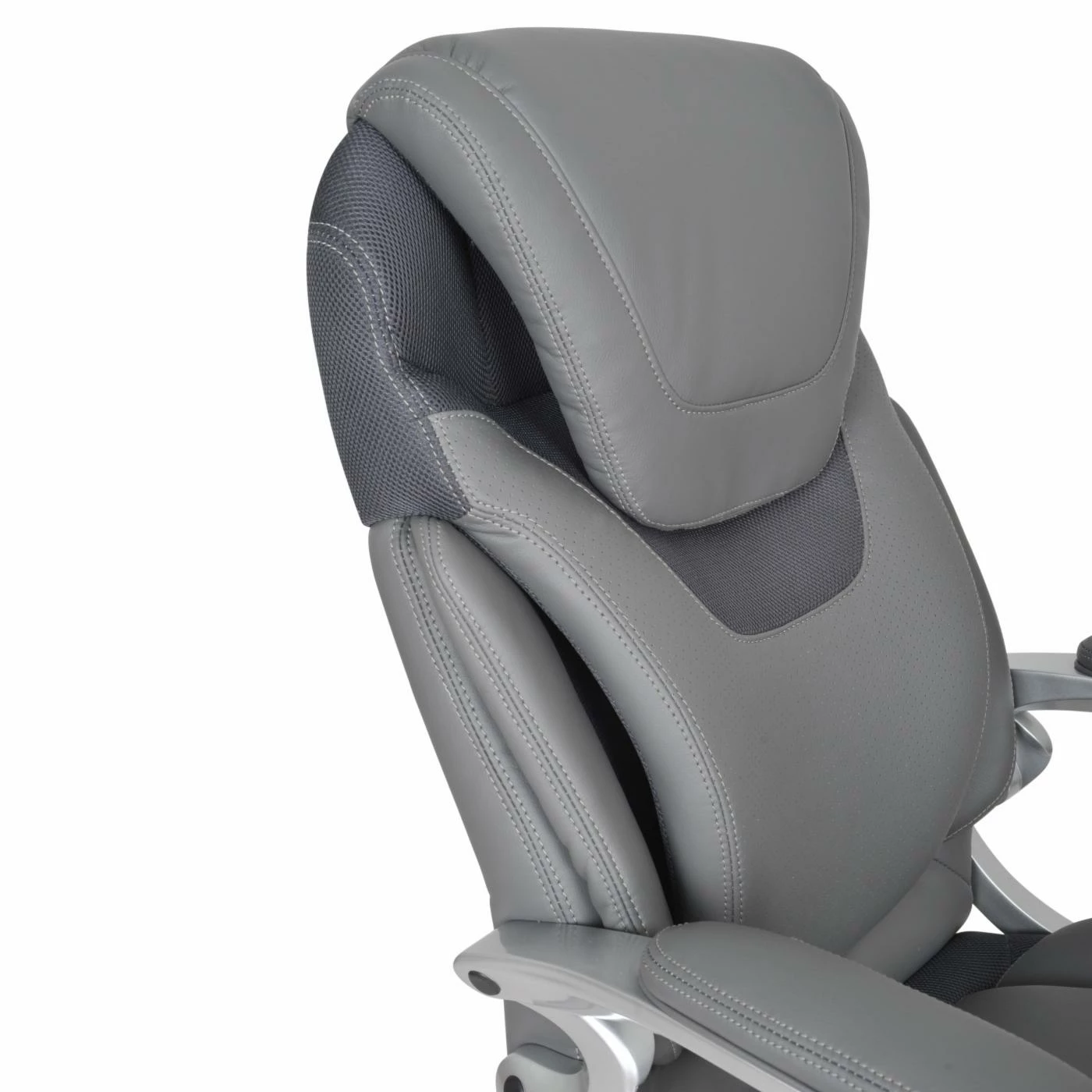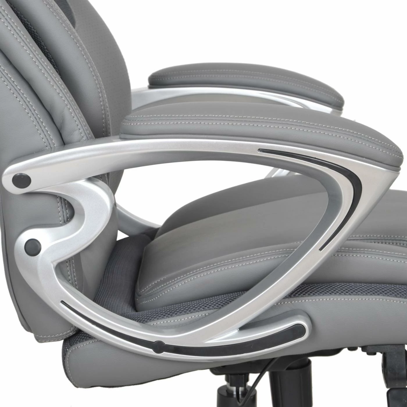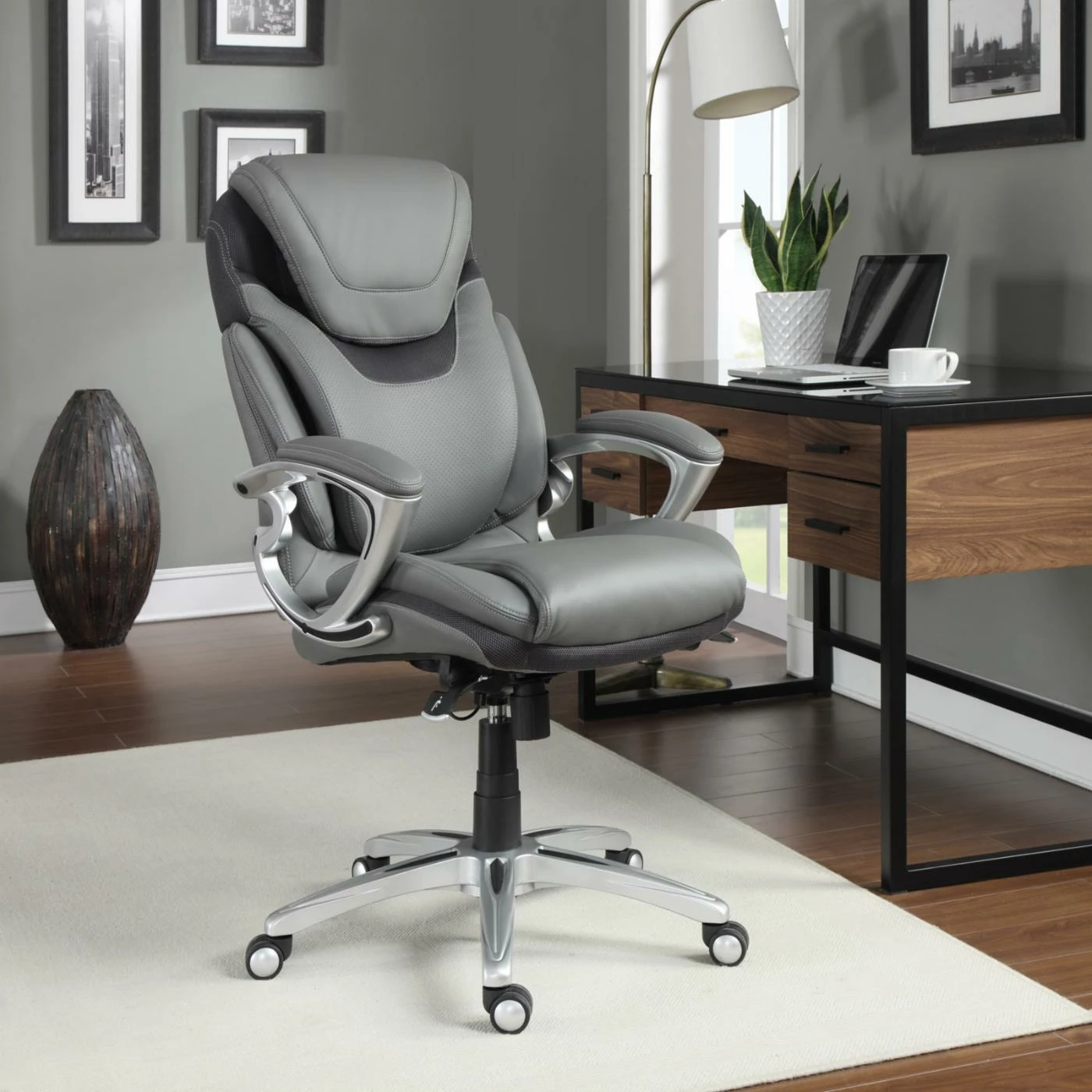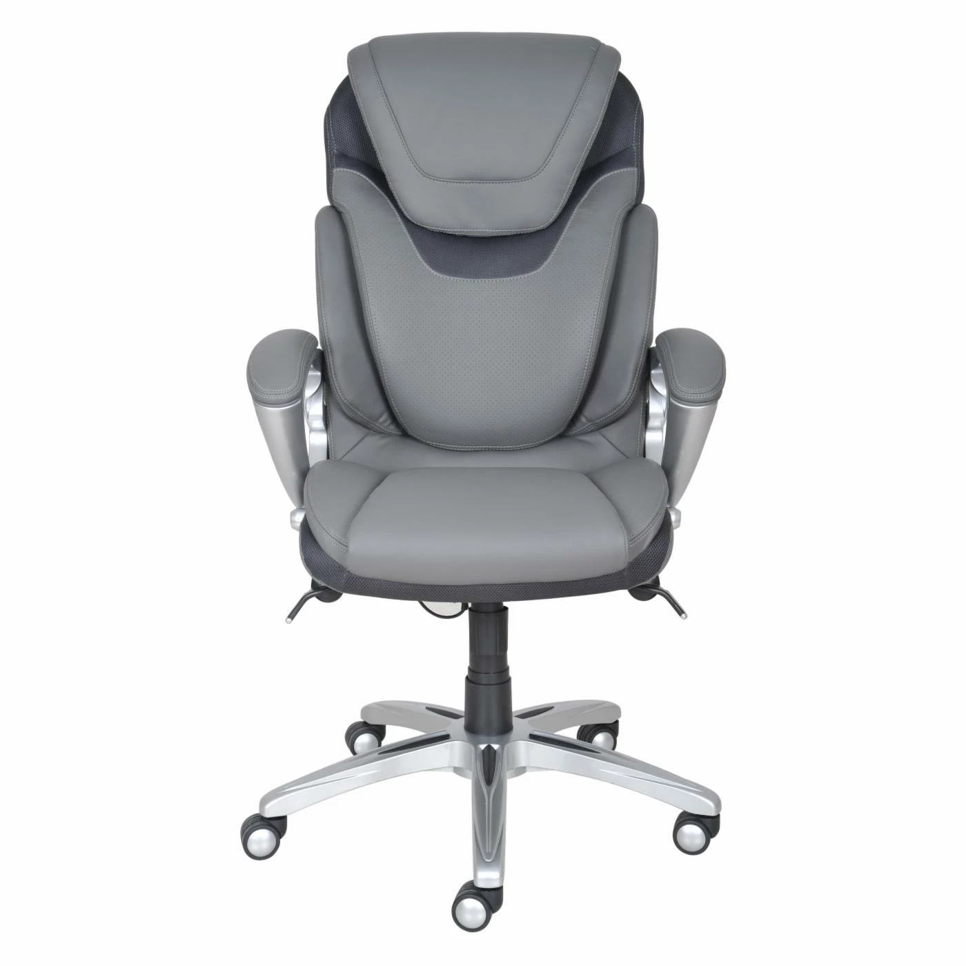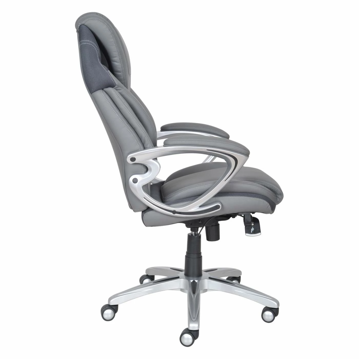 Comfortably sit for hours on end on the stylish Serta AIR Health &Β Wellness Eco-friendly Bonded Leather Executive Office Chair – Light Grey. The soft eco-friendly light grey bonded leather upholstery surrounds the sturdy metal frame of this durable office chair. Its deep, ergo layered body pillows offers exquisite seating while its kinetic lumbar support adapts to your every movement. The ergonomic seat-side cable actuated levers provide convenient height and tilt adjustments much like its pneumatic lift with adjustable tension and lock out features.