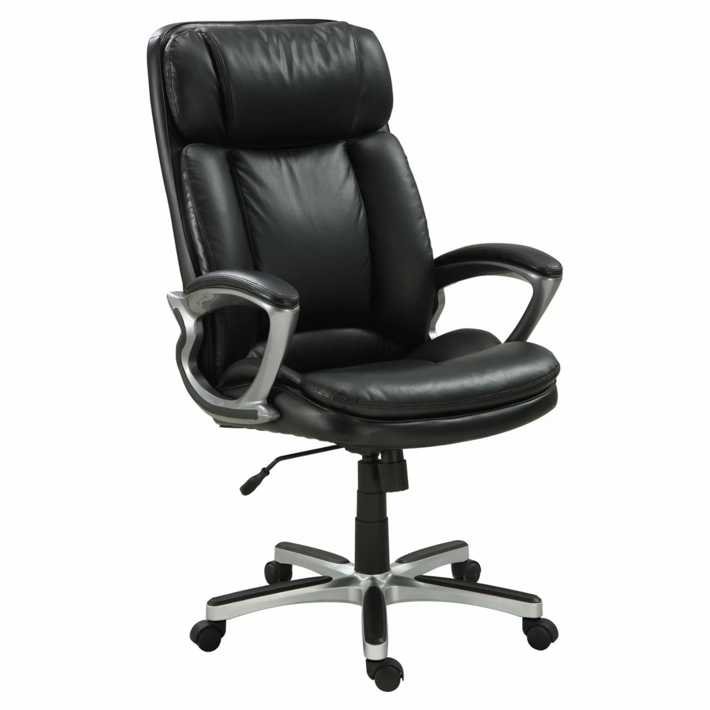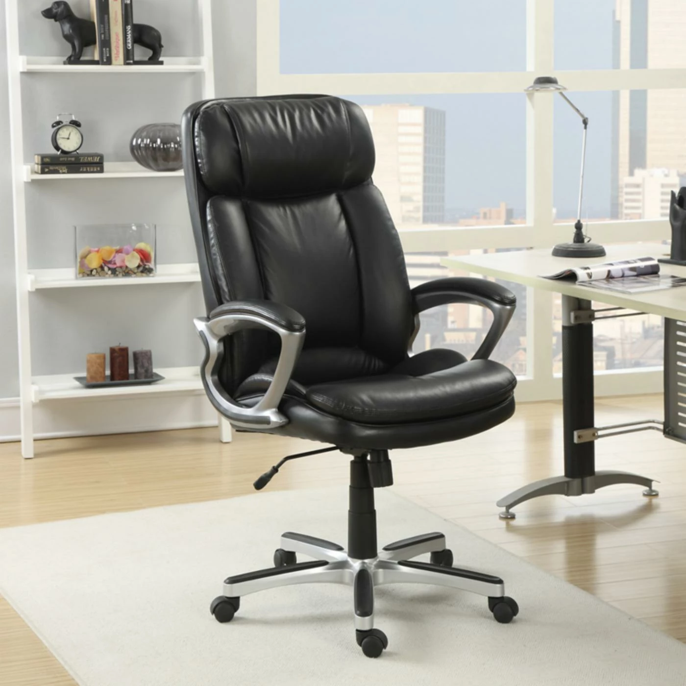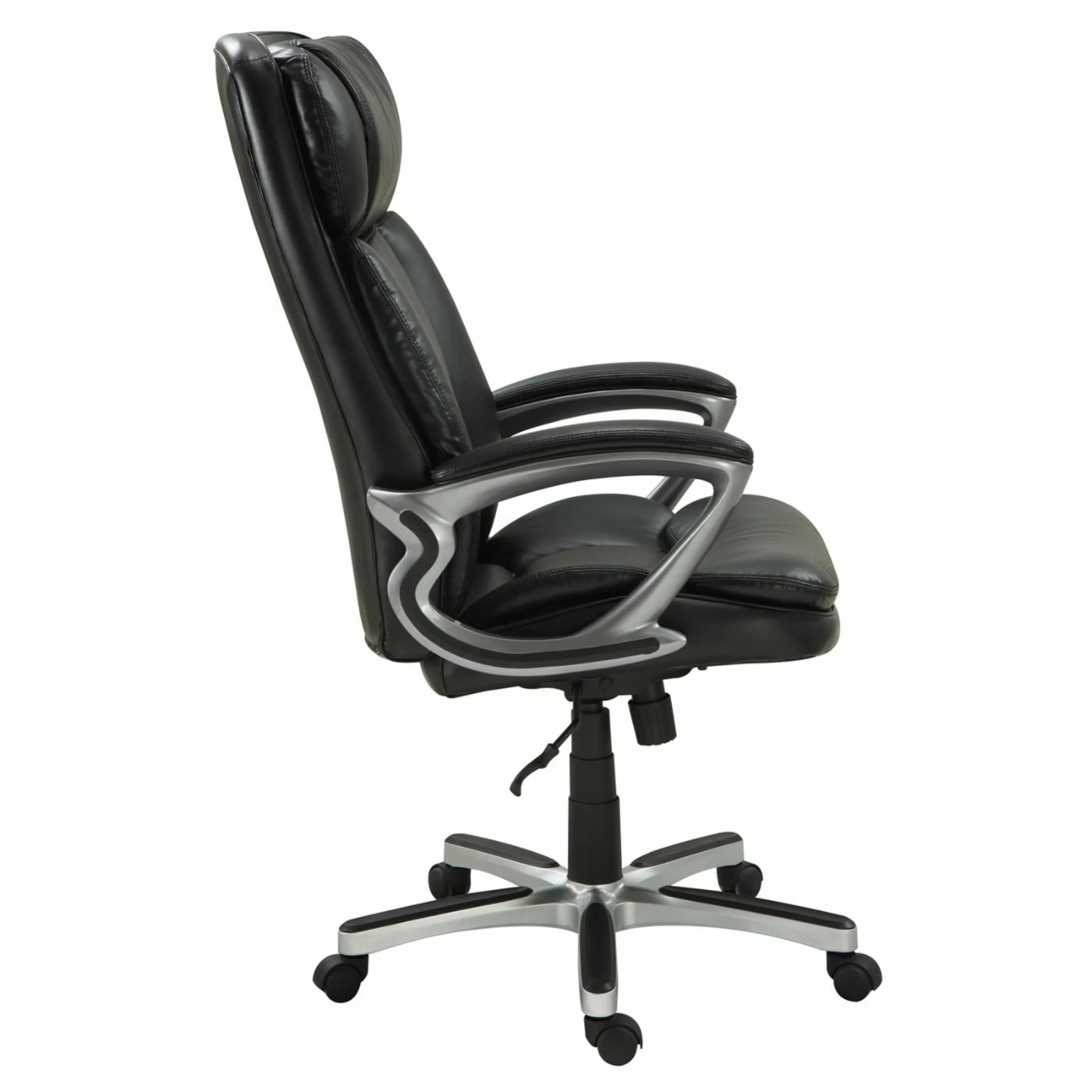 Supporting your back is a must when sitting for long periods of time, and the Serta Puresoft Faux Leather Executive Big & Tall Office Chair – Smooth Black does just that. This must have office chair is upholstered in durable smooth black faux leather and features commercial grade big and tall components which supports up to 350 pounds. Its deep, ergo layered body pillows offer your body a wonderful seating experience while its contoured lumbar provides exceptional support for your lower back. The sculpted contemporary padded arm rests are painted in a cool grey finish adding to its sleek appeal. Also included is a pneumatic seat-height lift with adjustable tilt tension knob and recline lock out features.