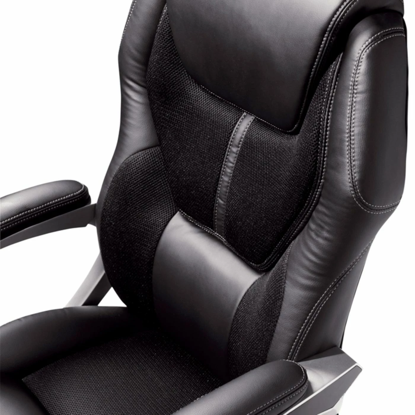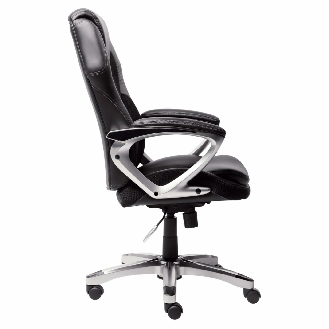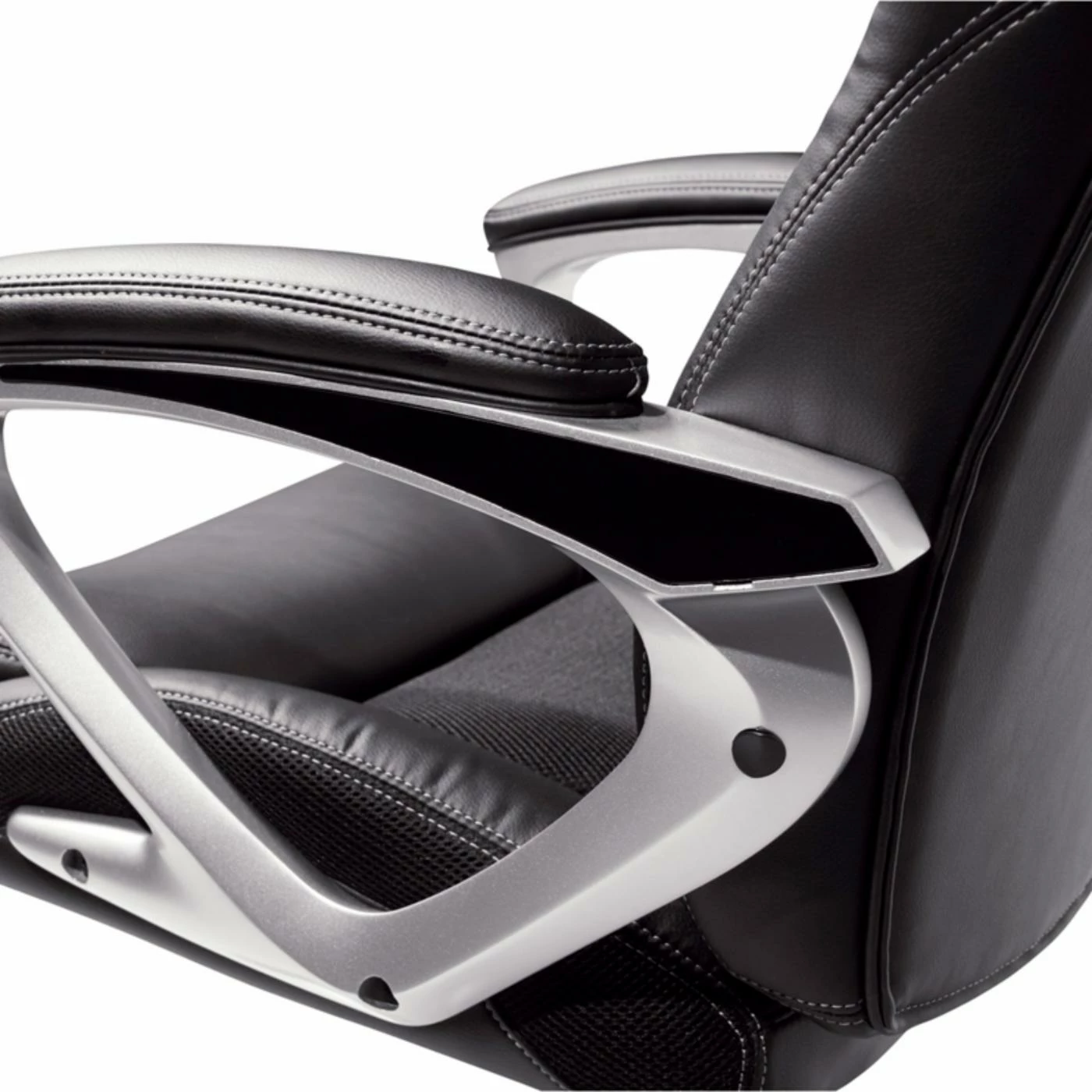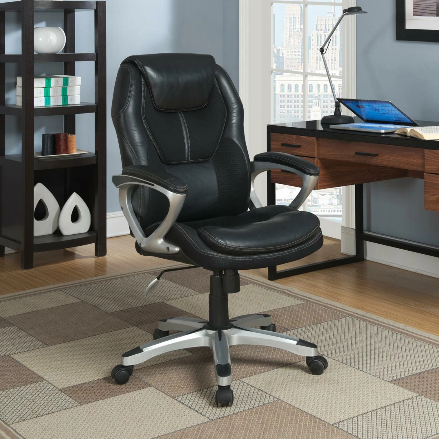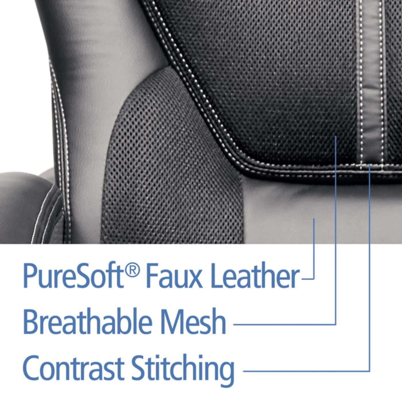 Work comfortably throughout the day using the Serta Puresoft Faux Leather with Mesh Executive Office Chair โ Black. This supporting office chair features a sturdy metal frame and comes in soft faux leather with breathable black mesh with silver underlay accents. This ergo-contoured seat includes generously soft upholstered armrest for added comfort. Its pneumatic seat-height adjustment and tilt tension adjustment with lockout features provide just the right amount of give for office settings. Assembly is required.
