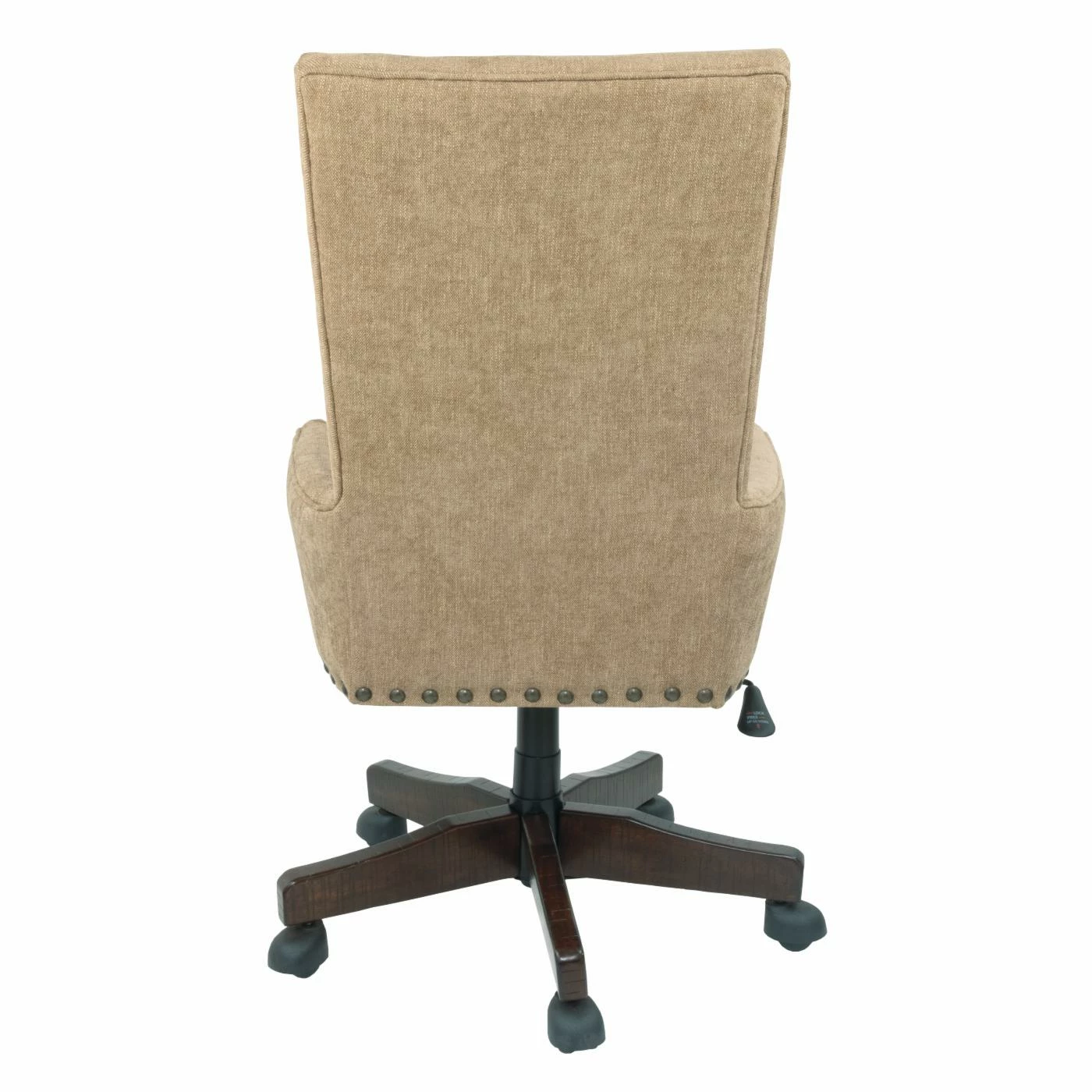 Add a dose of executive style to your office with the Signature Design by Ashley Baldridge Upholstered Swivel Executive Desk Chair, accented with light brown fabric upholstery and stylish nailhead trim. This comfortable desk chair features a tall back and low, fixed arms for a refined silhouette in any office space. The durable hardwood solid frame adds sturdiness. Also featured are a swivel function, adjustable height, and smooth-rolling wheels.
