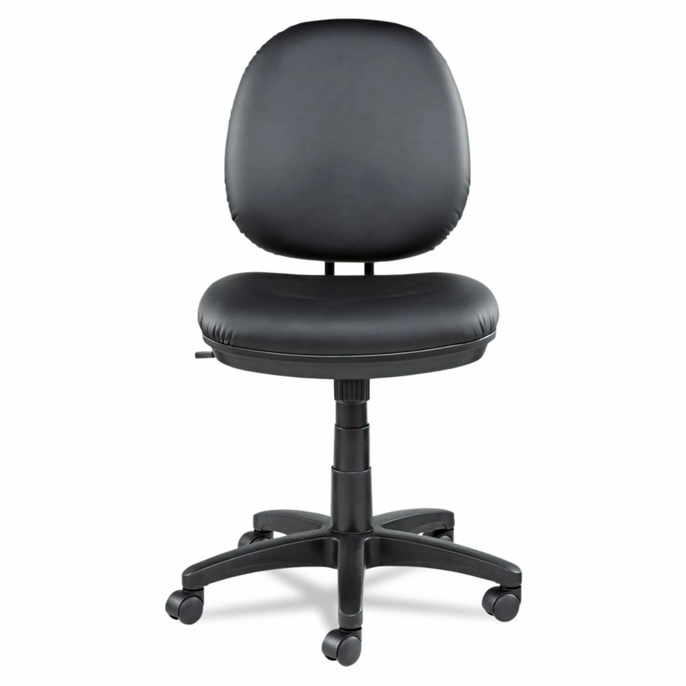 Able to swivel, tilt, and roll, the Alera Interval Series Leather Swivel/Tilt Task Chair – Black is a practical seating solution with a compact footprint to fit small spaces. The simple task chair is upholstered with luxurious genuine leather for a professional look, and its impact-resistant plastic shell is black to match the upholstery. To promote better circulation, the chair features a waterfall seat edge, which puts less pressure on the underside of the legs while you sit. The chair is stabilized by a wheeled, five-star base.
