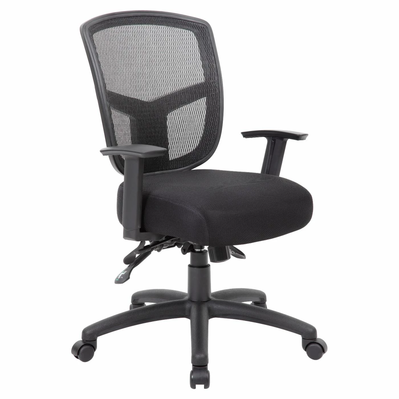 From top to bottom, the Boss Contract Mesh Task Chair has it where it counts. The breathable contract mesh back pairs with the four-inch spring seat cushion and adjustable black polyurethane arms to create a cozy seat. The three-paddle multi-function tilt mechanism allows the seat and back to be independently adjusted and locked, too. A pneumatic gas lift seat height adjustment is handy for a variety of work surfaces, while the black nylon base includes hooded double wheel casters.