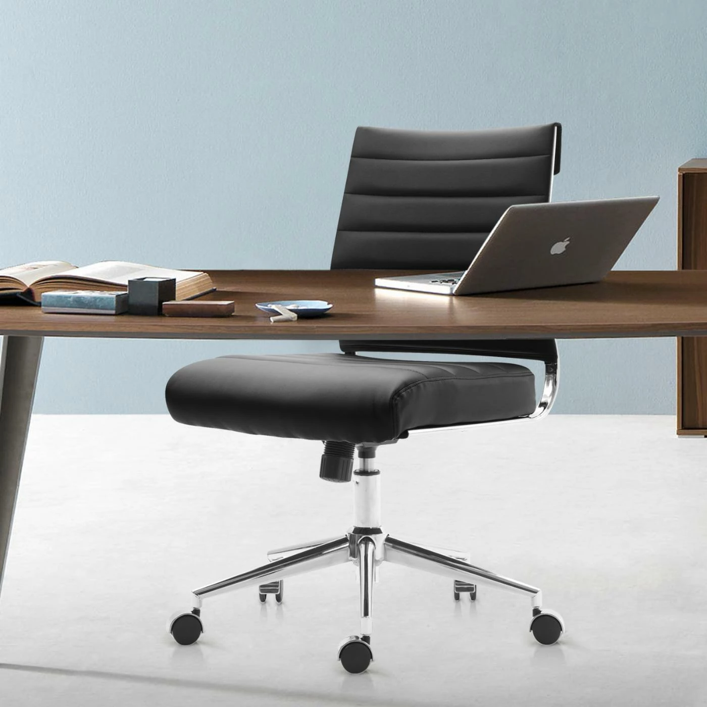 Update your office with the sleek, modern appearance of the Edgemod Tremaine Vegan Leather Task Chair. This armless task chair has an adjustable seat height and seat-tilt with tension control. Its sophisticated faux leather construction comes in your choice of available color.