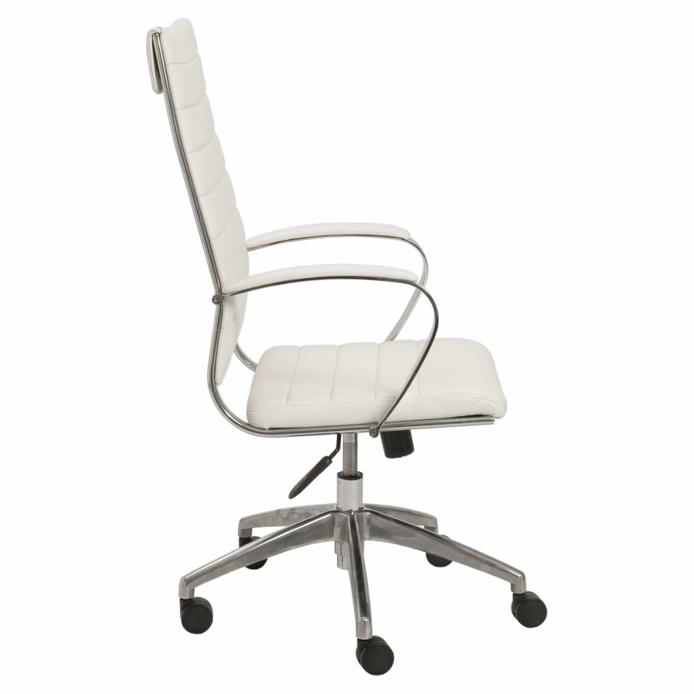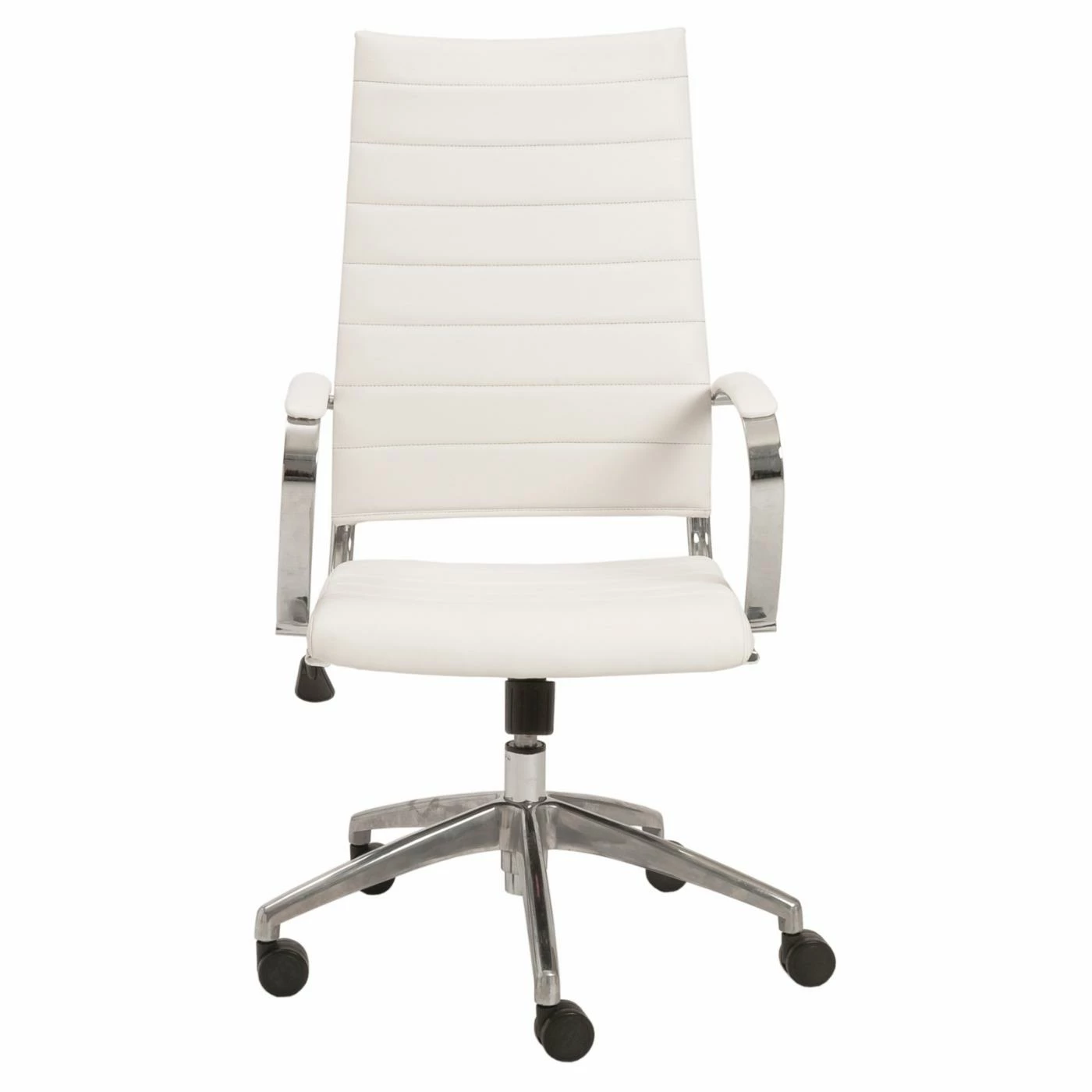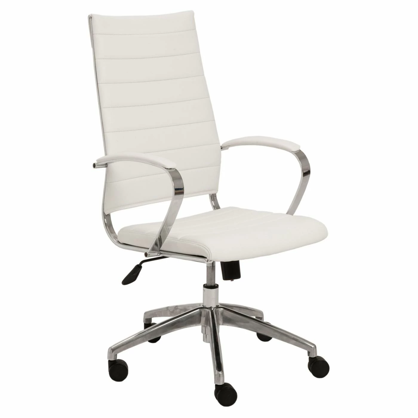 That paperwork never looked so stylish – thank you, Euro Style Axel High Back Office Chair – White / Aluminum. This office desk chair is all style with its leatherette seat, back, and armrests, not to mention the polished chrome steel frame. A locking tilt mechanism and cozy foam padding add to the comfort, and youβre on a roll thanks to the polyurethane casters that wonβt mark or scratch hardwood floors. Casters are covered with stainless steel hoods, and all components are BIFMA-approved.