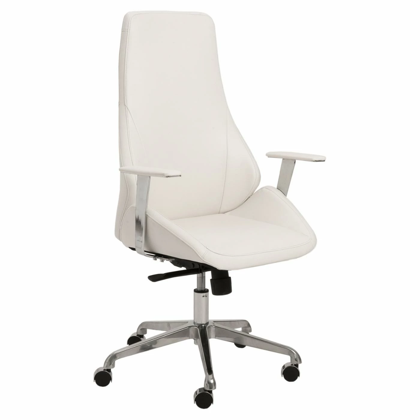 Even busy work looks more beautiful when youβre perched in the Euro Style Bergen High Back Office Chair – White/ Aluminum. As comfy as it looks (maybe even more so), this office desk chair features a leatherette seat and back over cozy foam fill and a laminated wood frame. A tilt mechanism with four locking positions makes it extra-cozy, and the polyurethane casters with stainless steel hoods wonβt scratch or mark hardwood floors. A chrome-finished aluminum base completes the design. BIFMA-approved components.