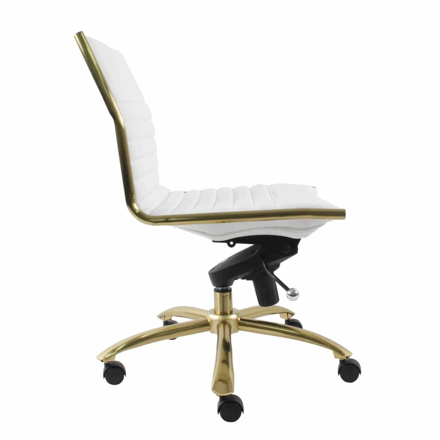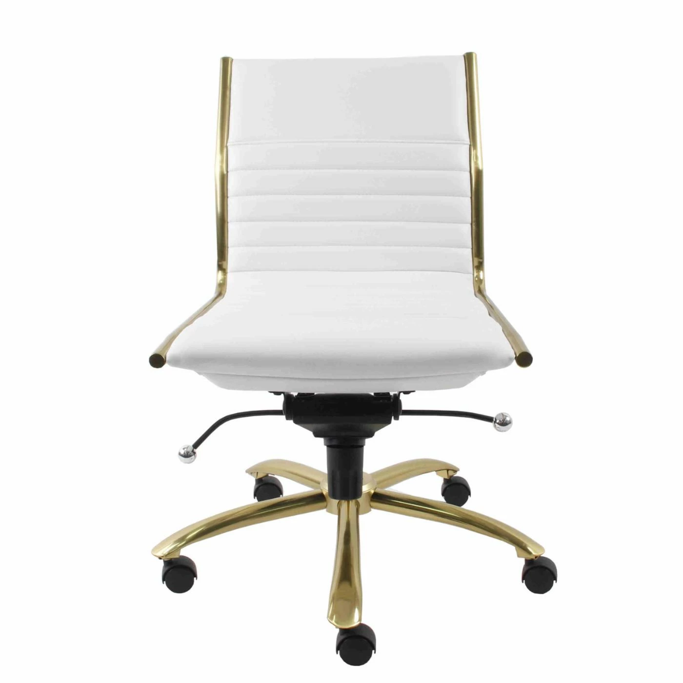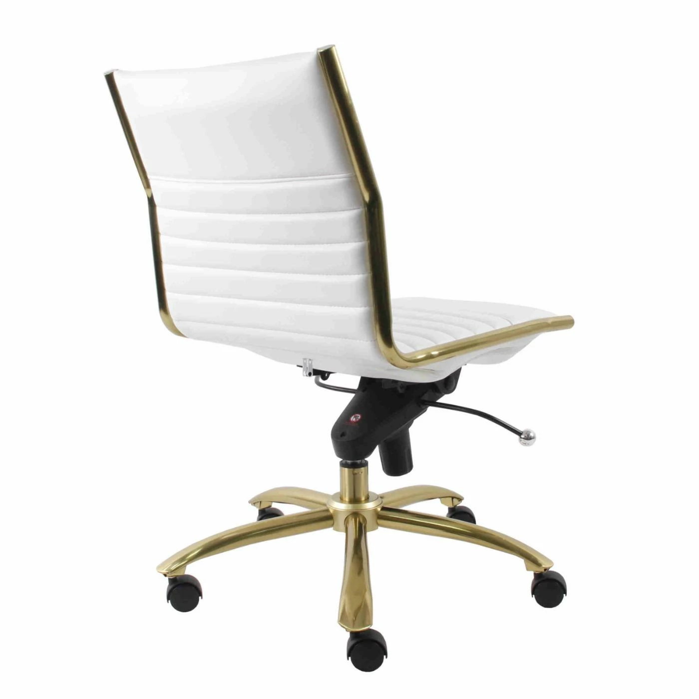Adjust the seat height on the Euro Style Dirk Mid-Back Armless Office Chair to best fit your desk. This office chair features a steel base and frame with a brushed gold finish. The armless seat is made of supportive, flat bungee cords and upholstered with white synthetic leather. The five-star base is equipped with rolling casters for mobility.