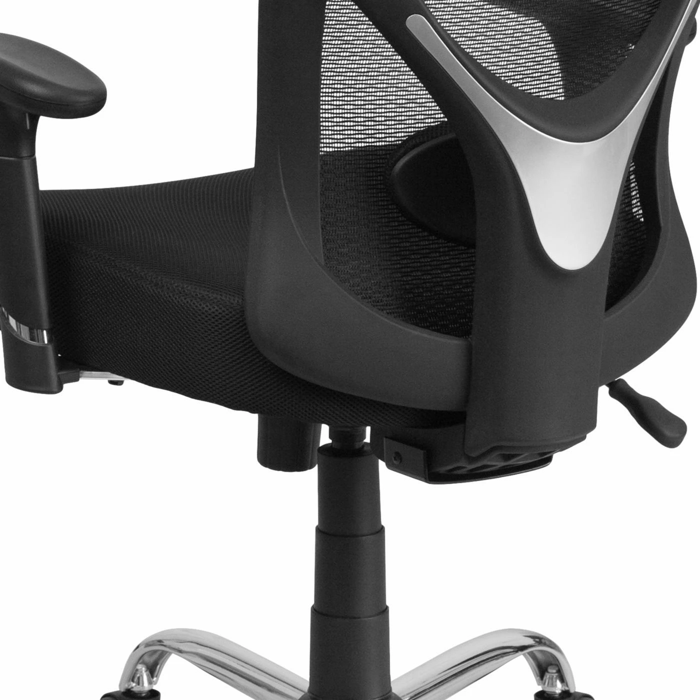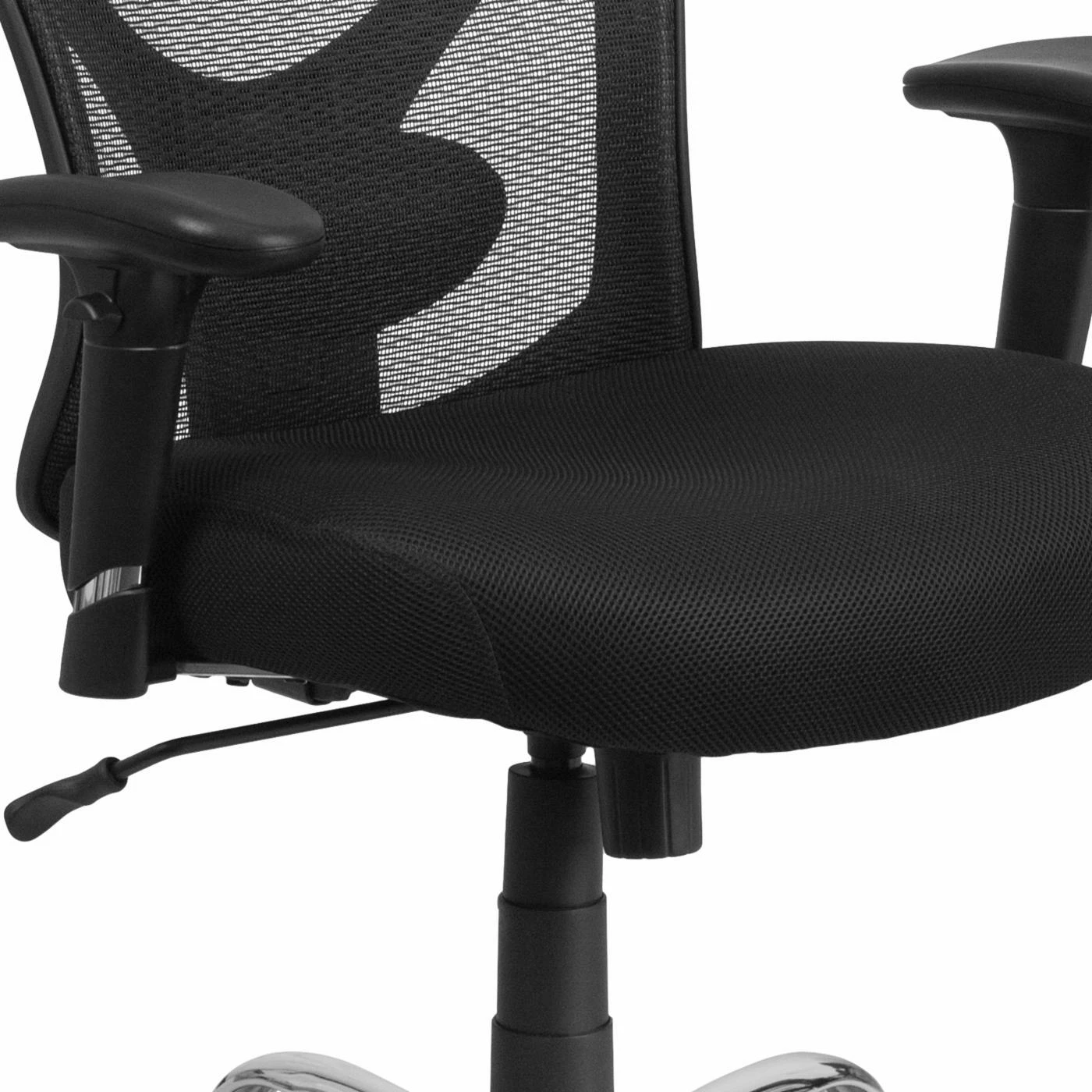 Every day is a comfortable workday when you pair your desk with the Flash Furniture HERCULES Series 400 lb. Capacity Big & Tall Black Mesh Swivel Task Chair with Height Adjustable Back and Arms. This breathable chair features a soft mesh fabric covering the seat and back. The wide seat is enhanced with 2 inches of foam padding for plush softness while the back provides built-in lumbar support. Use the lever and knob to find the ideal tilt, tension, and height for your comfort.