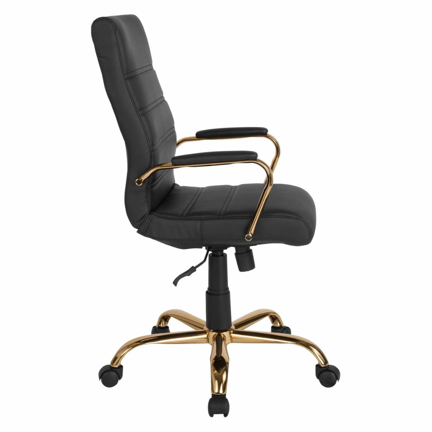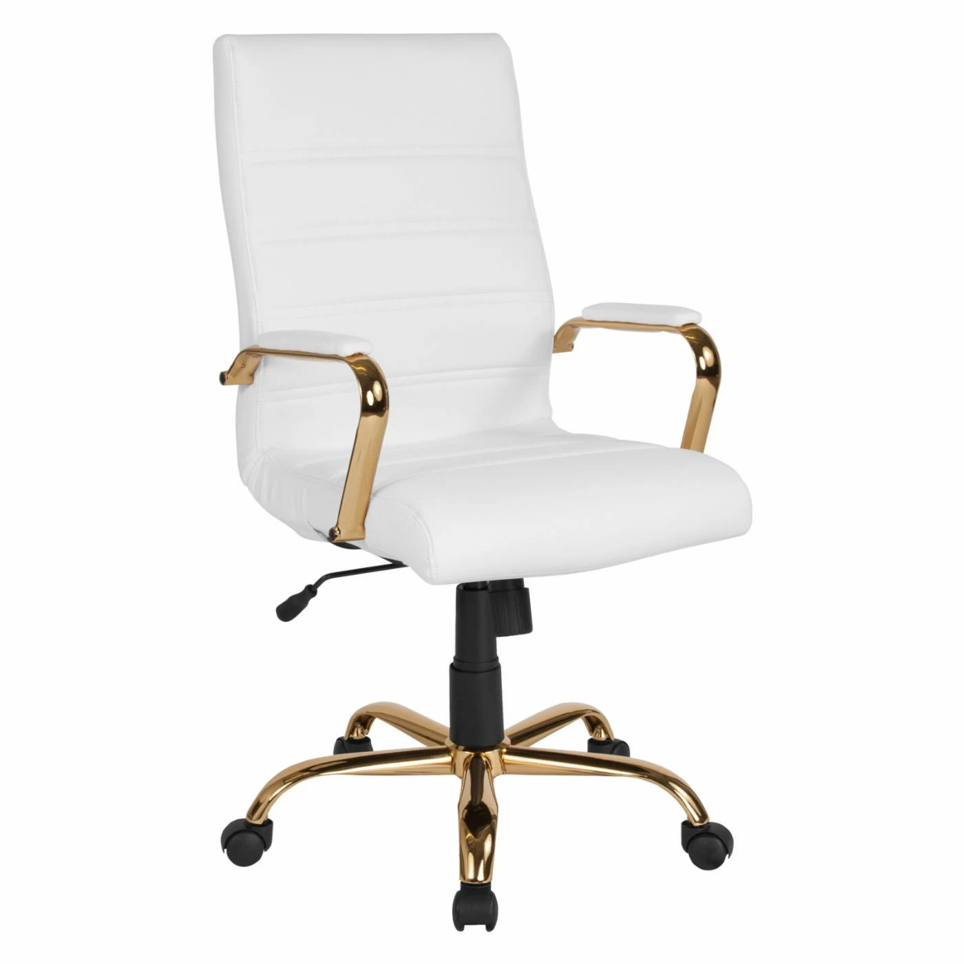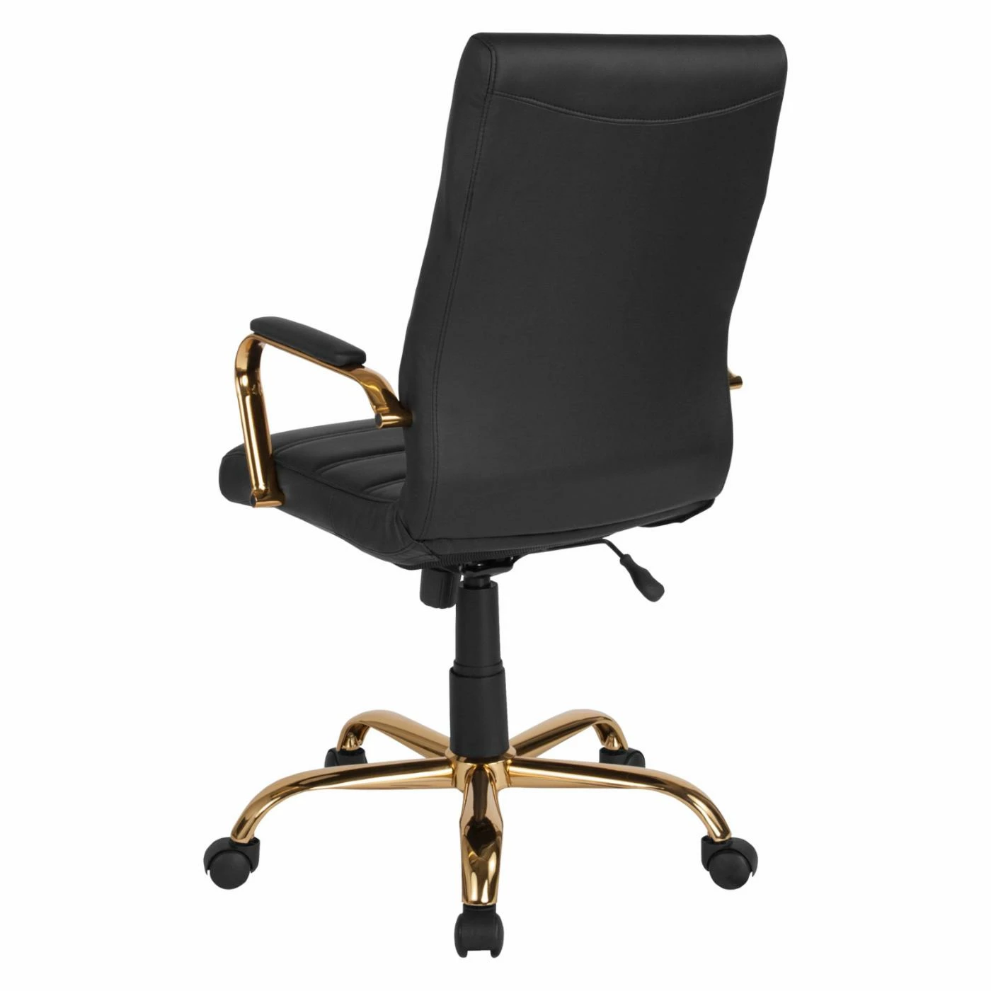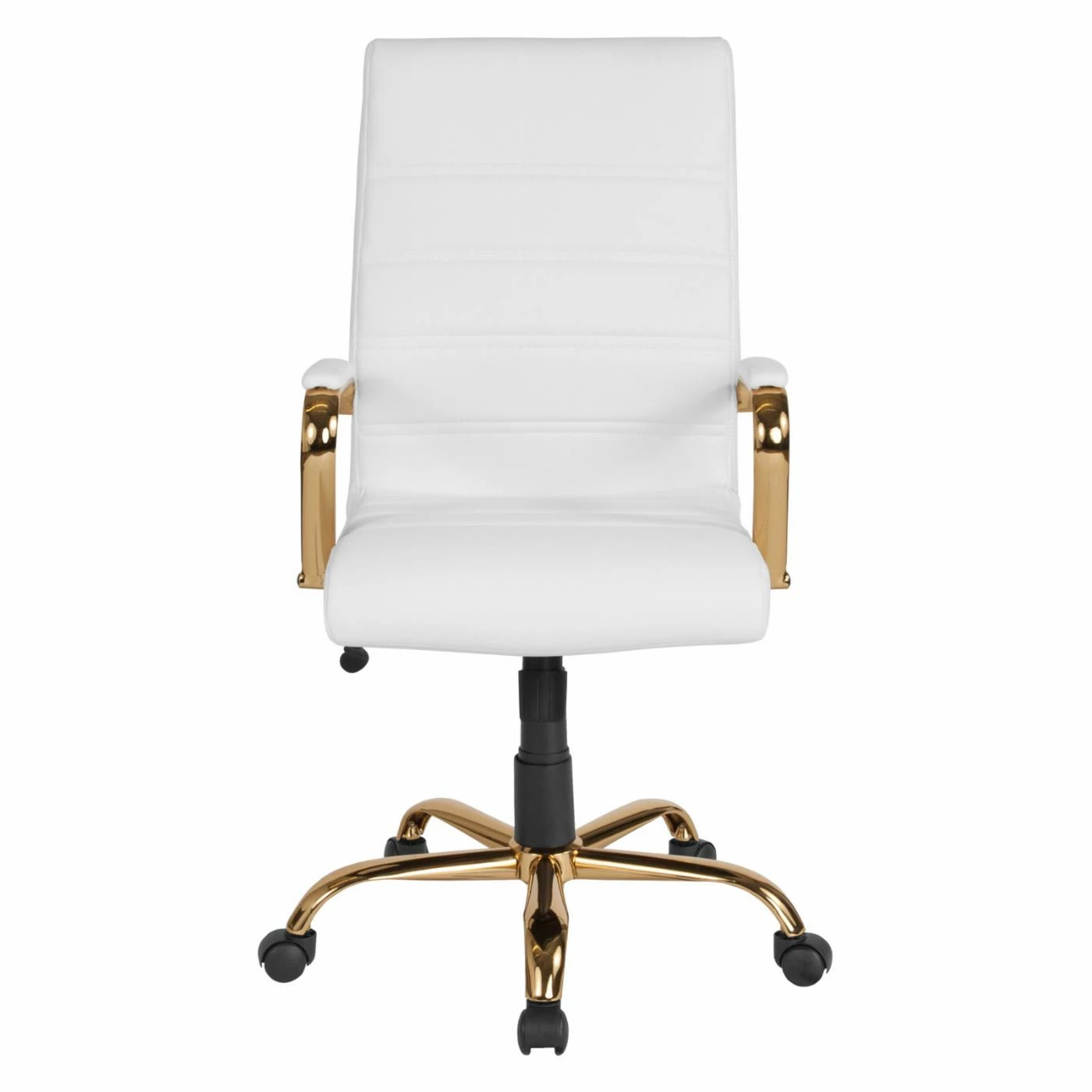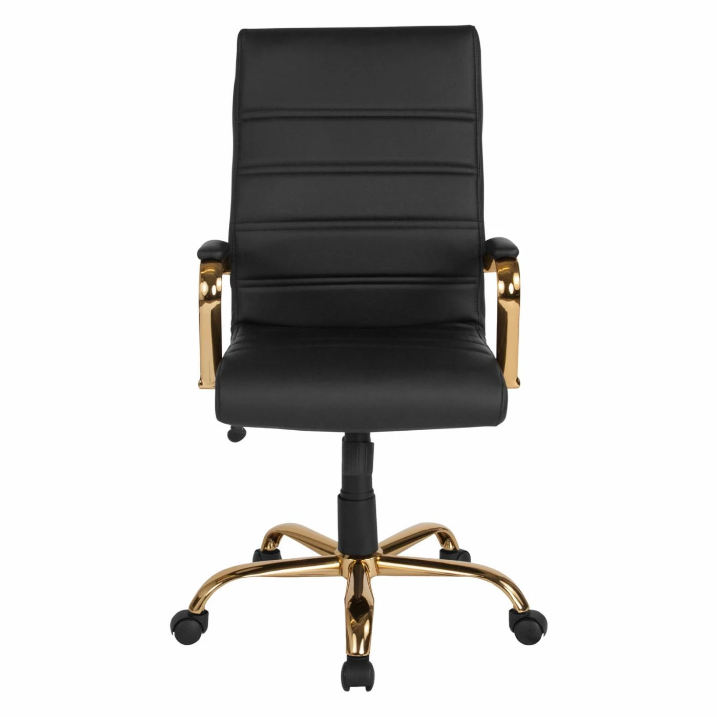 Glamorous meets functional in the Flash Furniture High Back Swivel Armed Executive Desk Chair Featuring a durable metal frame and leather upholstery, this ergonomically designed office chair is built to last. With a height-adjustable frame, lockable wheels, and a swivel feature, this chair is made to keep you comfortable the whole workday long. Choose from available color options to make it yours.