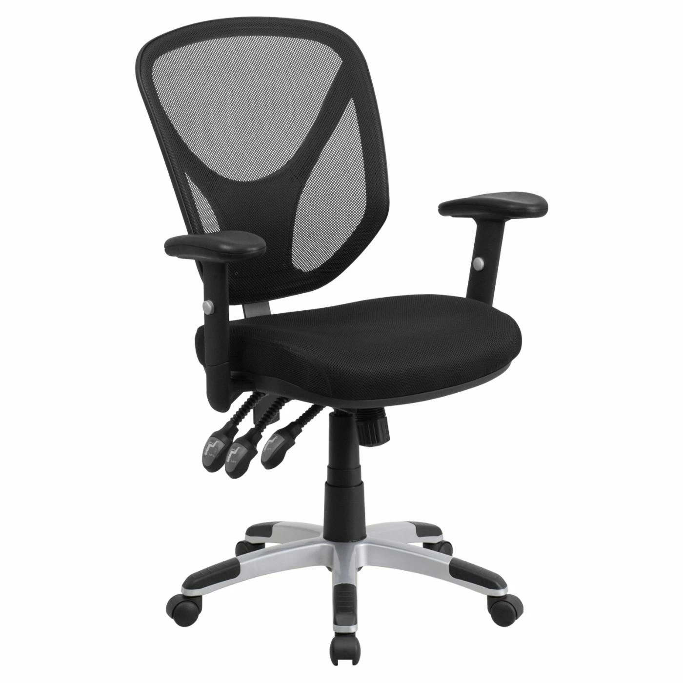 Your office becomes a comfortable place to work when you pair your desk with the Flash Furniture Mid-Back Black Mesh Swivel Task Chair with Triple Paddle Control and Height Adjustable Arms. This swivel chair boasts a fully adjustable design controlled with three padded levers beneath the seat. The mesh fabric promotes breathability while the waterfall seat allows for proper circulation.