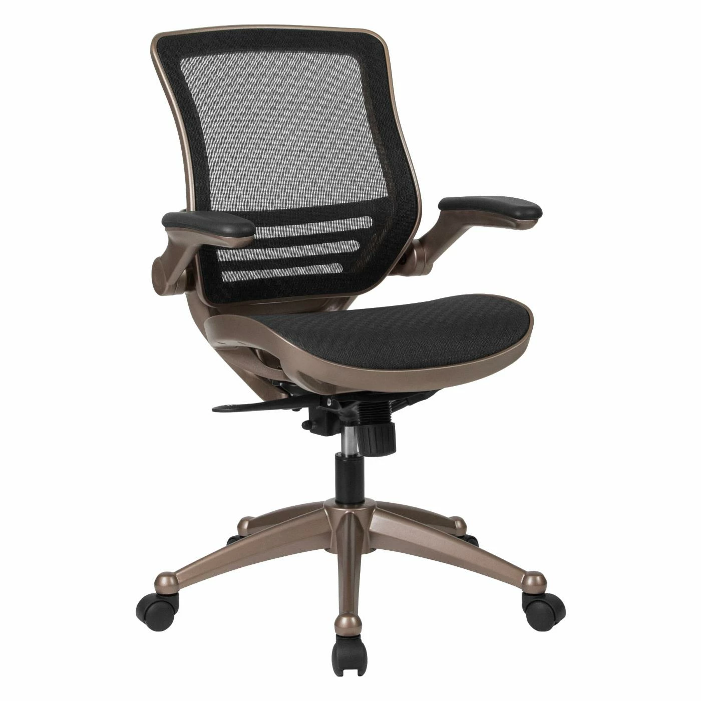 Upgrade your office seating with the Flash Furniture Mid-Back Transparent Black Mesh Executive Swivel Chair. This executive chair is endlessly comfortable for long hours and overtime, featuring a mesh backrest with a contoured shape and a breathable design and a thickly-padded foam seat. The frame is constructed from metal and plastic with a Melrose gold finish and black fabric/mesh accents. The base features smooth-rolling casters and swivels from side to side. The chair adjusts in height as desired.