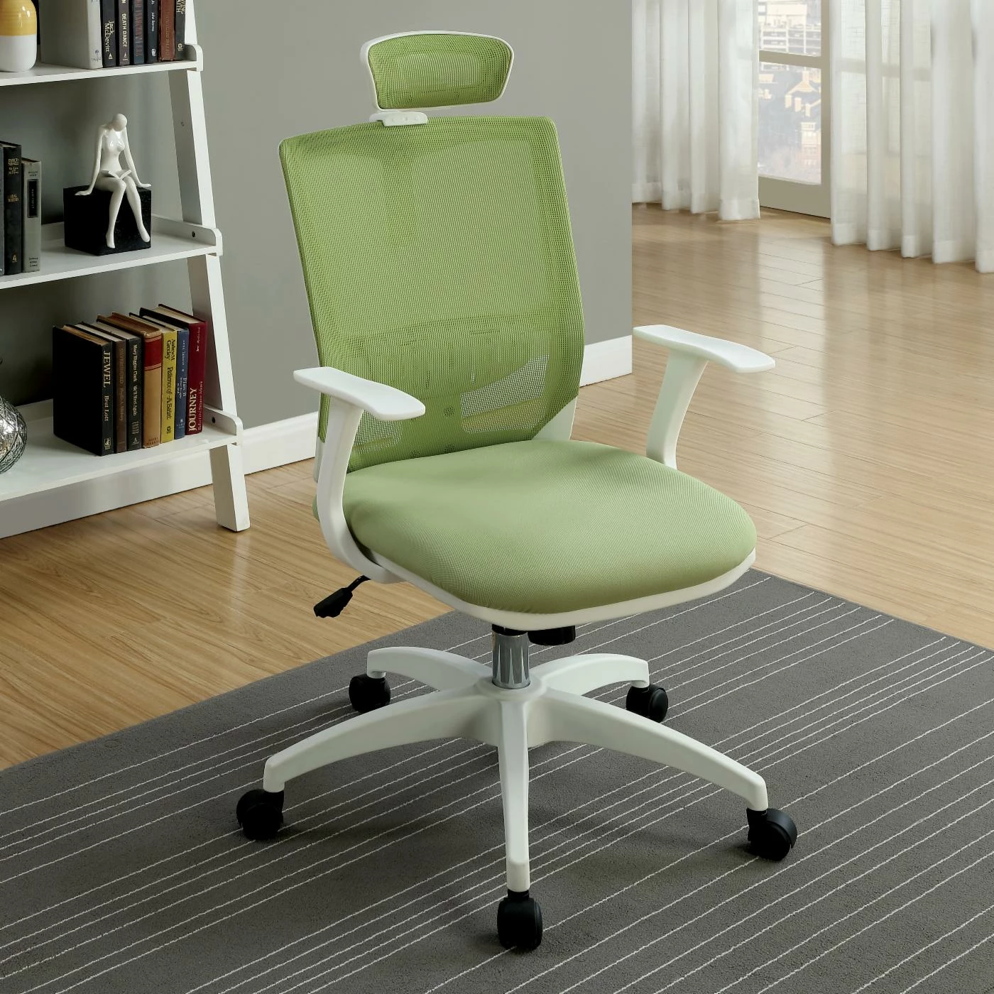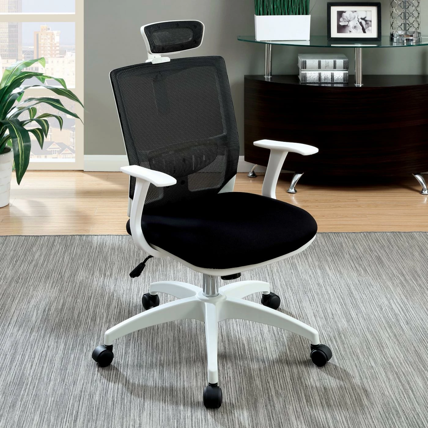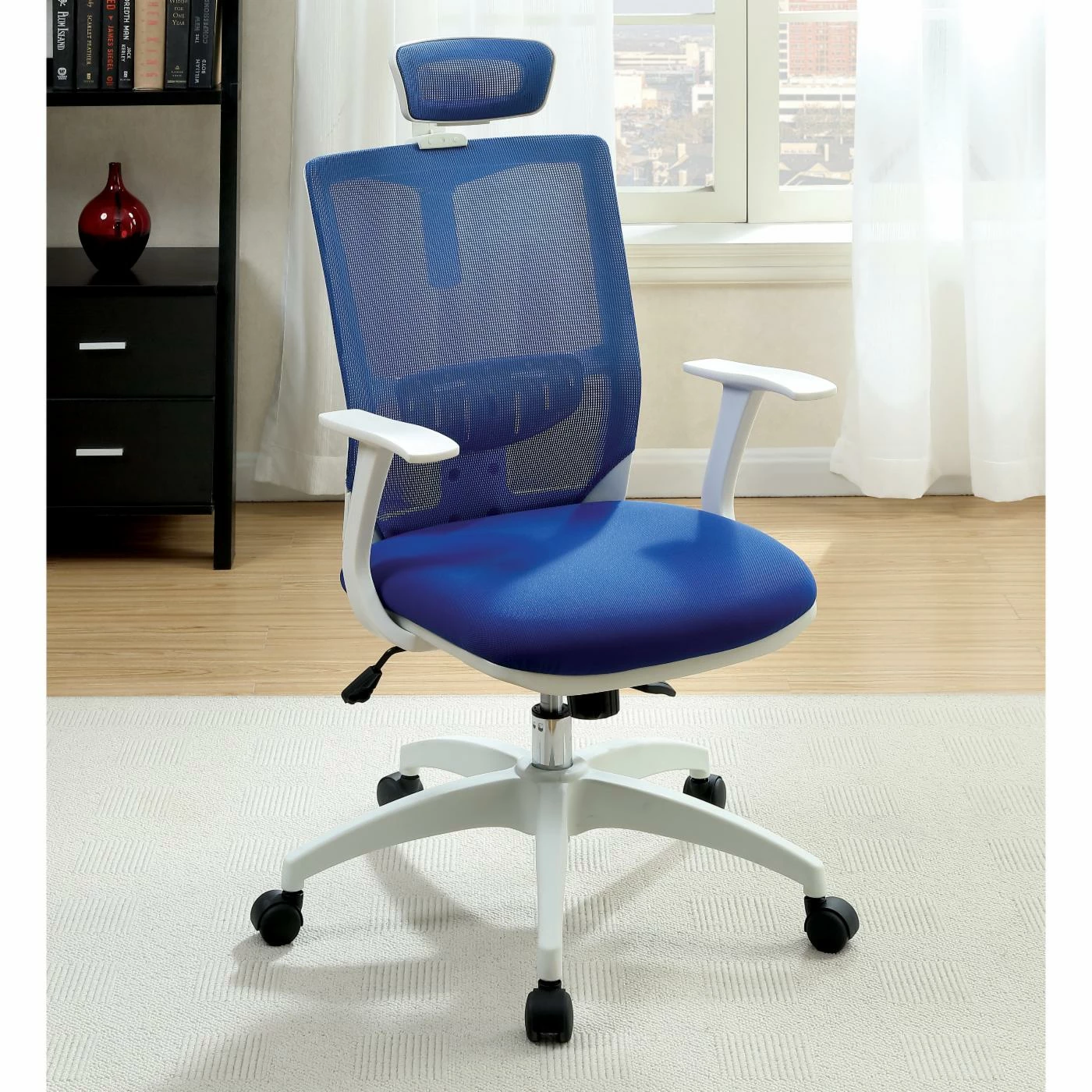 The Furniture of America Velarddi Contemporary Style Mesh Back Rolling Office Chair is modern with colorful, breathable mesh upholstery that curves to fit your form for optimal comfort. This office chair features an adjustable headrest to fit your height and sturdy casters for ease of mobility. The metal frame is extremely durable and made to last, making this chair ideal for students, businesses, and home offices.