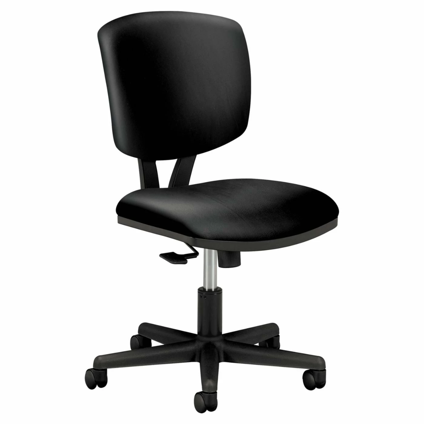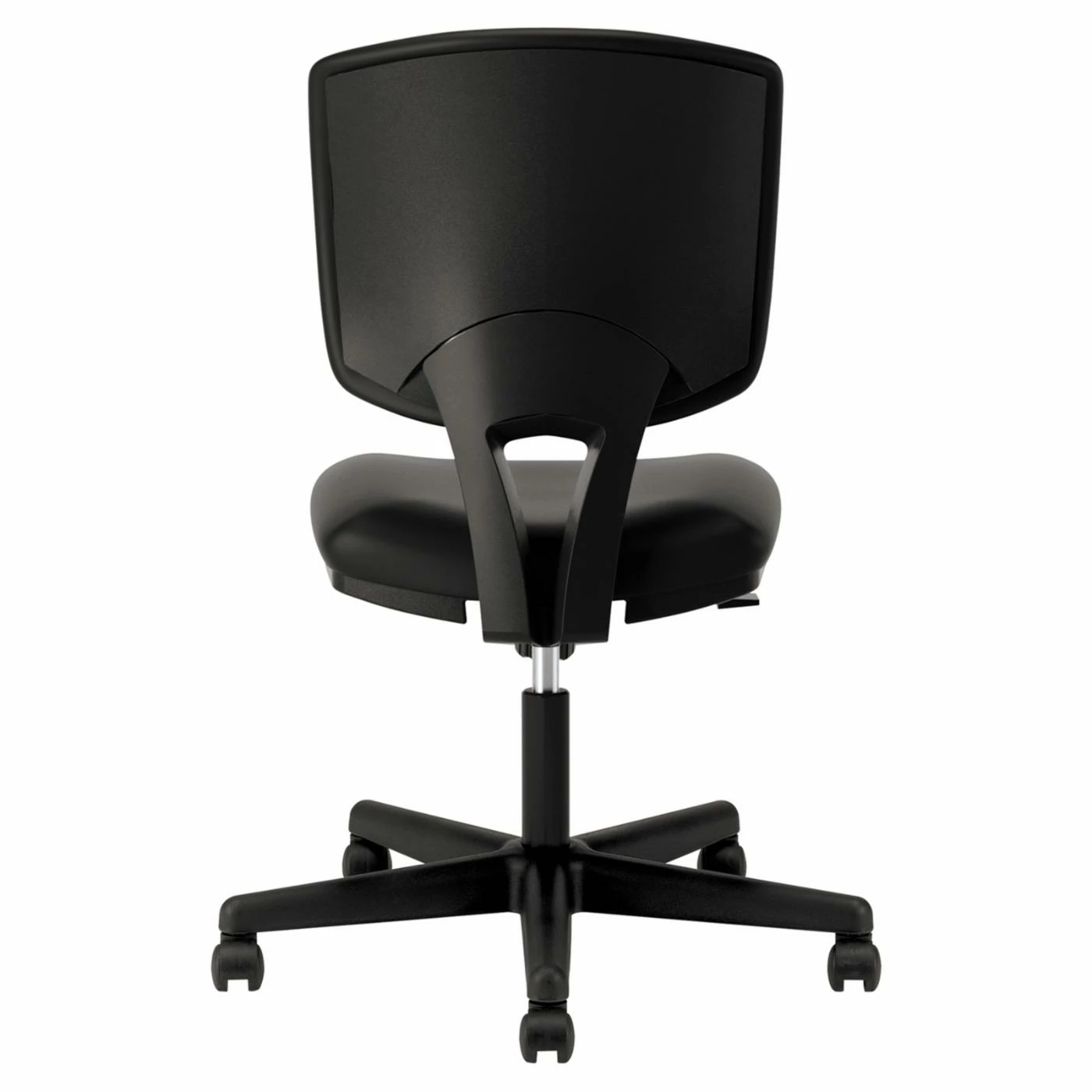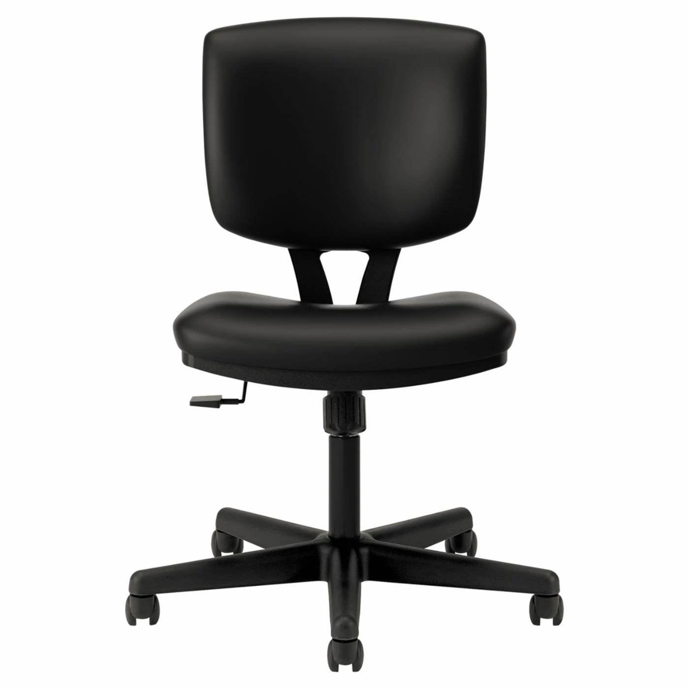 Recline in an instant to relax during your workday with the help of the HON Volt Series Leather Task Chair with Synchro-Tilt – Black. Its synchro-tilt design makes it possible to recline back at a 2-to-1 ratio, so that your feet stay on the floor. Simple to adjust, the chair provides a customized fit and offers support for all-day comfort with its extra wide, amply padded seat and back cushions. Neutral black leather upholstery allows the chair to look at home in any office. The design is completed by a black, plastic five-star base that rolls on casters.