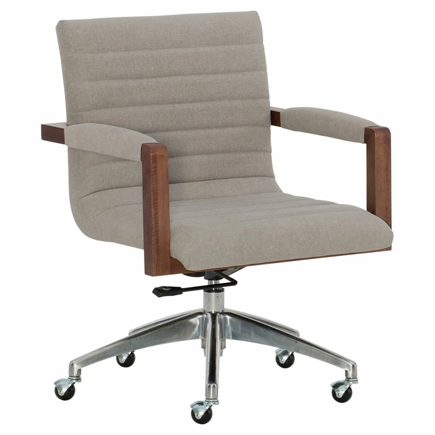 Pair the Hooker Furniture Elon Upholstered Swivel Desk Chair with a walnut-finished desk to complete your office space. This desk chair is supported by a 5-point chrome base with rolling casters. The seat is constructed of rubberwood and upholstered with beige fabric. The seat and backrest are accented with channel stitching. A pneumatic gas lift allows you to adjust the height to best fit your desk. This chair is part of the Elon Collection of office furniture. Add other pieces to your workspace for a coordinated look.