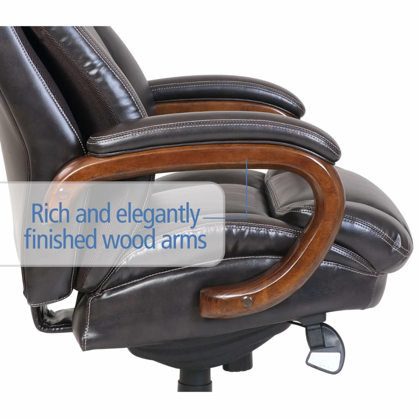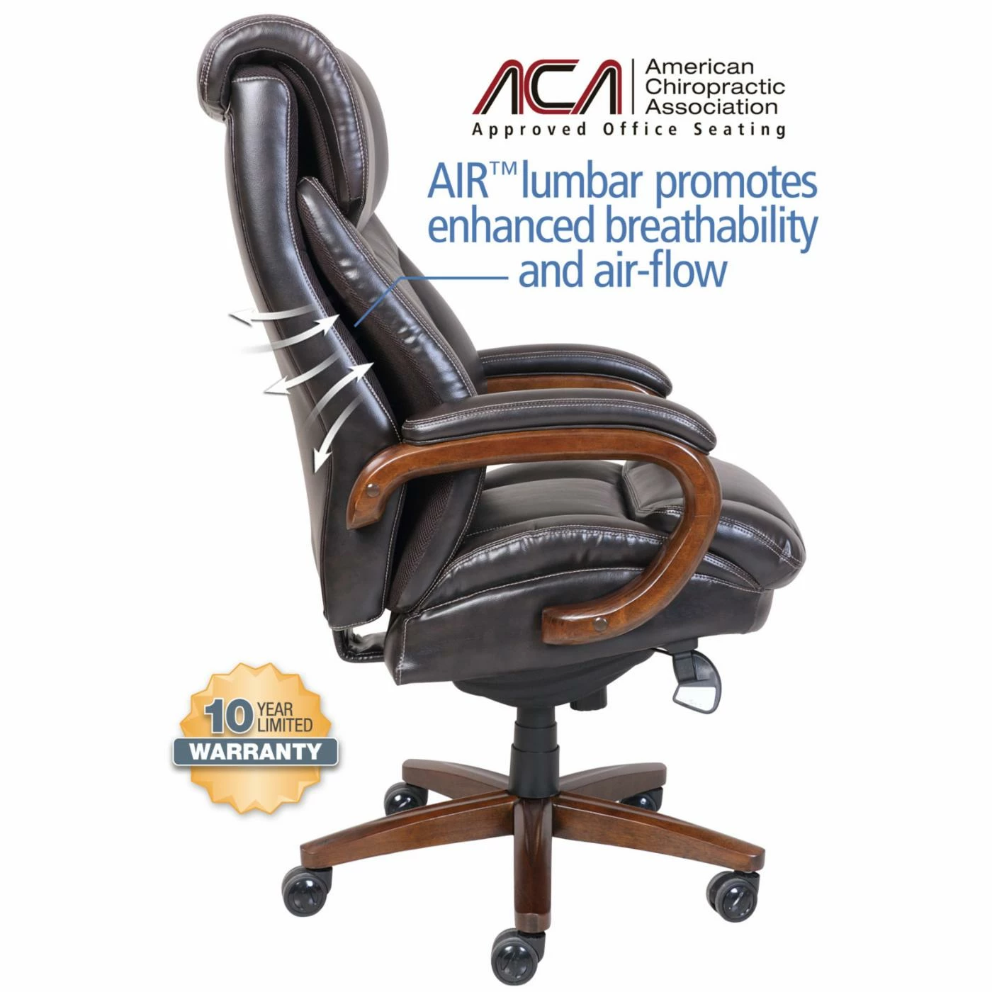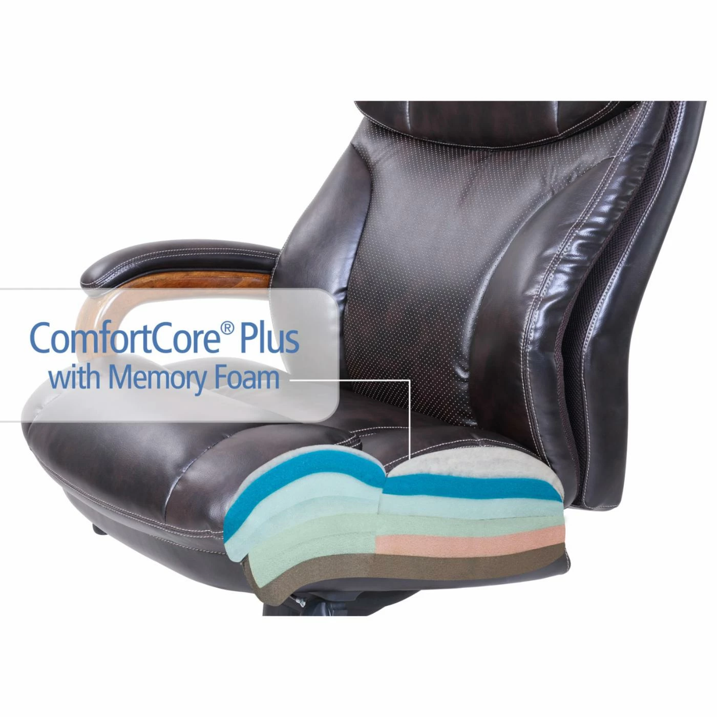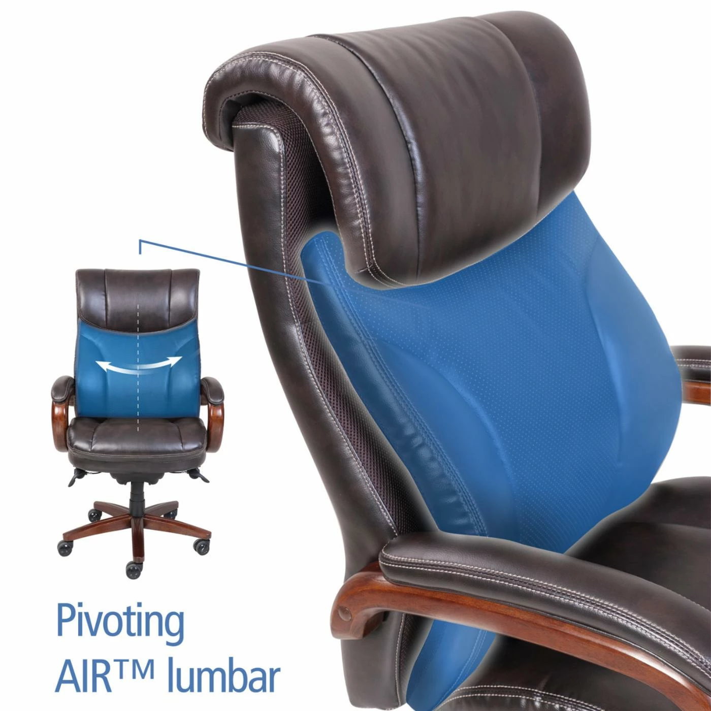 The La-Z-Boy Trafford Big and Tall Executive Office Chair – Vino provides the support you need, all with a big and tall design. The AIR lumbar technology features a pivoting back that conforms to provide the best in support. The waterfall seat helps promote leg circulation, while the ComfortCore Plus memory foam center is covered in Vino Brown bonded leather upholstery. The wooden arms and base are finished in a rich walnut tone, and this office chair can support up to 400 pounds. Approved by the American Chiropractic Association.