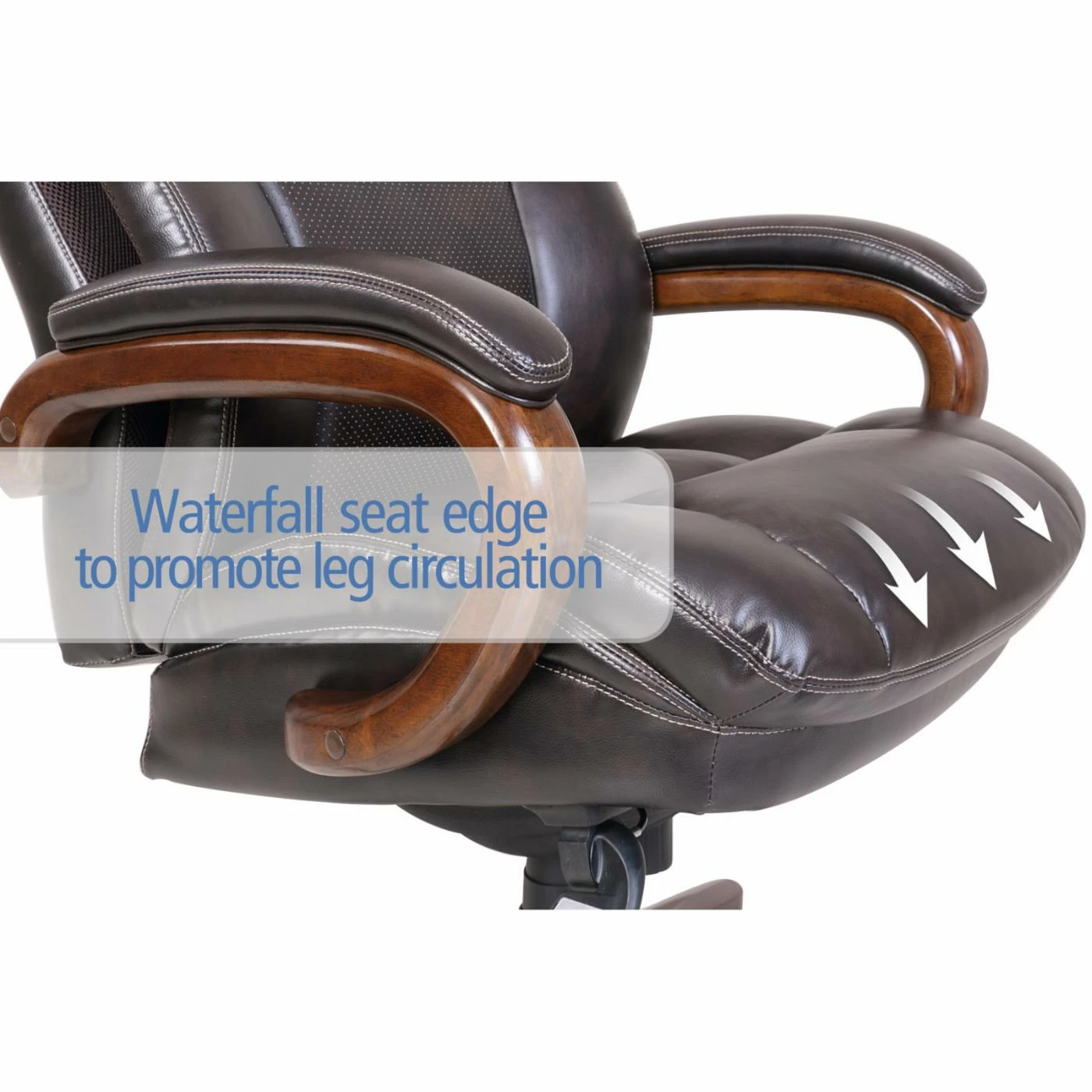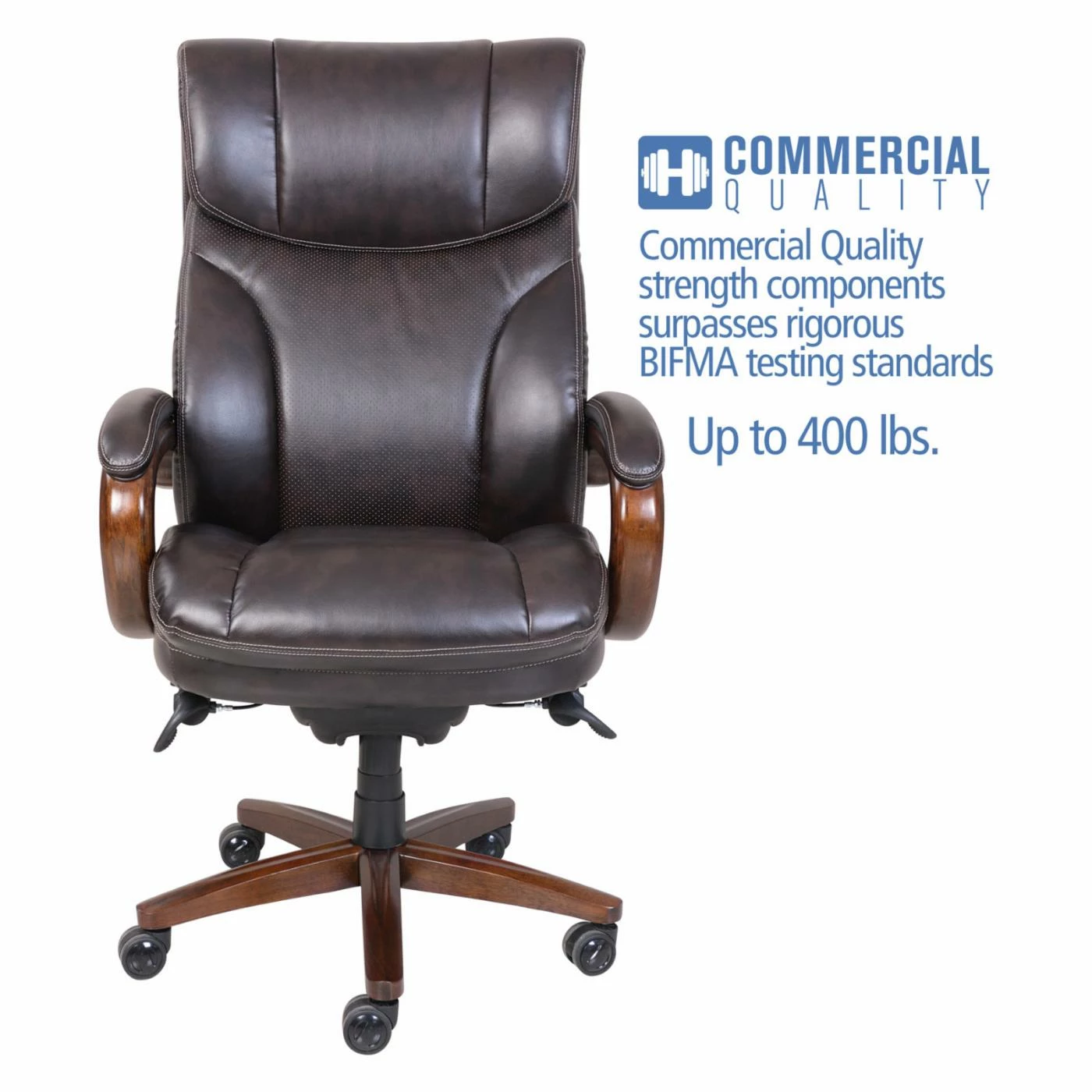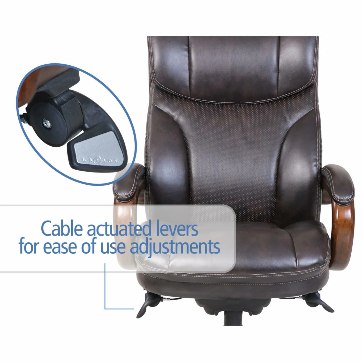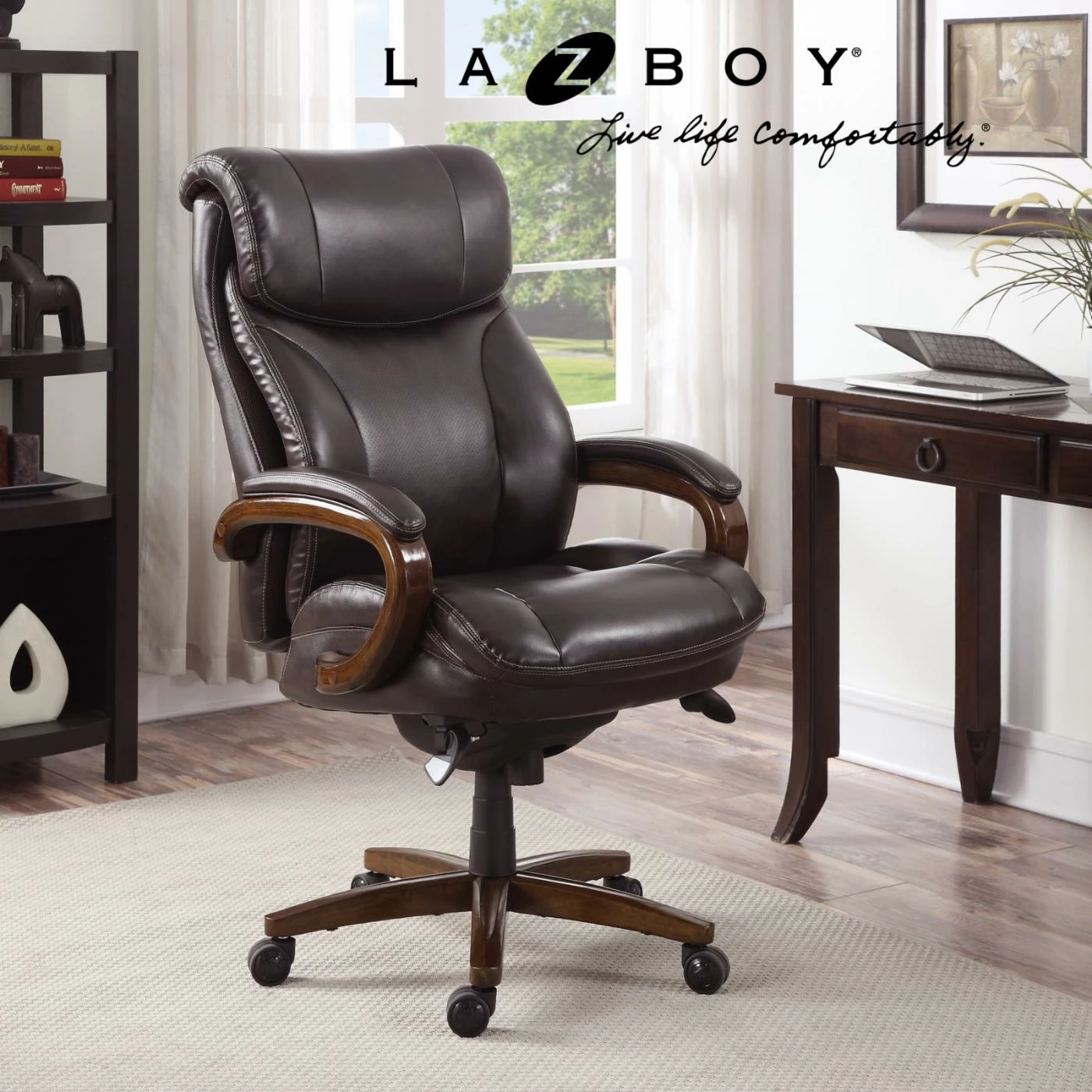 The La-Z-Boy Trafford Big and Tall Executive Office Chair – Vino provides the support you need, all with a big and tall design. The AIR lumbar technology features a pivoting back that conforms to provide the best in support. The waterfall seat helps promote leg circulation, while the ComfortCore Plus memory foam center is covered in Vino Brown bonded leather upholstery. The wooden arms and base are finished in a rich walnut tone, and this office chair can support up to 400 pounds. Approved by the American Chiropractic Association.