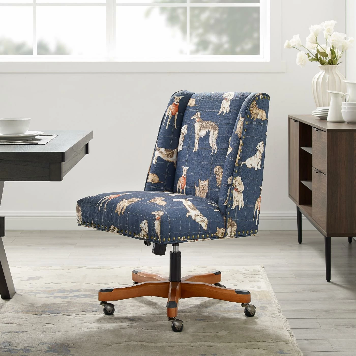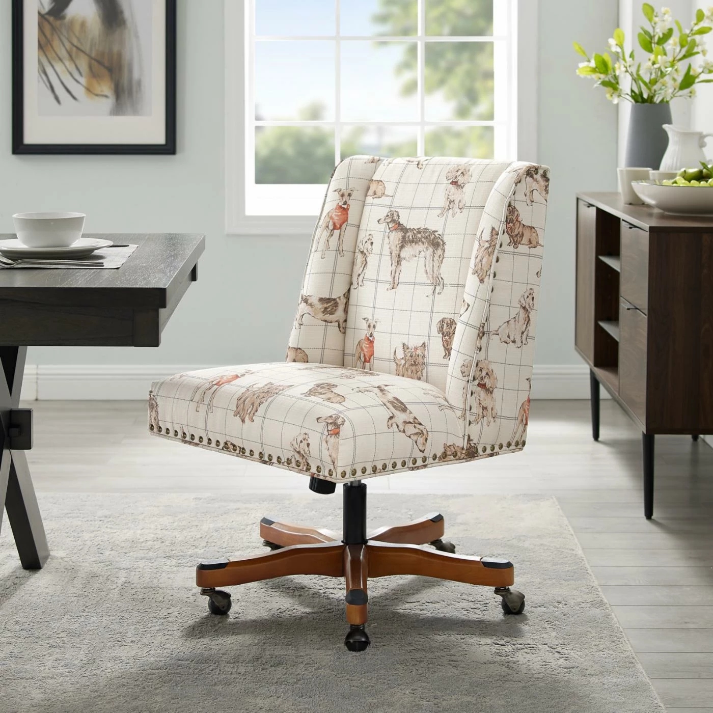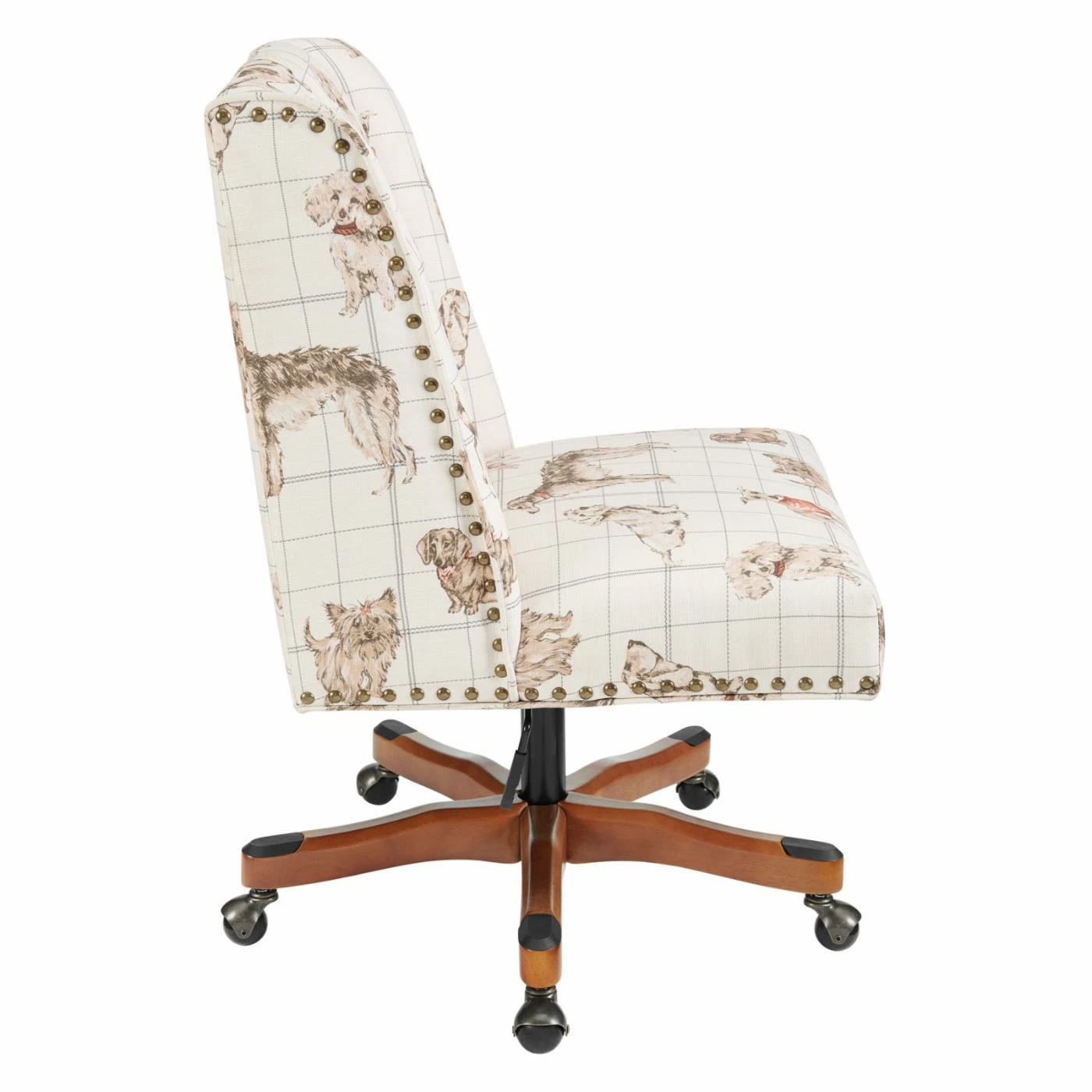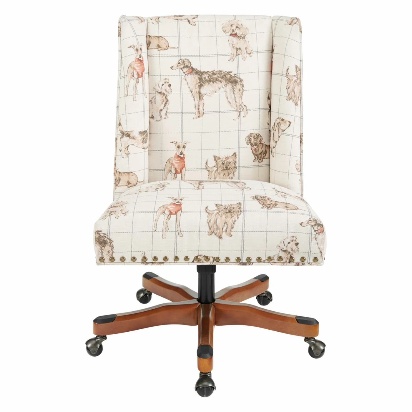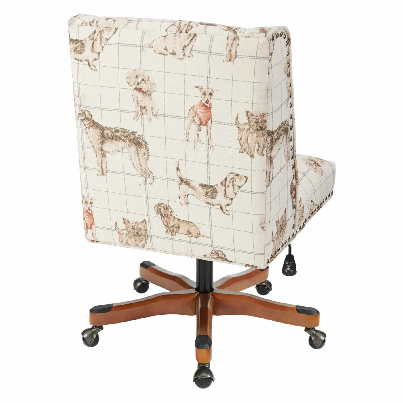 A dog lovers dream, add style and function to your office with the LinonΒ Draper Dog Office Task ChairΒ which is available in a variety of colors. The soft, plush frame features simple, modern lines upholstered in a whimsical dog design with stone background fabric with antique bronze nail heads.Β A walnut wood base is set upon durable wheel casters for easy maneuverability.Β An adjustable seat height ensures this chair works for a variety of table heights. Bring your love of dogs a home workspace or an added touch of style at the office.Β