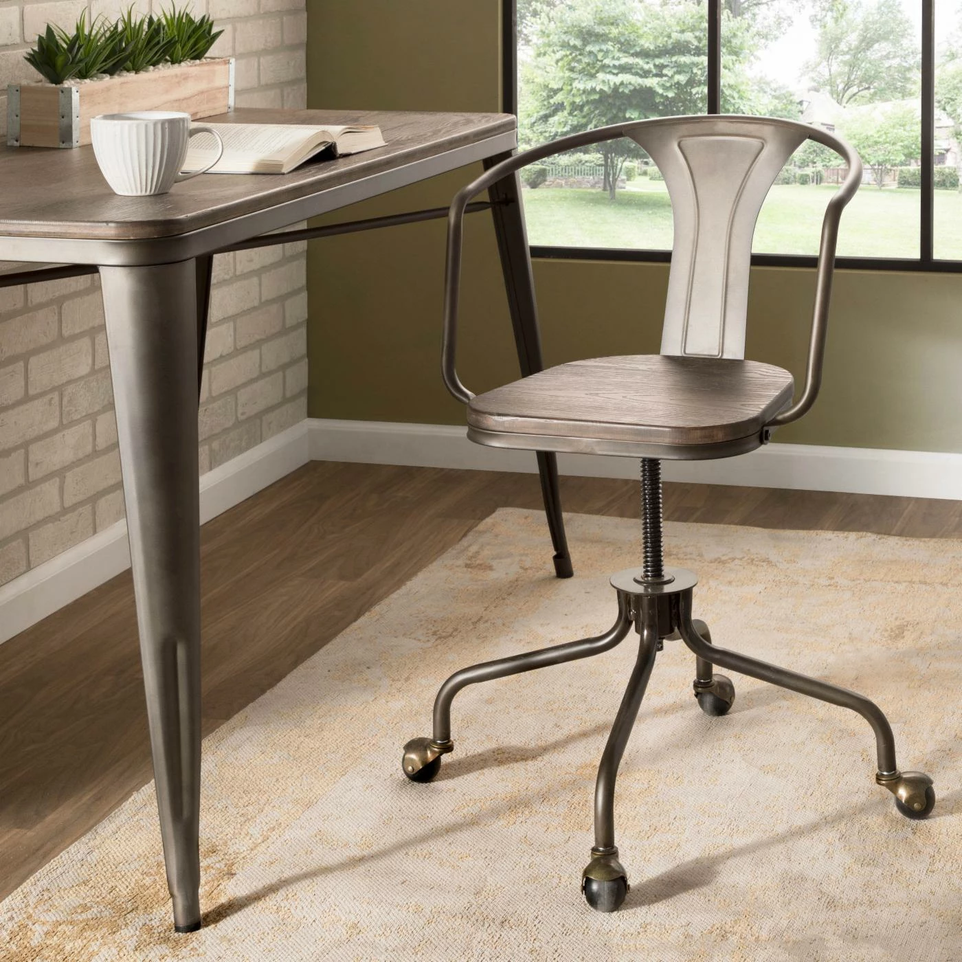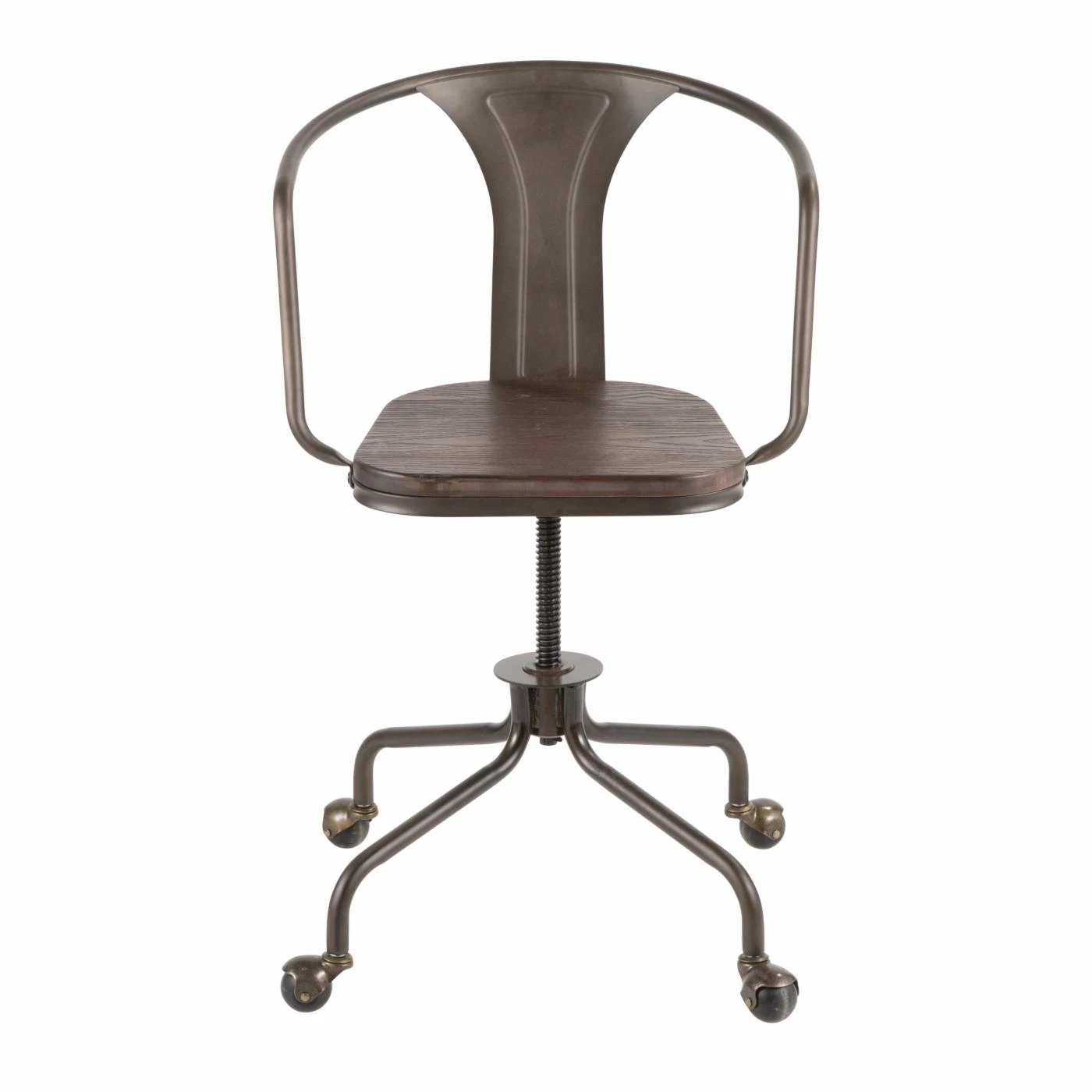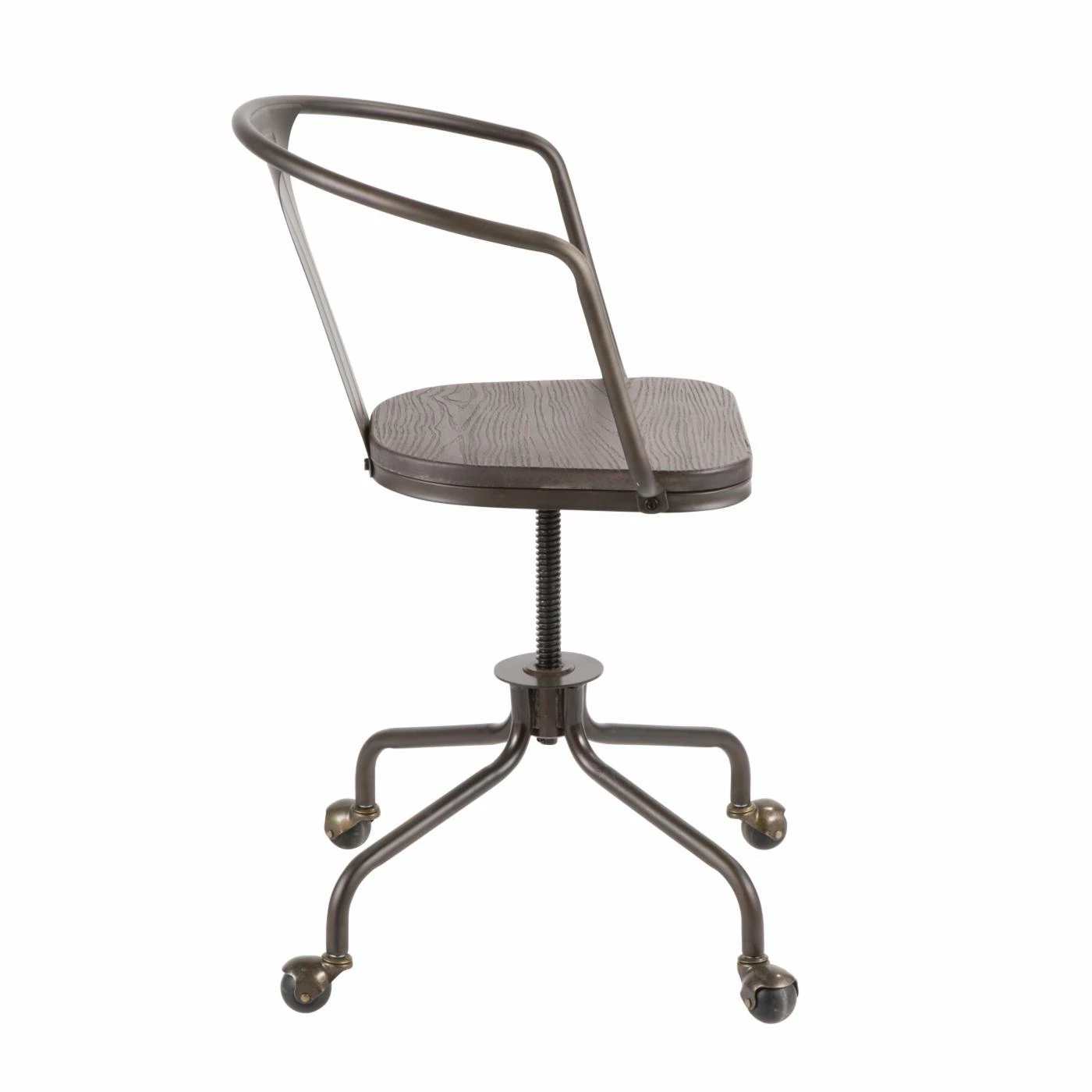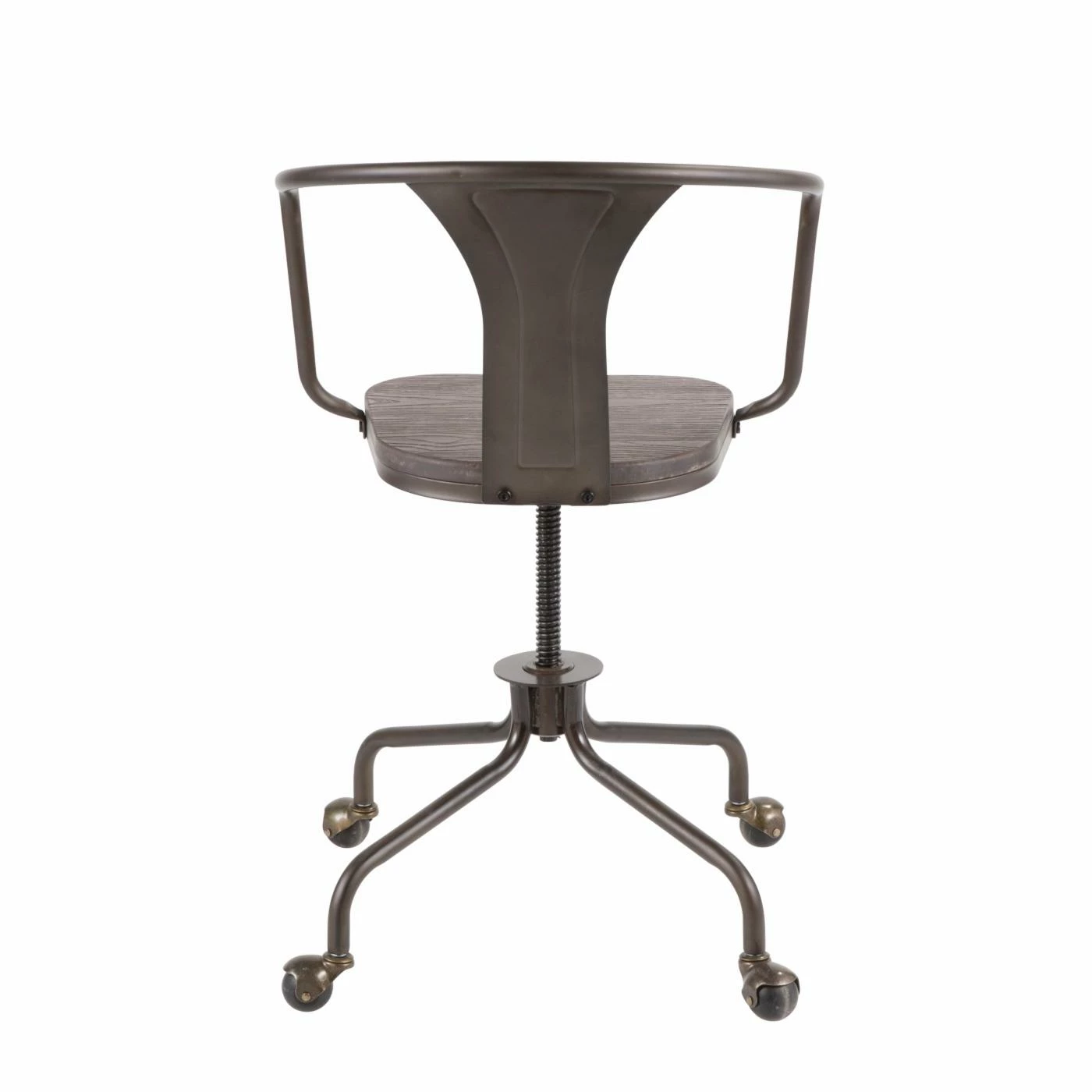 Industrial meets rustic style with the LumiSource Oregon Adjustable Task Chair. This chair features a distinct, distressed metal frame. It is complemented with a natural wood seat. The height of the chair adjusts to find the most comfortable working position. The chair rolls conveniently on four casters and moves easily with a 360 degree swivel. The chair supports weights up to 250 pounds. Bring a farmhouse look to your home or office with this charming office chair.