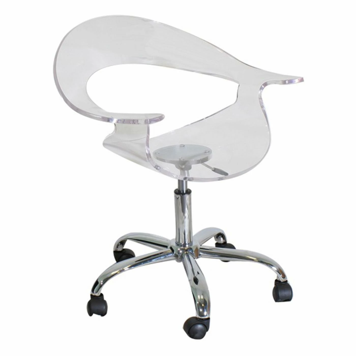 The talk is true about the LumiSource Rumor Office Chair – Clear, it really does combine style and functionality. With sleek cuts and contours, this acrylic chair will make a statement in your home. It has a modern flair that is reflected in stylish details like the chrome-finished pole and base. It features a 360ยฐ swivel motion, caster wheels for mobility, and an adjustable hydraulic pole for varying seating heights. With a shape that cradles the body in comfort, it’s a wonderful addition to your home office.