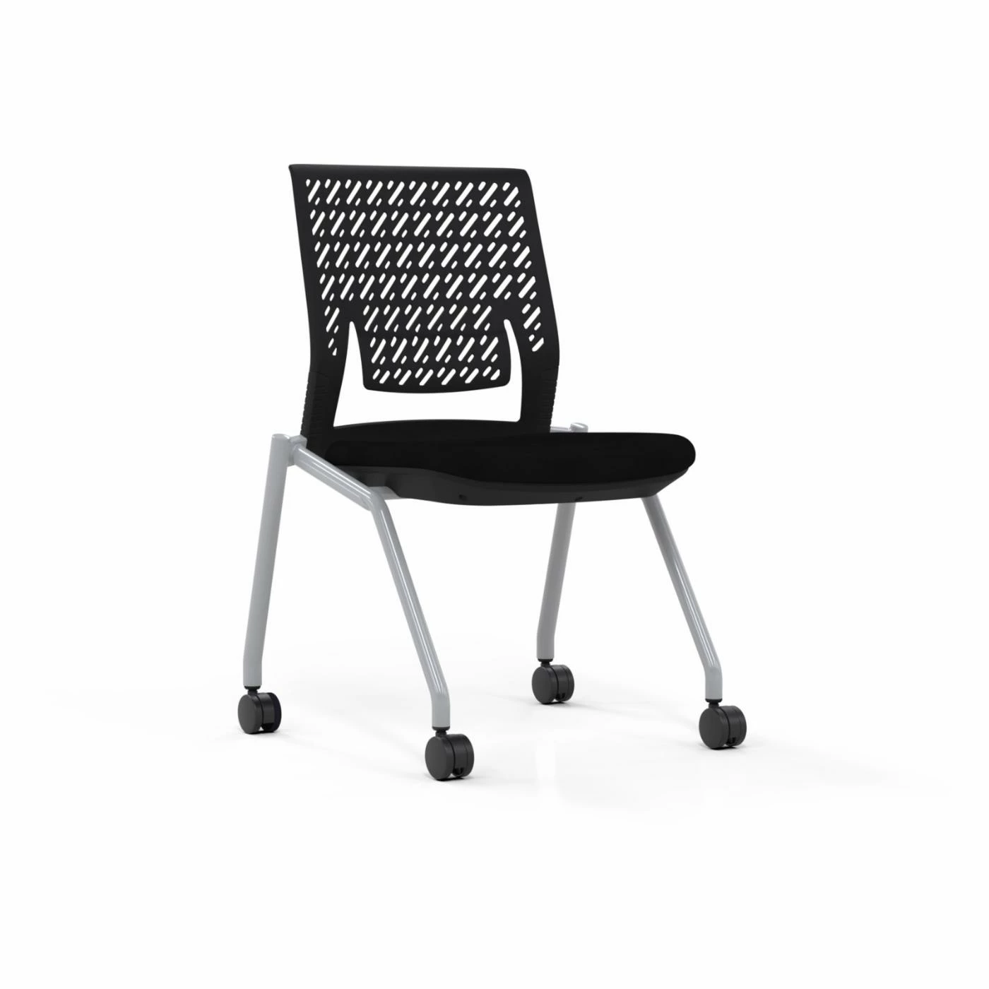 Enjoy the comfort and style of the Mayline Thesis Armless Training Chair. Relax with high quality lumber support from the cushioned black upholstered seat, while the black poly backrest features a gentle recline. A gray metal frame supports the chair and boasts four soft casters for easy mobility. When you’re done using this finely designed chair, simply lift up the seat and stack up to four chairs for storage.
